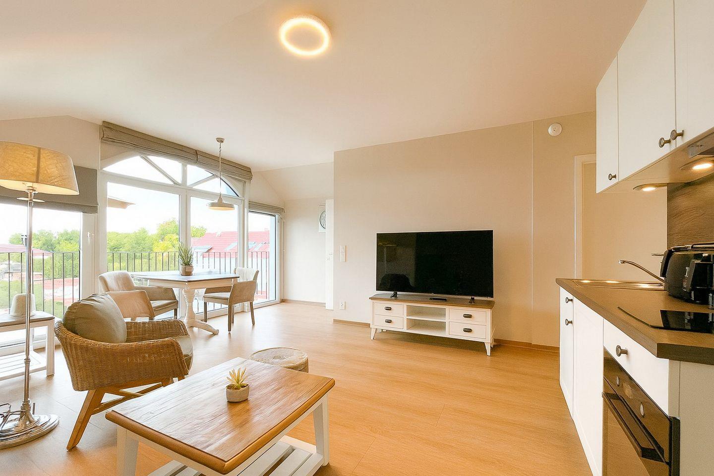 Der helle Wohnbereich lädt mit einem bequemen Sofa und einem Flachbild-TV zu entspannten Stunden ein. Der angrenzende Essbereich für zwei Personen ist harmonisch in das Raumkonzept eingebunden und schafft eine angenehme Wohnatmosphäre.