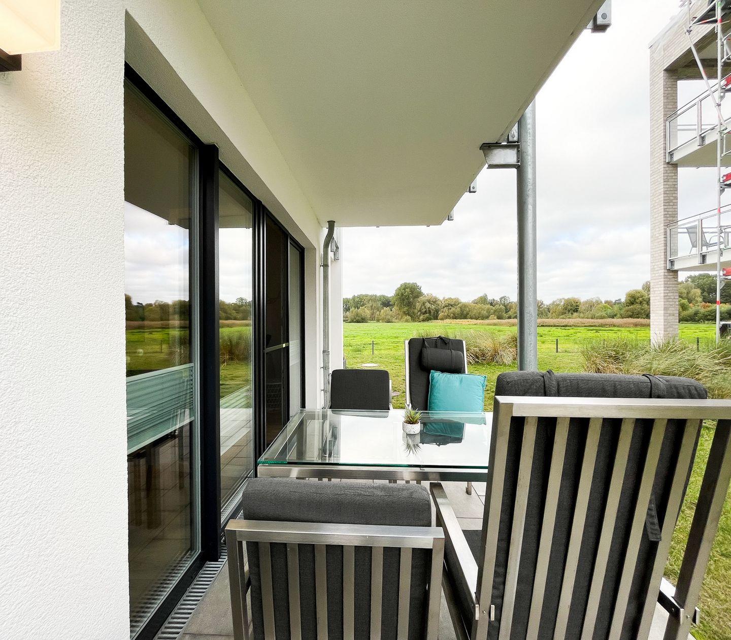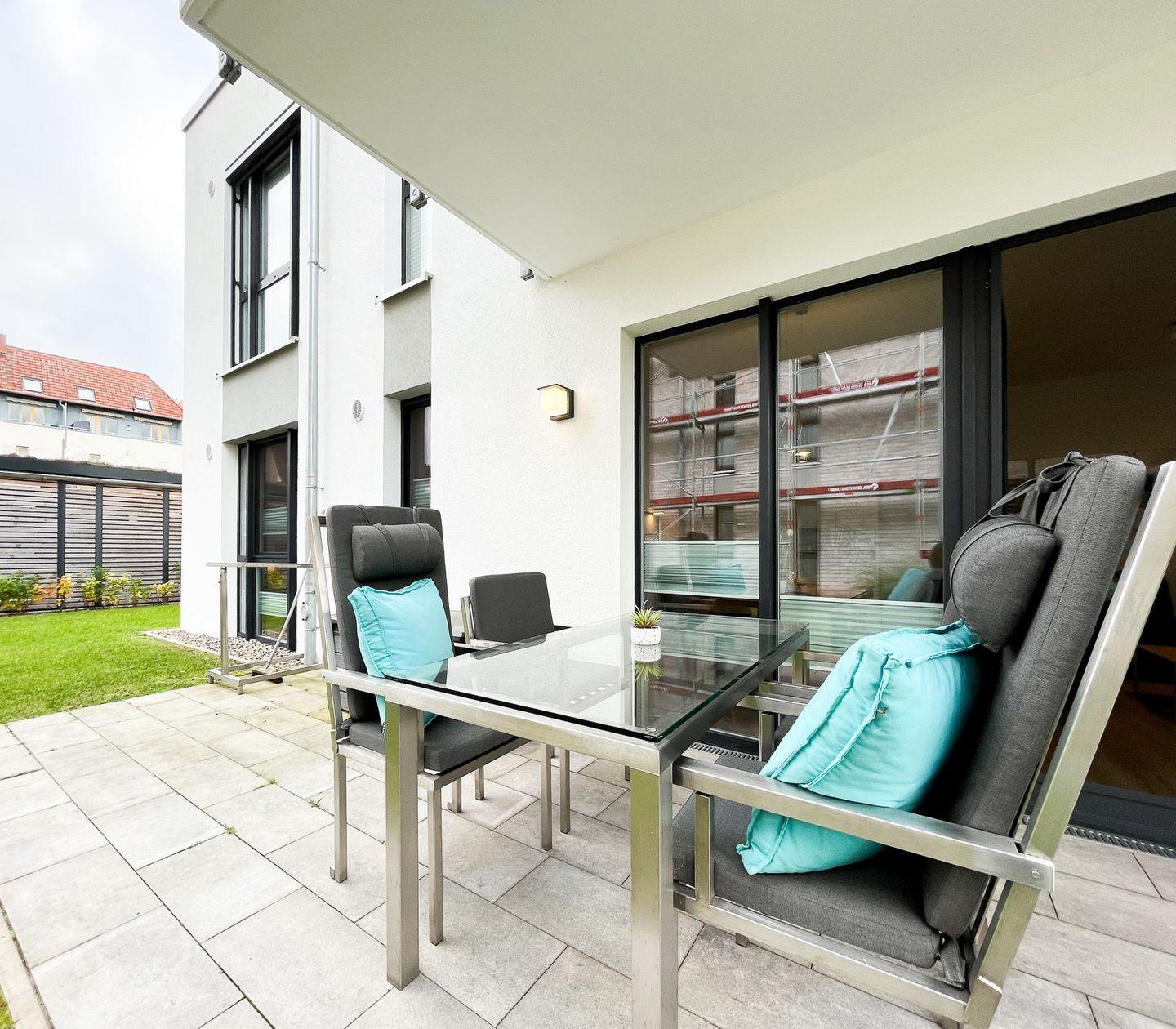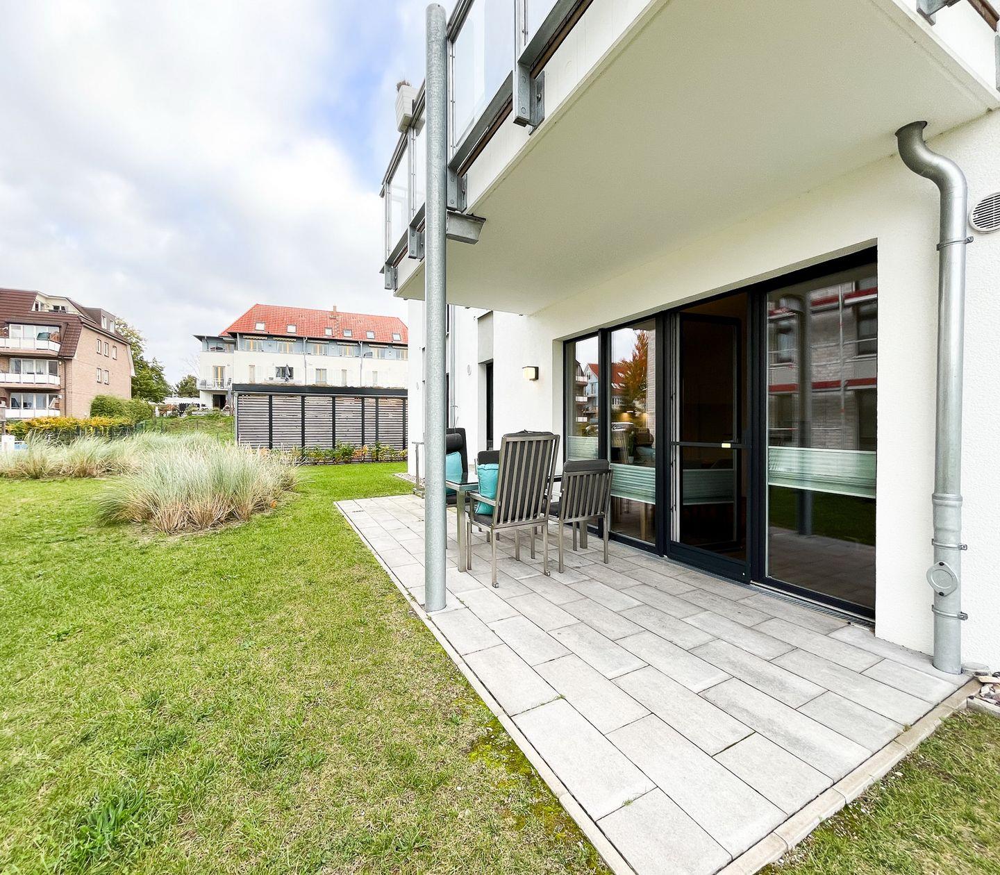 Ein weiteres Highlight ist die großzügige Terrasse, die mit Gartenmöbeln bestückt ist und einen schönen Blick ins Grüne bietet. Hier kannst Du entspannte Stunden verbringen oder gemeinsame Mahlzeiten genießen. Der gepflegte Außenbereich der Ferienanlage umfasst einen Spielplatz und einen Sandkasten, wodurch die Wohnung besonders kinderfreundlich ist. Ein Kinderhochstuhl steht für die kleinen Gäste bereit.