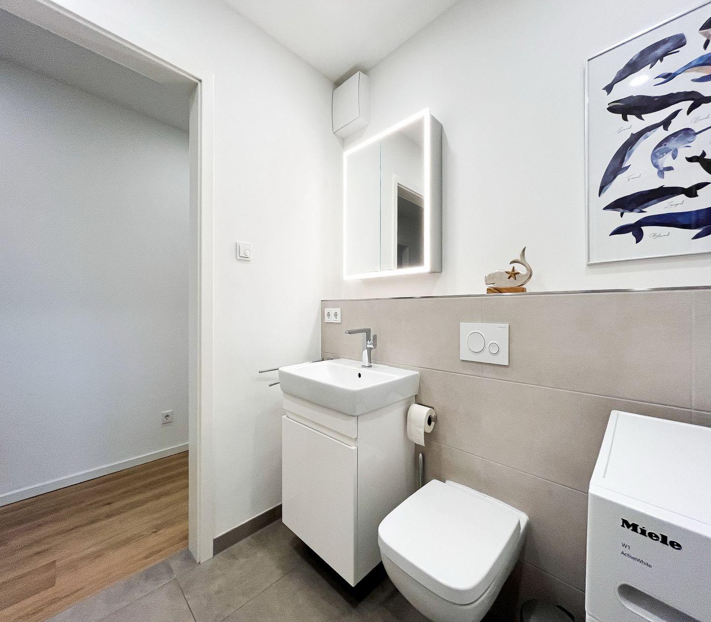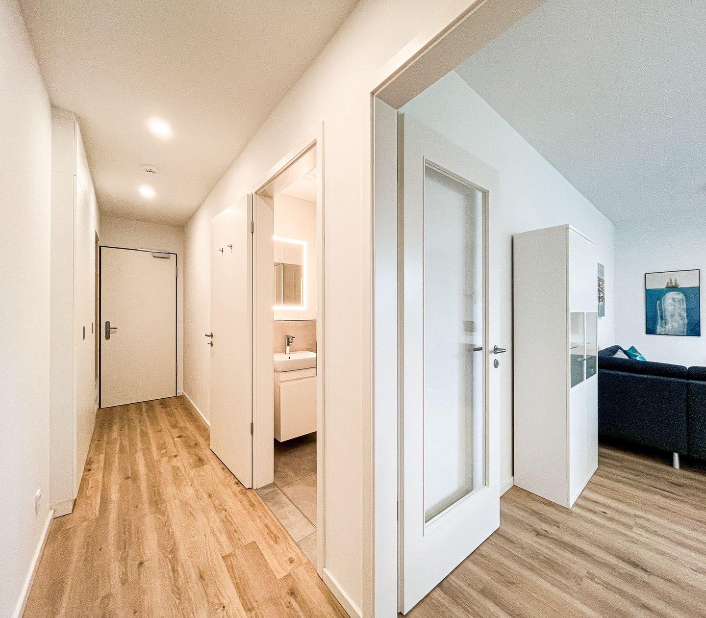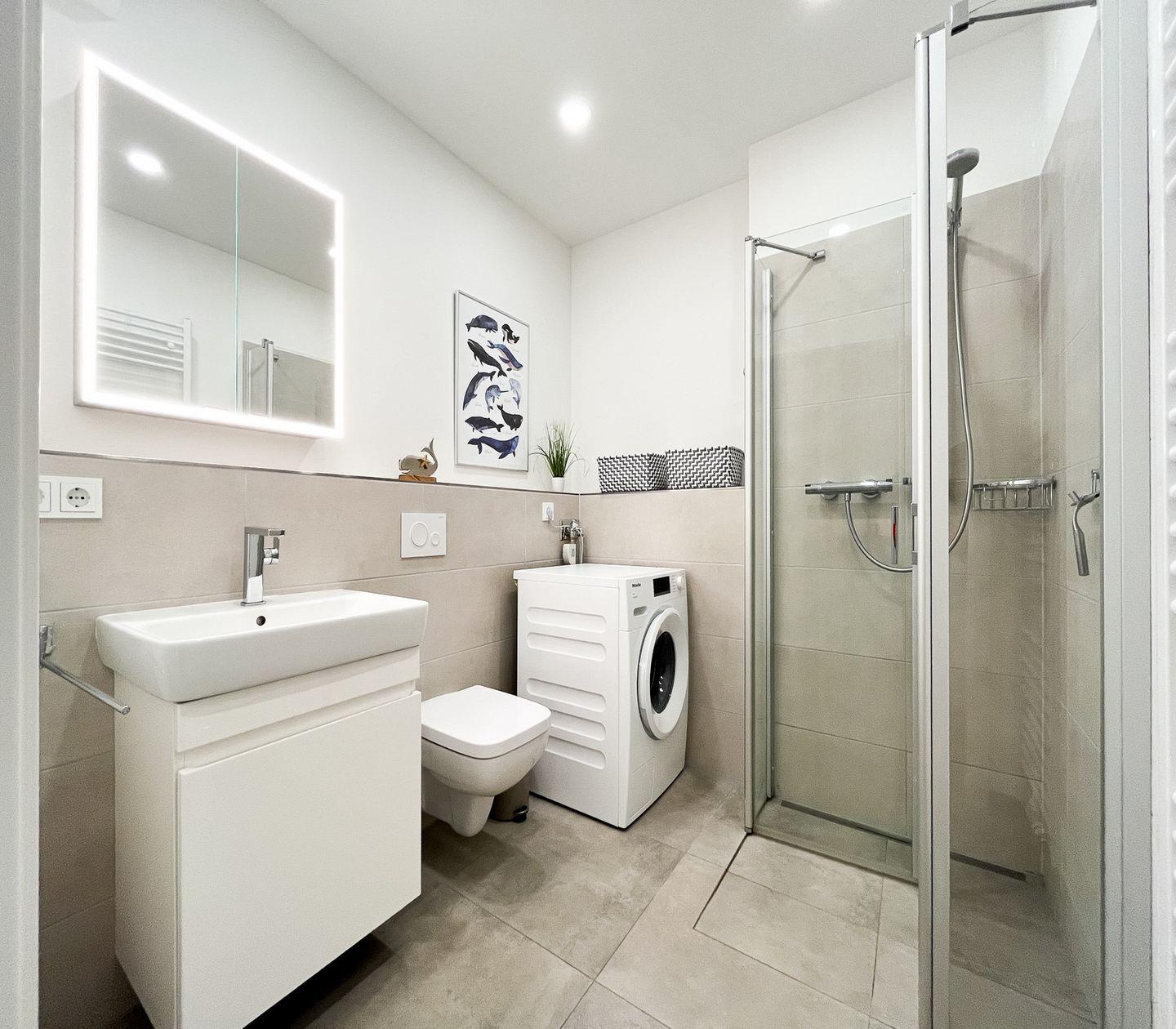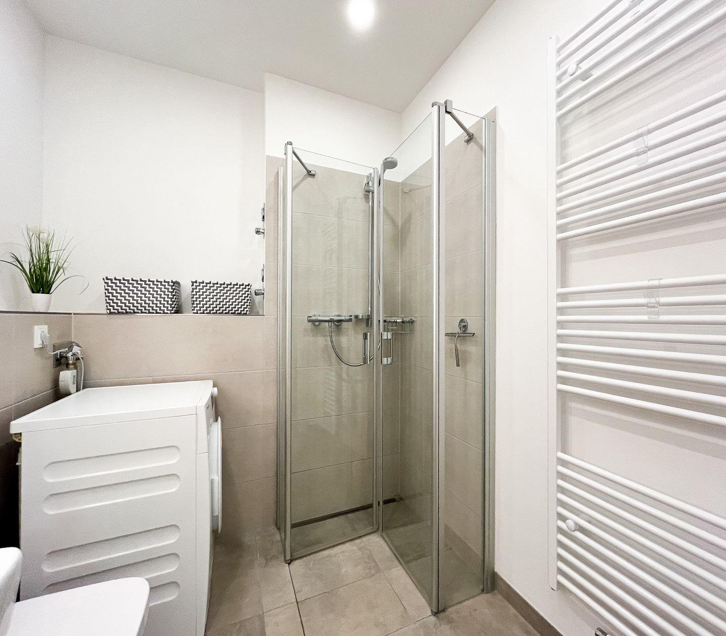 Das Badezimmer ist mit einer bodengleichen Dusche, WC, Waschbecken, Spiegel und Haartrockner ausgestattet. Es steht Dir zudem eine Erstausstattung zur Verfügung, um Dir einen angenehmen Start in den Aufenthalt zu ermöglichen.