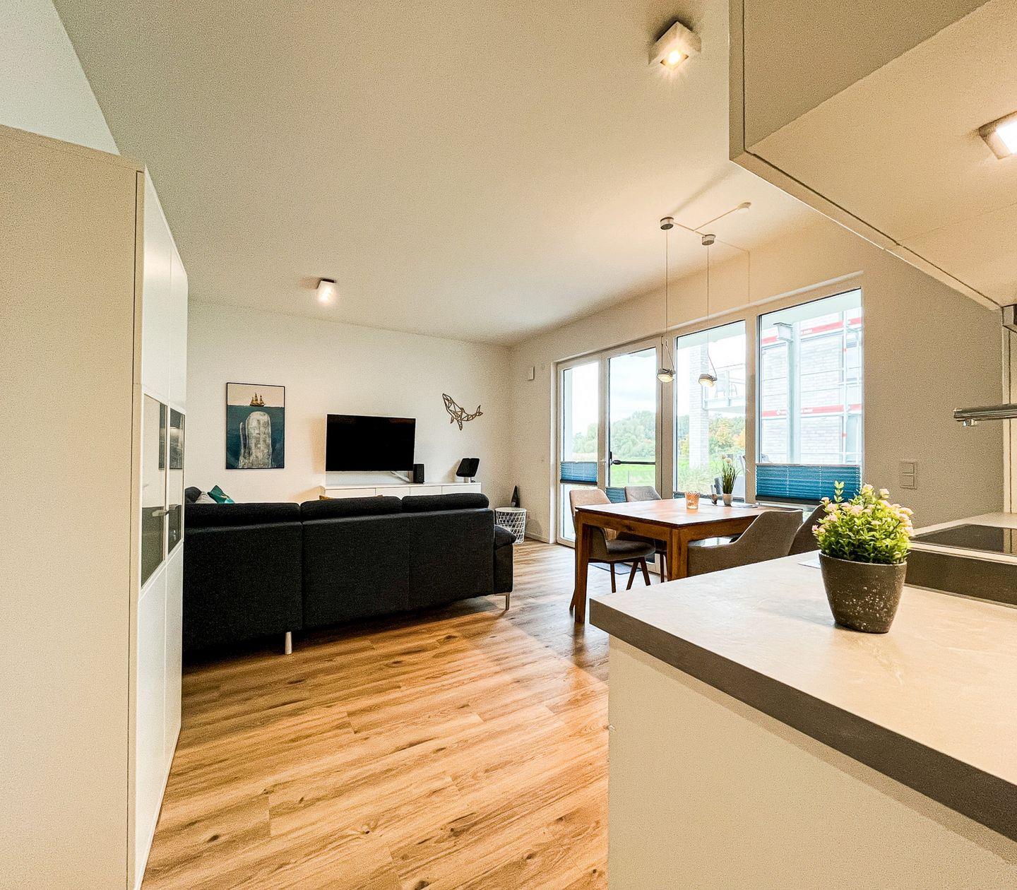 Das lichtdurchflutete Wohnzimmer bildet das Herzstück der Wohnung und ist mit einem gemütlichen Sofa, Sesseln, einer Kommode und einem Essbereich ausgestattet. Moderne Unterhaltungselektronik wie zwei Fernseher, ein Radio und kostenfreies WLAN (ohne Gewähr) sorgen für Abwechslung und Unterhaltung. Die offene Küche, die harmonisch in den Wohnbereich integriert ist, verfügt über einen Ceranherd, einen Backofen, einen Kühlschrank mit integriertem Gefrierfach, eine Spülmaschine, Kaffeemaschine, Wasserkocher, Toaster und vielfältiges Geschirr sowie Besteck. Praktische Utensilien wie ein Staubsauger, ein Wäscheständer und eine Waschmaschine zur Eigennutzung ergänzen den hohen Wohnkomfort.