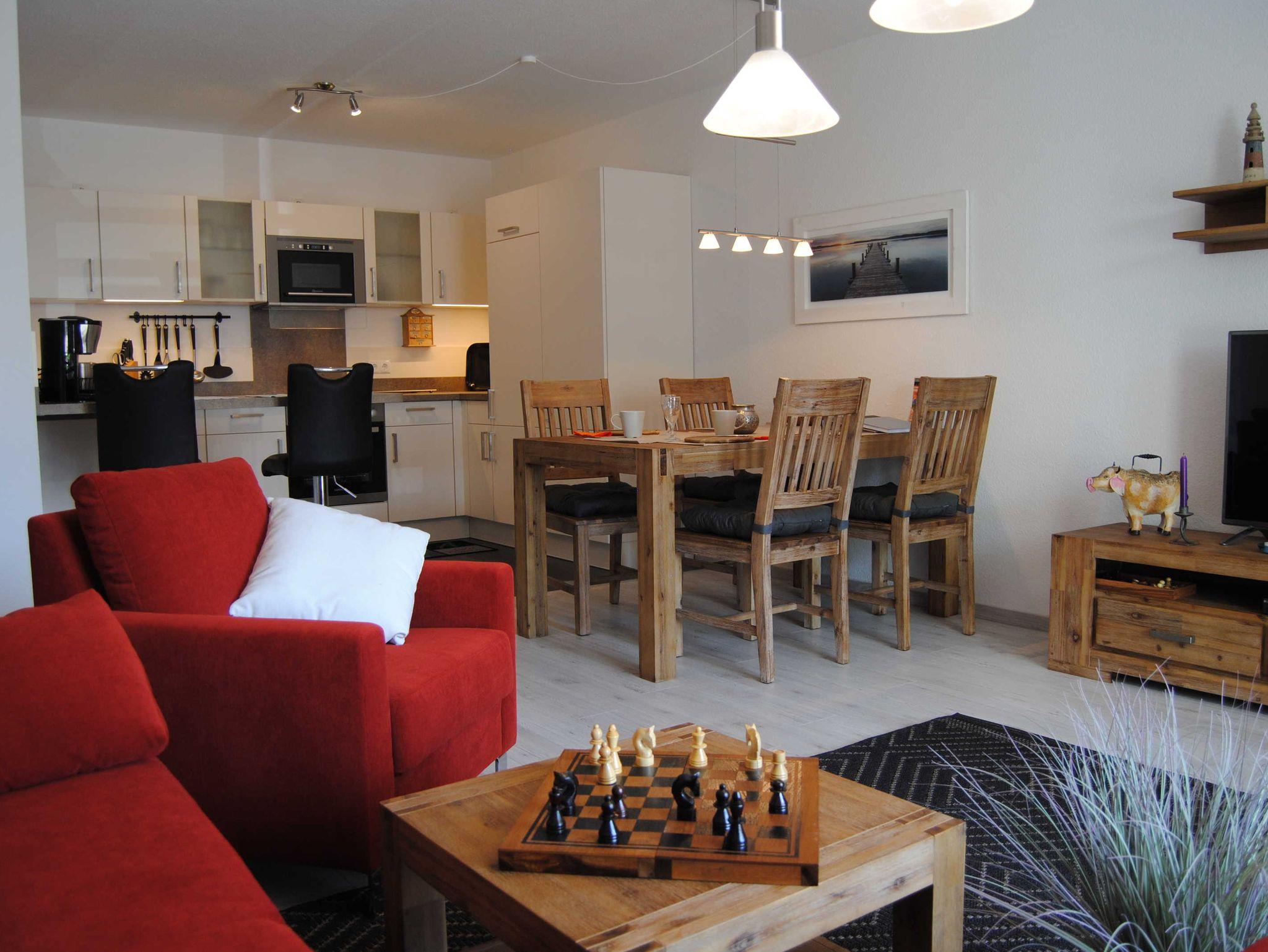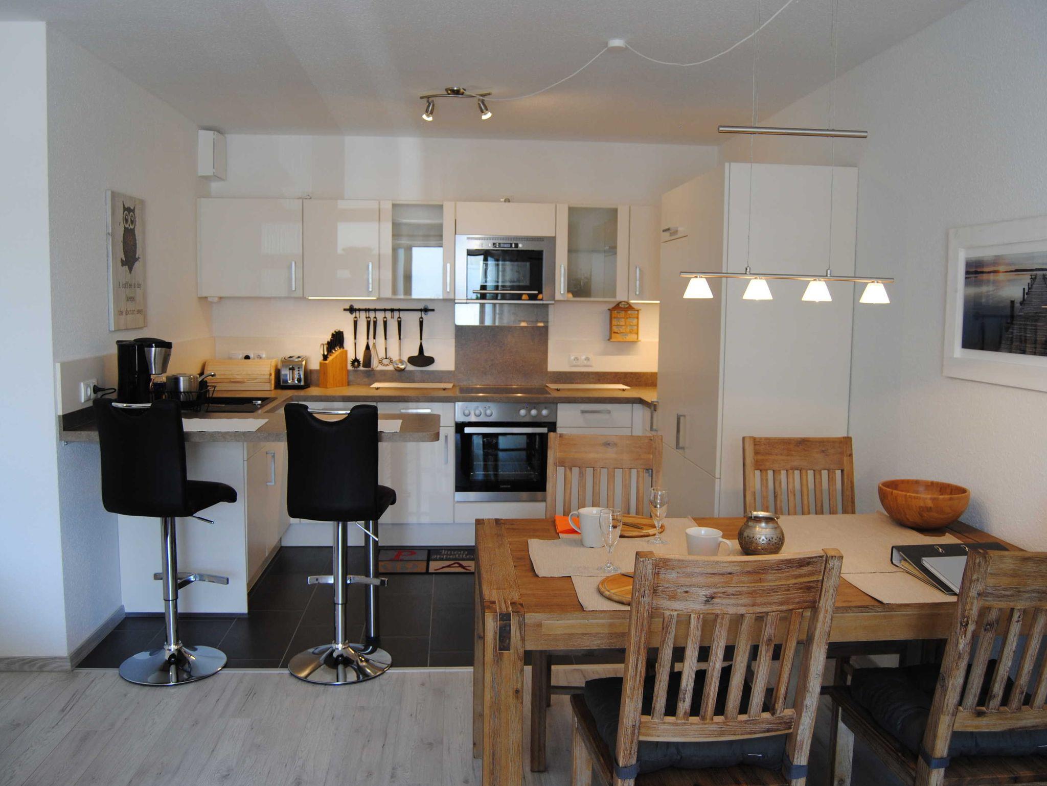 Das Appartement besitzt eine offene, große Küche mit allen Annehmlichkeiten der heutigen Zeit. Im gemütlichen Wohnbereich können Sie ebenso entspannen, wie mit Ihren Lieben gesellige Stunden verbringen.