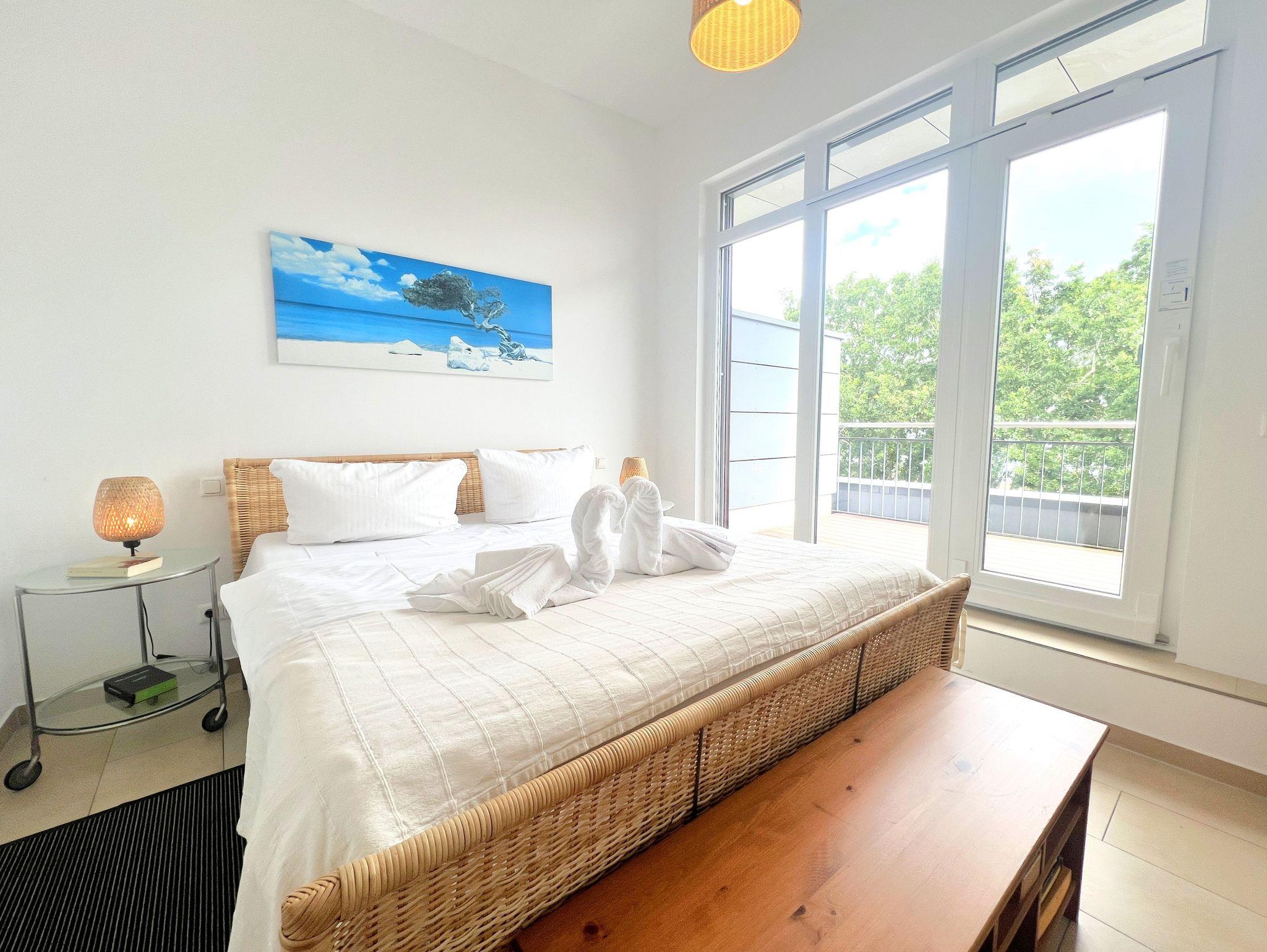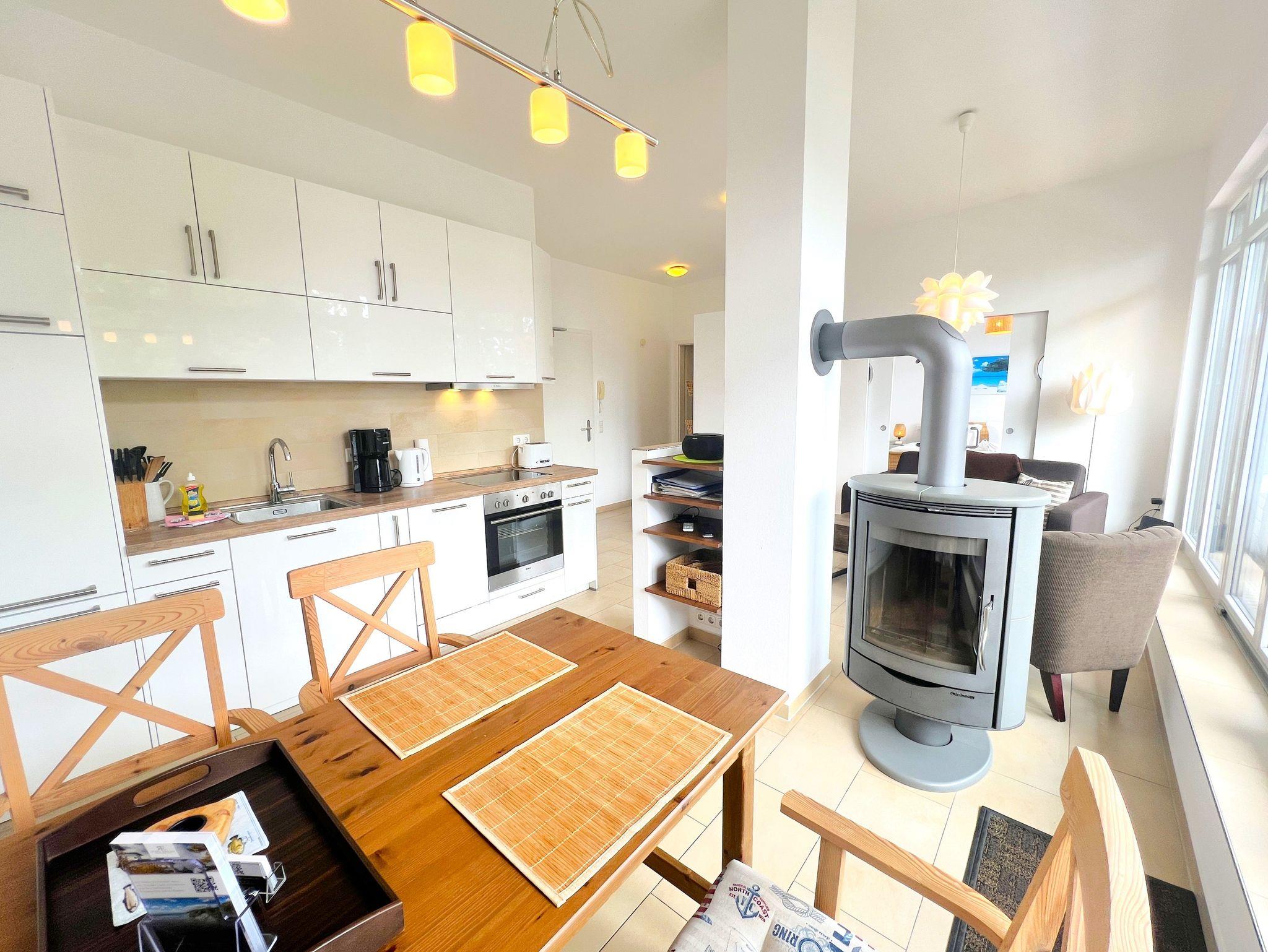 Das Herzstück der Wohnung ist der lichtdurchflutete Wohnbereich mit schwenkbarem Kaminofen, der sich flexibel zur Sitzecke oder zum Essplatz ausrichten lässt und so jederzeit für eine behagliche Atmosphäre sorgt. Von hier aus betreten Sie den außergewöhnlich großen Balkon, der sich über die gesamte Breite der Wohnung erstreckt. Hier erwartet Sie nicht nur ein traumhafter Meerblick, sondern auch ein eigener Strandkorb perfekt für entspannte Stunden mit Meeresrauschen.