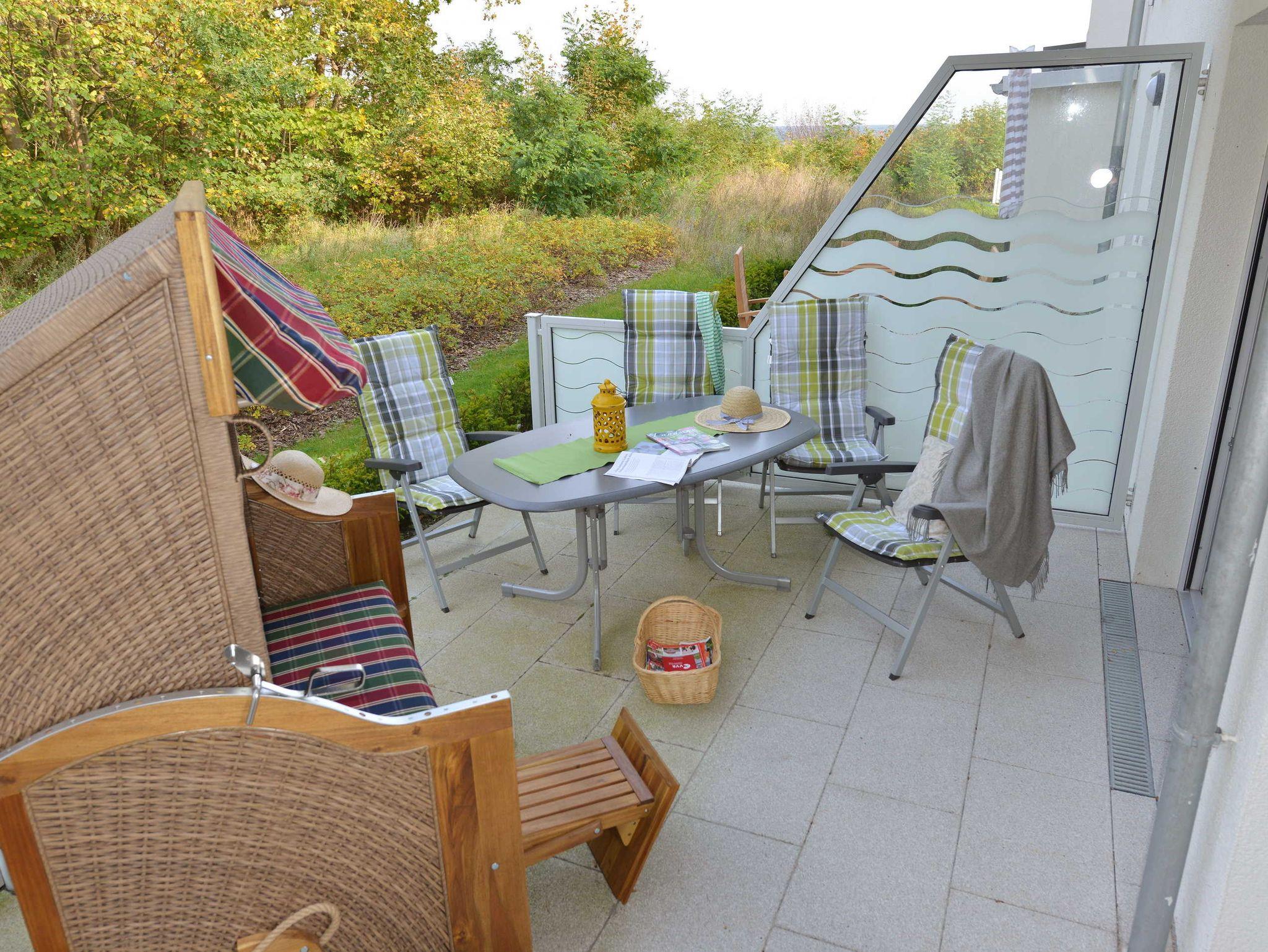 Balkon und Terrasse mit Gartenmöbeln und Strandkorb