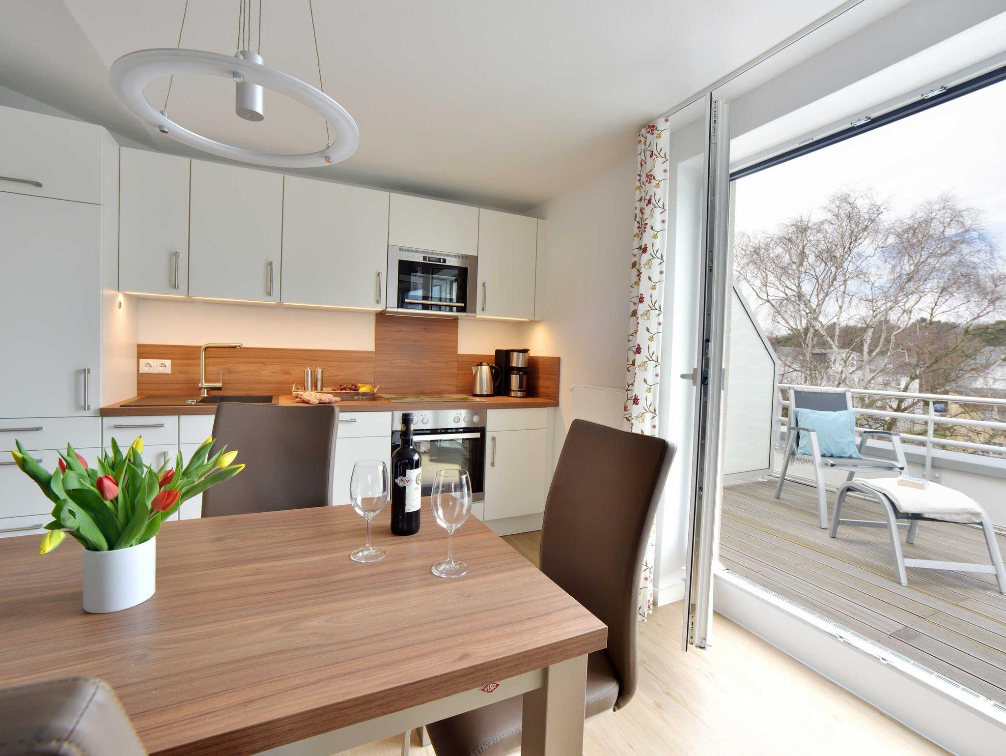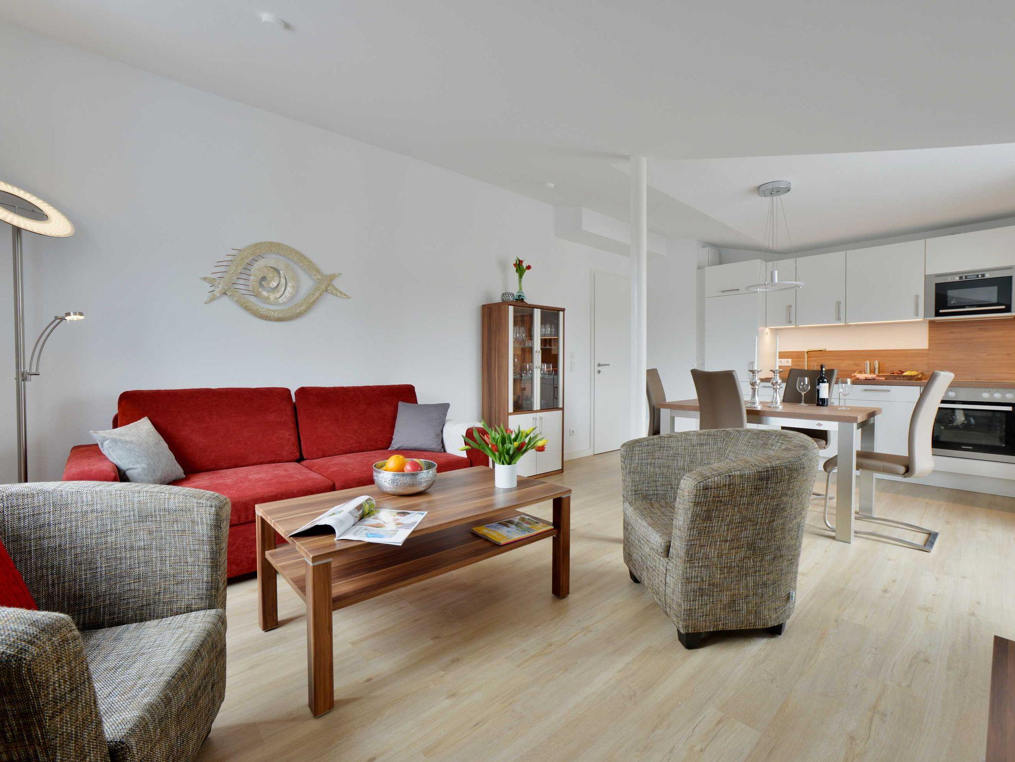 Die Ferienwohnung verfügt über ein Doppelbett im Schlafzimmer und eine große, bequeme Schlafcouch im Wohnbereich. Die modern und umfangreich ausgestattete Küche und der liebevoll eingerichtete Essbereich lassen keine Wünsche offen.