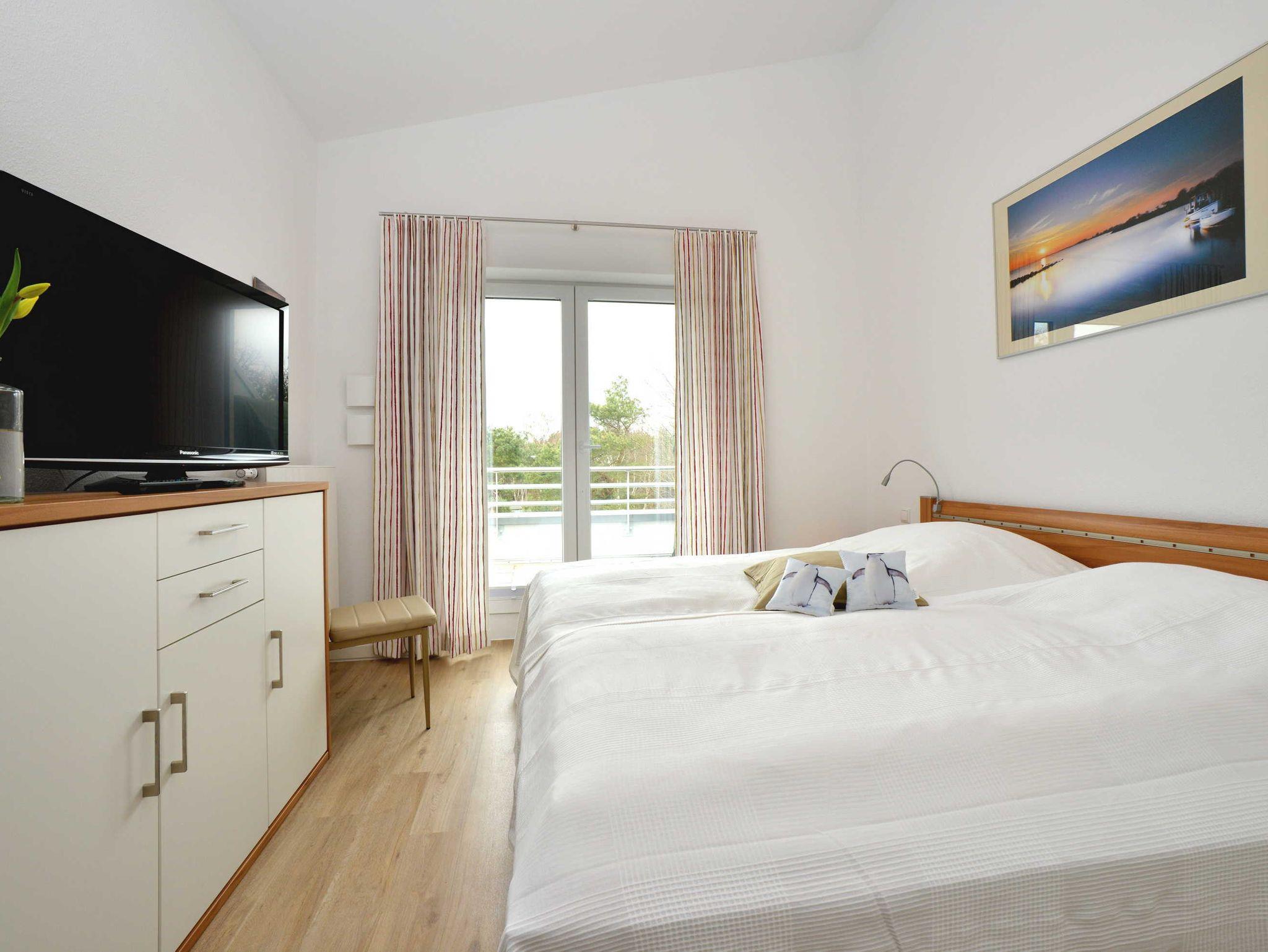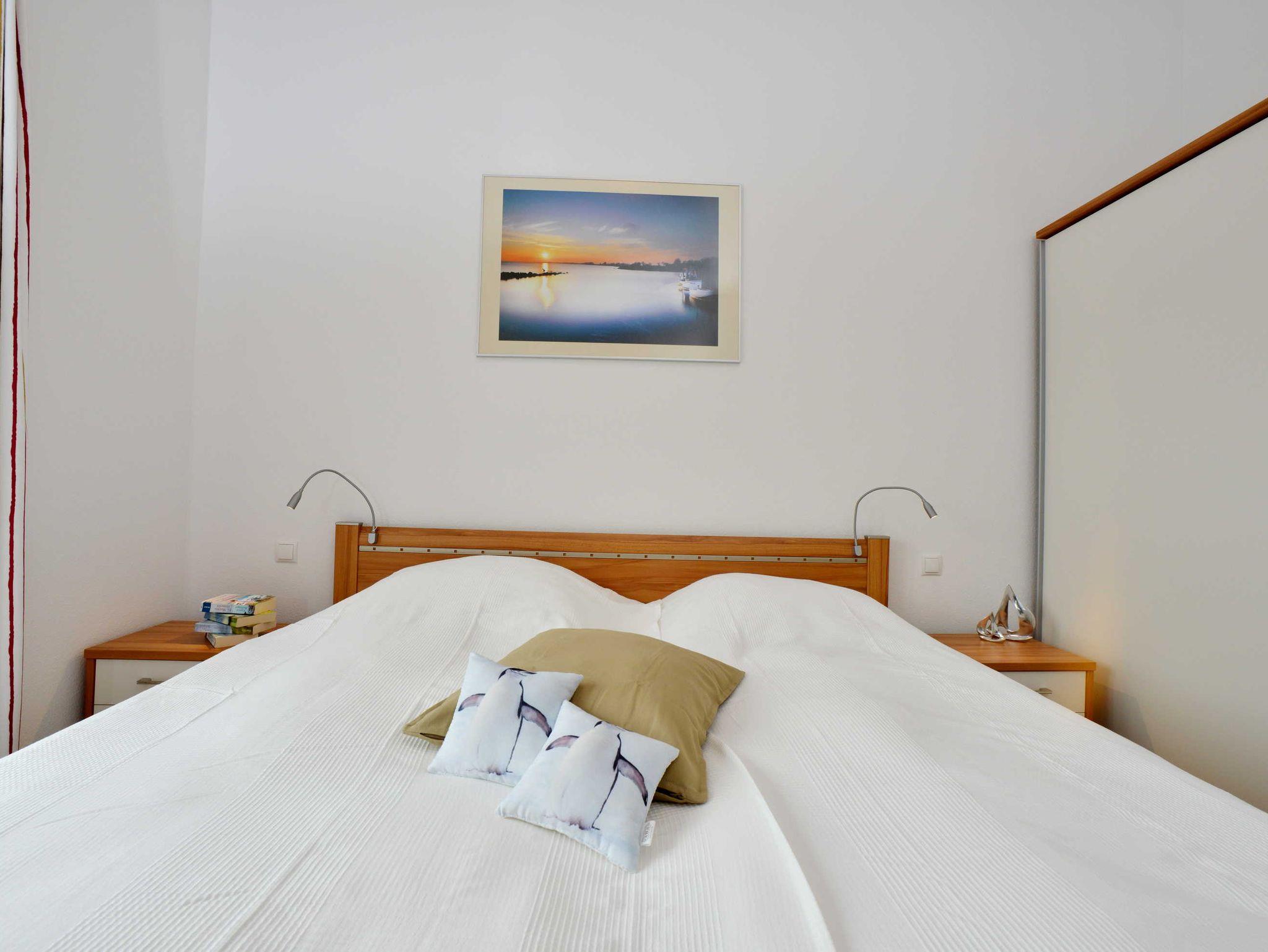 Die Ferienwohnung Strandkorb verfügt über ein Doppelbett im Schlafzimmer und eine Schlafcouch im Wohnbereich. Ein Kinder-/ Babybett kann zugestellt werden.