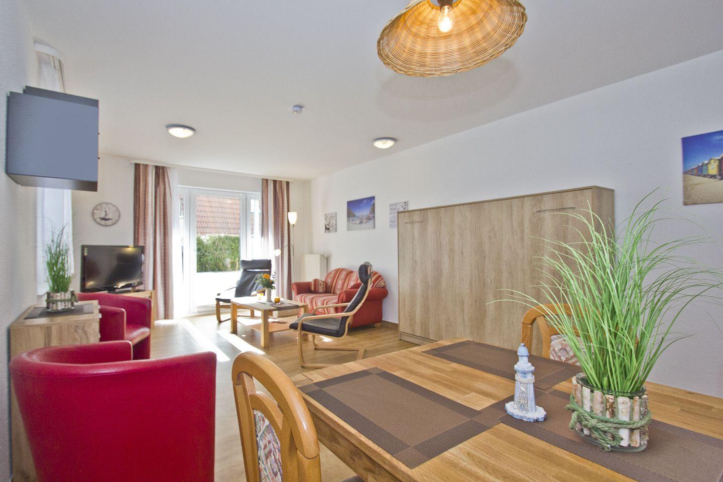 WOHNEN // Wohnraum mit Essbereich, Sitzgarnitur mit bequemer Couch, Wandbett 140x200, Kabel-TV, Radio, CD-Player ++