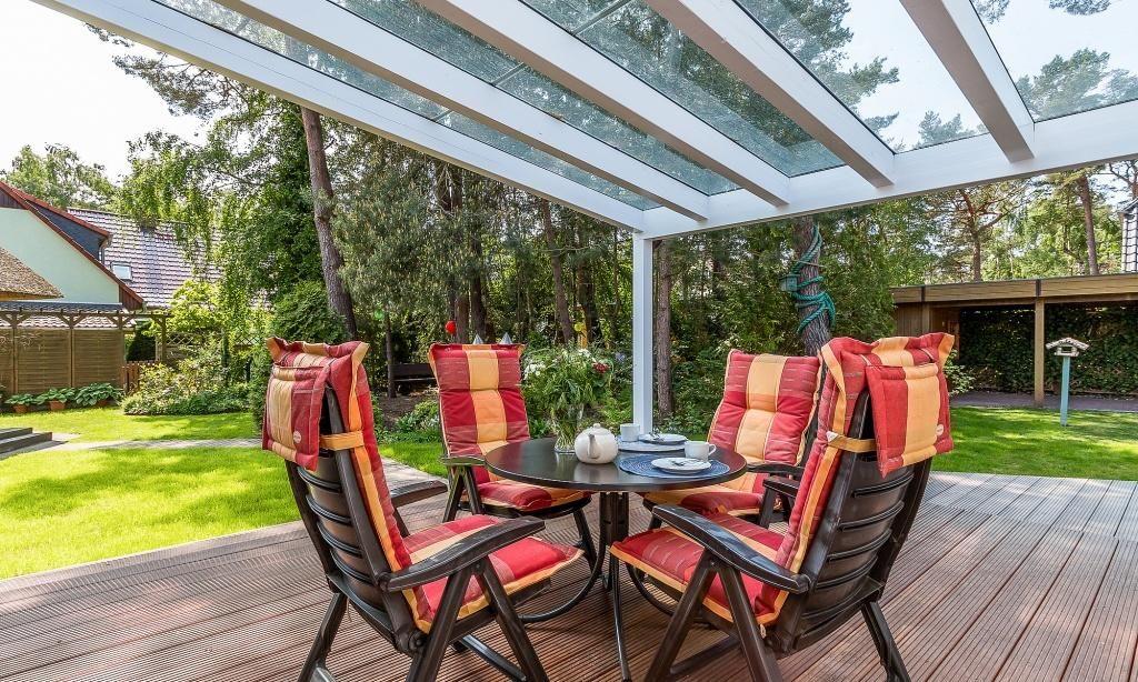 Das Ferienhaus ist von einem eingefriedeten und circa 900 Quadratmeter großen Grundstück umgeben. Auf die großzügige und teilweise überdachte Holzterrasse mit Süd- und Westausrichtung gelangst du sowohl vom Wohnbereich, als auch vom Schlafzimmer aus. Dank der hochwertigen Terrassenmöbel und Sonnenliegen kannst du ganz in Ruhe Entspannen und deine Privatsphäre genießen. Außerdem steht dir ein abschließbarer Fahrradschuppen und ein PKW-Stellplatz zur Verfügung.
