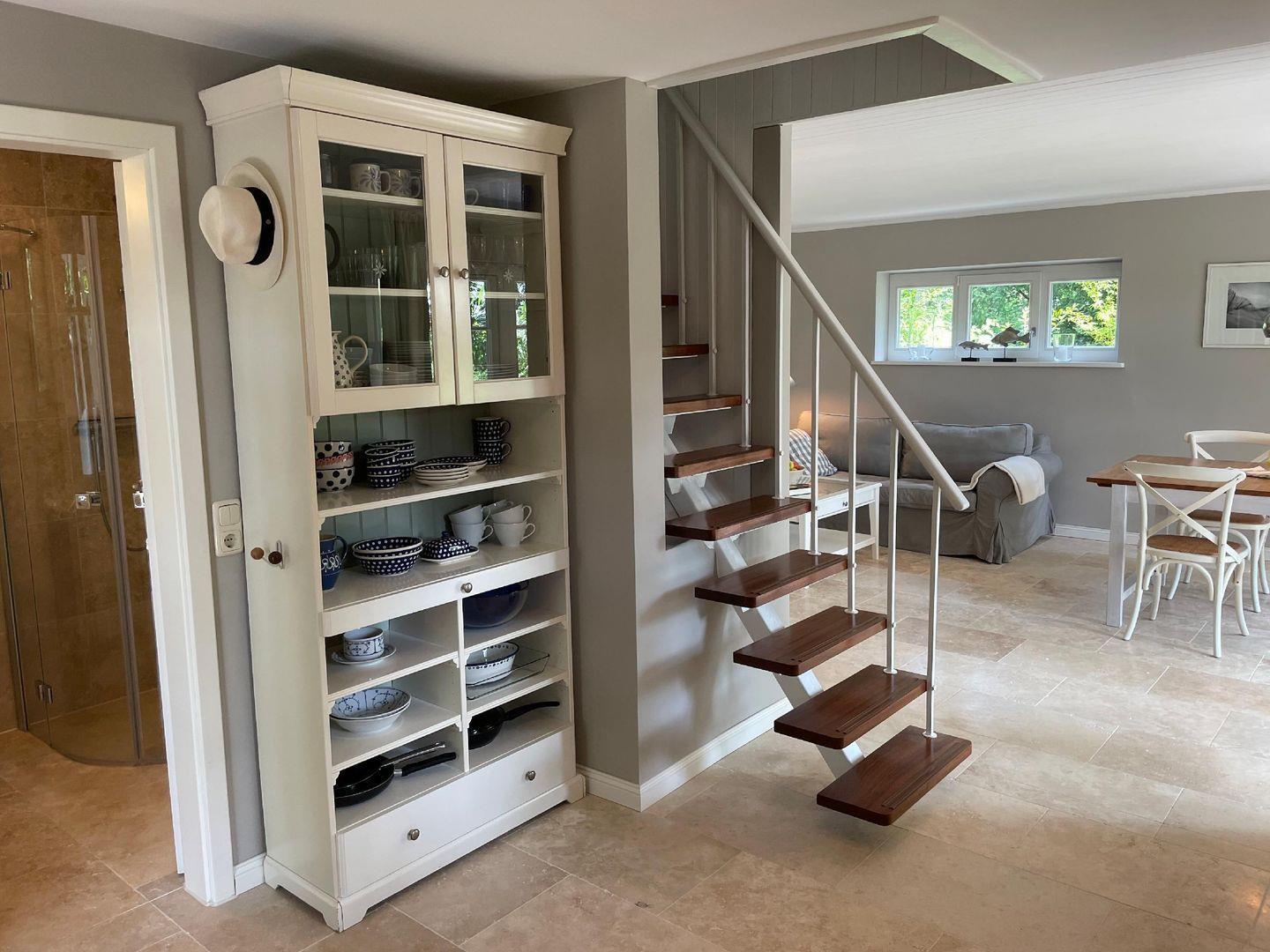Dieses Ferienhaus strahlt eine herzliche Willkommens-Atmosphäre aus. Freue dich auf eine hochwertige Einrichtung, die sich mit ihren hellen und freundlichen Farben dem Strand anpasst. Im Erdgeschoss erwartet dich der gemütliche Wohnbereich mit einem Esstisch und großem Panoramafenster, das dir einen herrlichen Ausblick ins Grüne bietet. Die separate Küche ist funktional ausgestattet und hat alles, was es zum Kochen braucht. Ein Tageslichtbad mit Dusche/WC rundet das Erdgeschoss ab. Über eine steilere Treppe erreichst du das Obergeschoss. Hier liegen die beiden gemütlichen Schlafzimmer. Während das Hauptschlafzimmer mit einem Doppelbett ausgestattet ist, befinden sich in dem anderen zwei Einzelbetten.