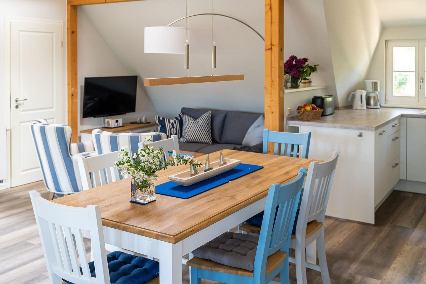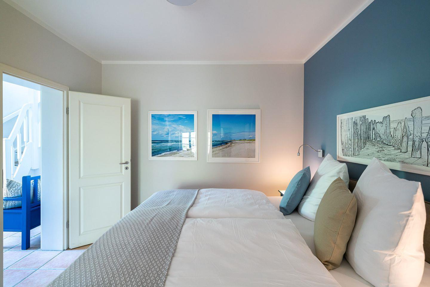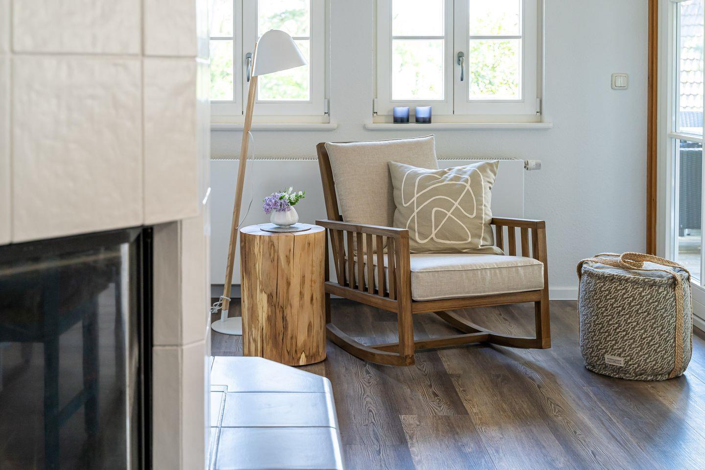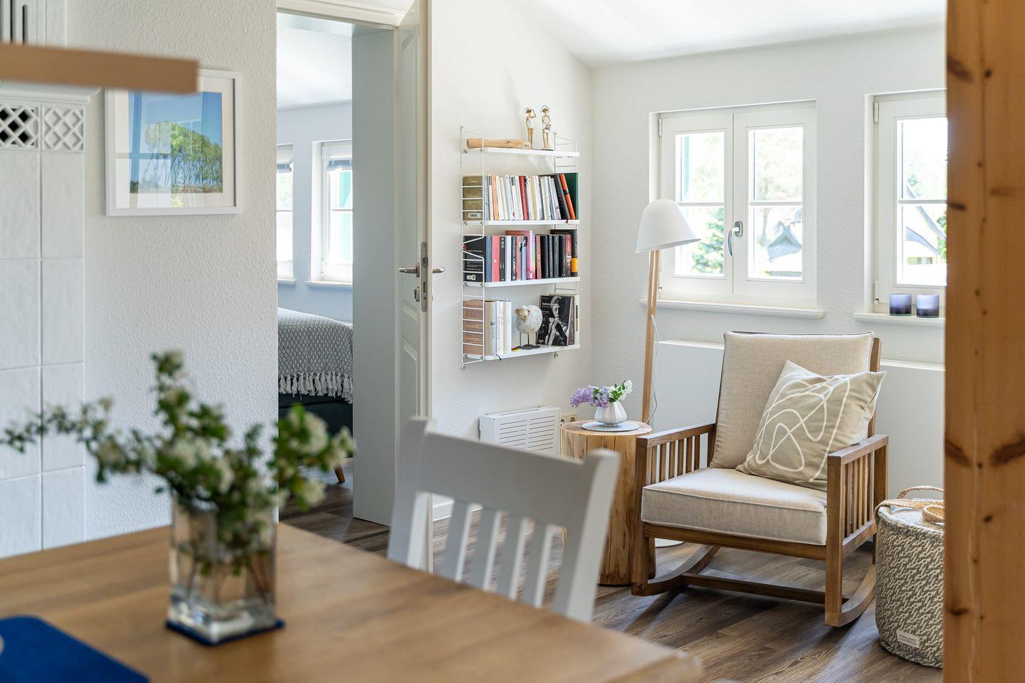 Vom Interieur, über Kunst- und Deko-Elemente bis ins kleinste Detail wurde in der Ferienwohnung „Gelassenheit“ alles liebevoll und ausgesucht eingerichtet. Entstanden ist ein modernes Beachhouse-Flair, das sich perfekt an seine Strandumgebung anpasst. Über eine große Holzterrasse geht’s in den Eingang. Im Erdgeschoss befindet sich das erste der drei Schlafzimmer. Großzügig gestaltet, mit hochwertigem Boxspringbett und Strandbildern, die zum Träumen einladen. Die hauseigene Sauna mit angeschlossenem Bad geht ebenfalls vom Flur ab. Gerade nach einem stürmischen Strandspaziergang ist die wohltuende Wärme das i-Tüpfelchen für eine erholsamen Tag. Über die Holztreppe gelangst du in den offenen Wohnbereich. Mit der gemütlichen Couch, der modernen Küche, dem großen Esstisch am Kaminofen und dem Schaukelstuhl spielt sich hier das Urlaubsleben ab. Ein weiteres Highlight ist die großzügige und teils überdachte Dachterrasse (18 qm), die Dank heimischer Bäume, Sträucher und niedlichen Reetdächern das ganze Jahr über einen wundervollen Ausblick bietet. Zwei stilvolle Schlafzimmer mit komfortablen Boxspringbetten, eins mit Bad en Suite sowie ein weiteres Badezimmer runden den Wohnkomfort für bis zu sechs Personen perfekt ab.