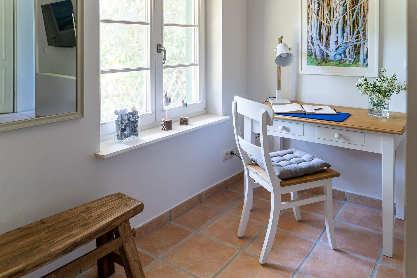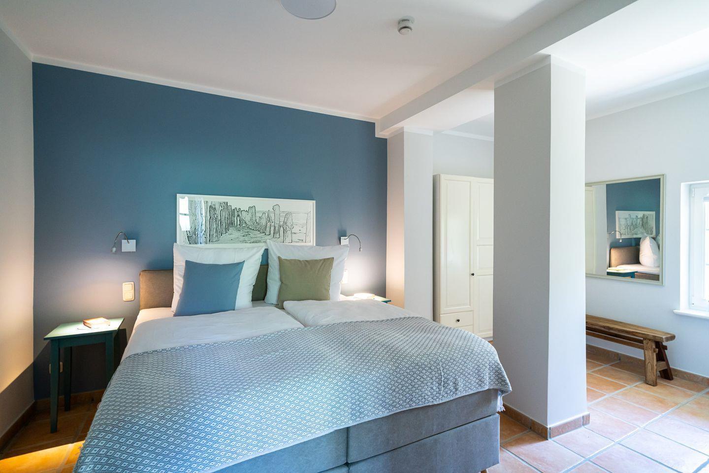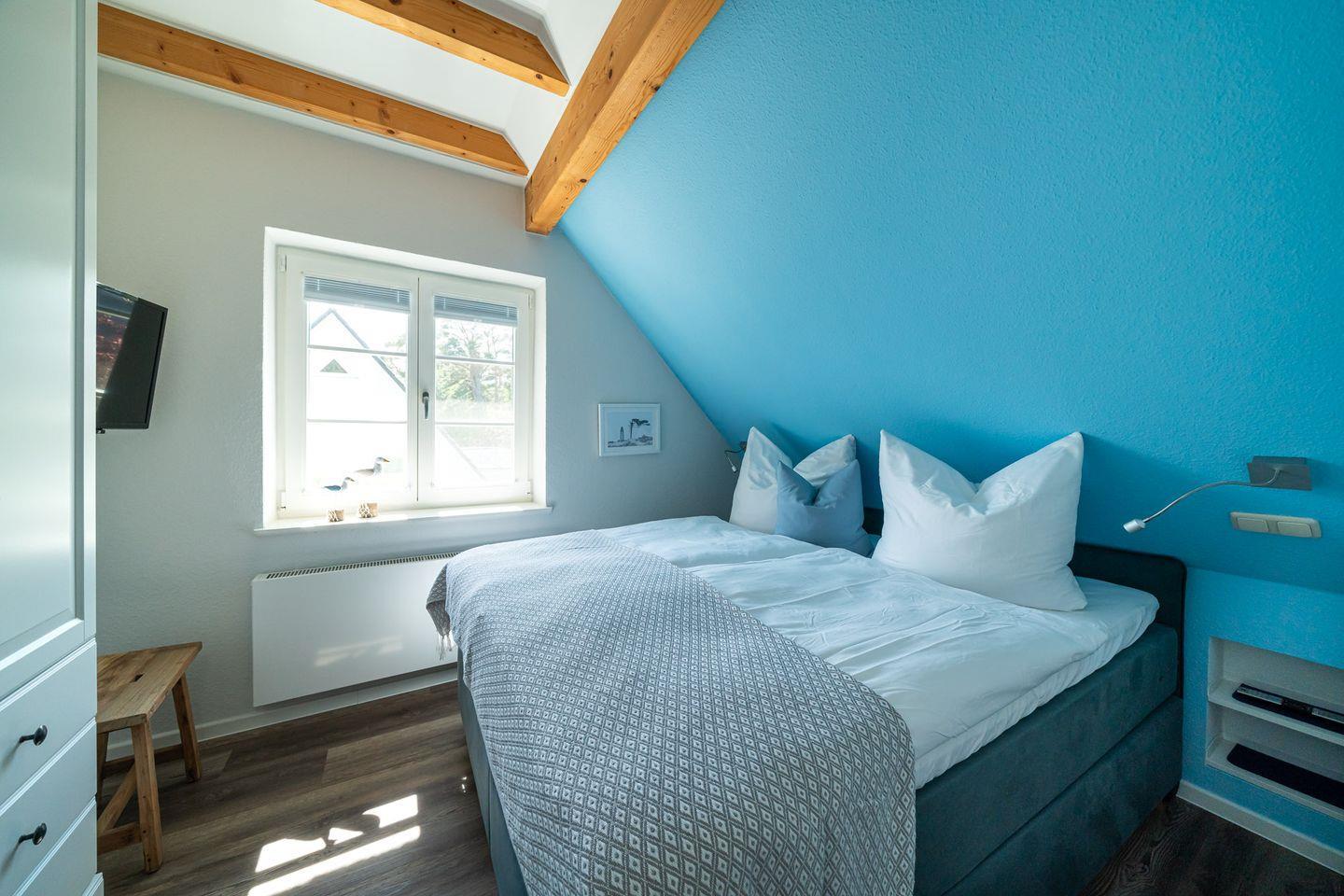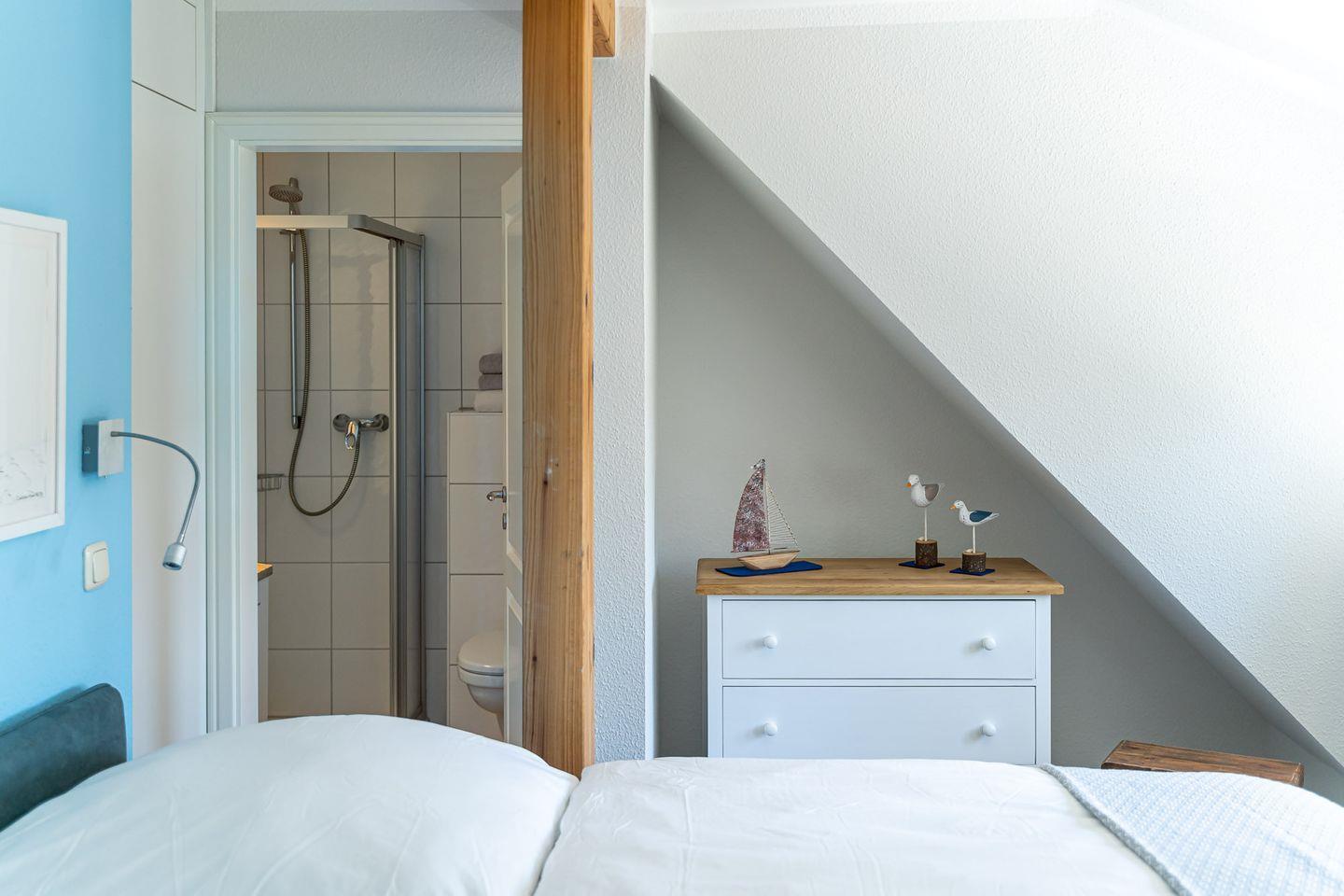 Vom Interieur, über Kunst- und Deko-Elemente bis ins kleinste Detail wurde in der Ferienwohnung „Gelassenheit“ alles liebevoll und ausgesucht eingerichtet. Entstanden ist ein modernes Beachhouse-Flair, das sich perfekt an seine Strandumgebung anpasst. Über eine große Holzterrasse geht’s in den Eingang. Im Erdgeschoss befindet sich das erste der drei Schlafzimmer. Großzügig gestaltet, mit hochwertigem Boxspringbett und Strandbildern, die zum Träumen einladen. Die hauseigene Sauna mit angeschlossenem Bad geht ebenfalls vom Flur ab. Gerade nach einem stürmischen Strandspaziergang ist die wohltuende Wärme das i-Tüpfelchen für eine erholsamen Tag. Über die Holztreppe gelangst du in den offenen Wohnbereich. Mit der gemütlichen Couch, der modernen Küche, dem großen Esstisch am Kaminofen und dem Schaukelstuhl spielt sich hier das Urlaubsleben ab. Ein weiteres Highlight ist die großzügige und teils überdachte Dachterrasse (18 qm), die Dank heimischer Bäume, Sträucher und niedlichen Reetdächern das ganze Jahr über einen wundervollen Ausblick bietet. Zwei stilvolle Schlafzimmer mit komfortablen Boxspringbetten, eins mit Bad en Suite sowie ein weiteres Badezimmer runden den Wohnkomfort für bis zu sechs Personen perfekt ab.