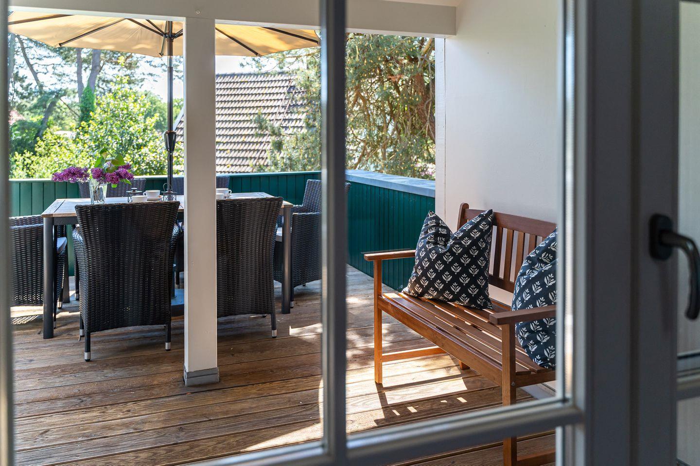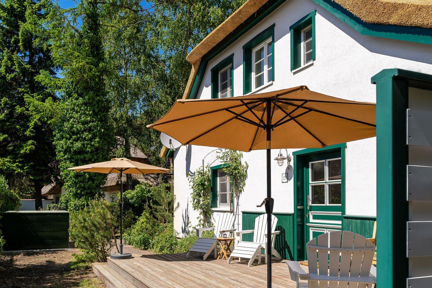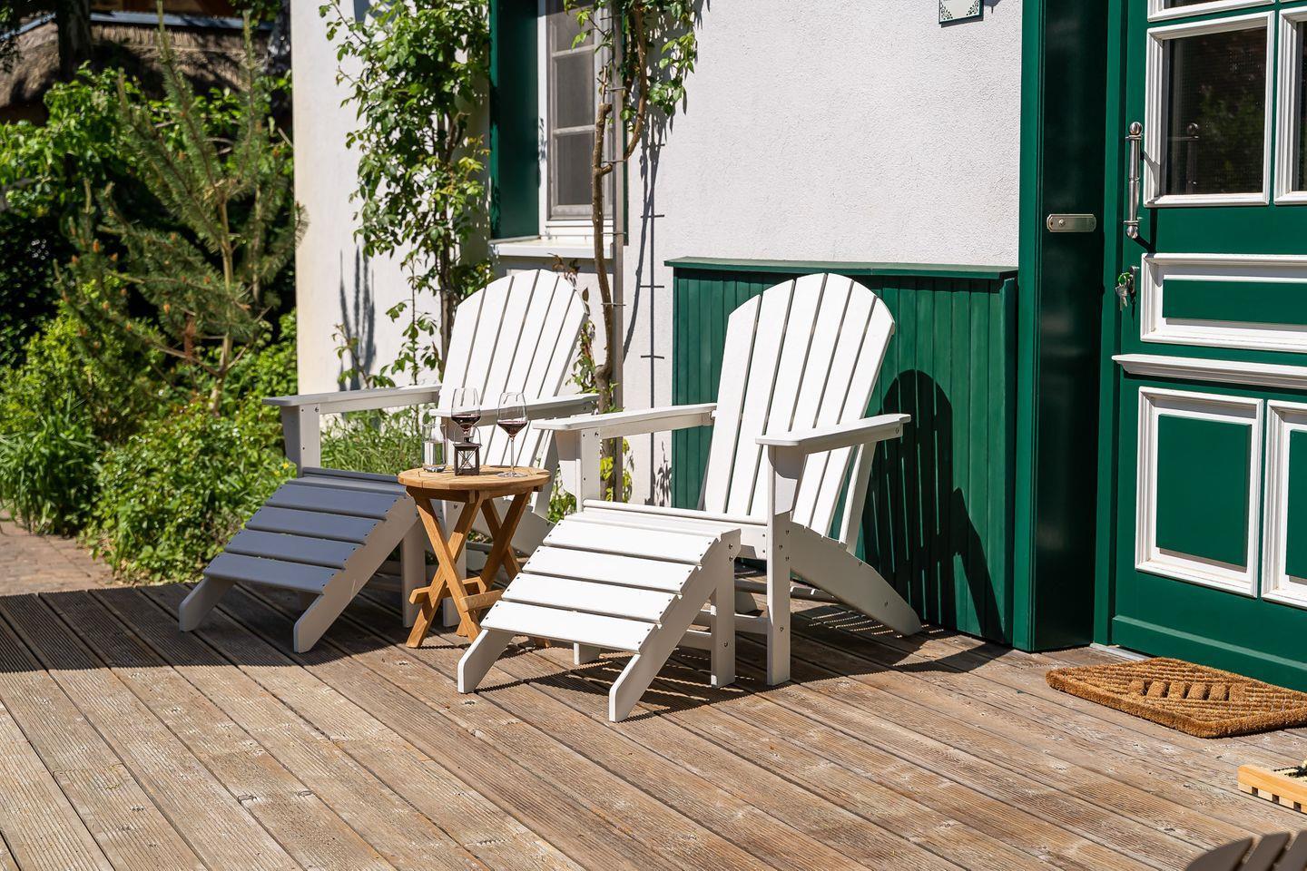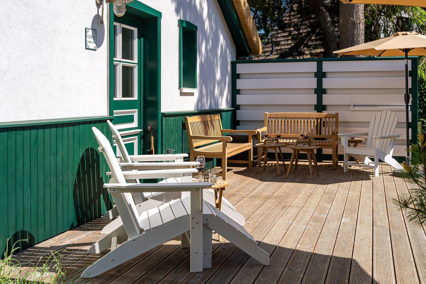 Der Außenbereich hält eine großzügige Holzterrasse (50 qm) mit Liegestühlen, Sonnenschirm und kleinen Garten bereit. Nach einem ausgiebigen Urlaubstag kann man hier ganz privat für sich entspannen - unter freiem Himmel, im Hintergrund das sanfte Murmeln des Meeres und mit Blick in die grüne Umgebung, in der vielleicht gerade ein Reh vorbeizieht.