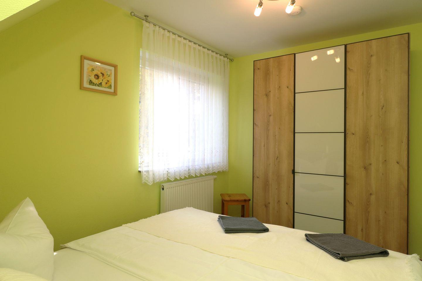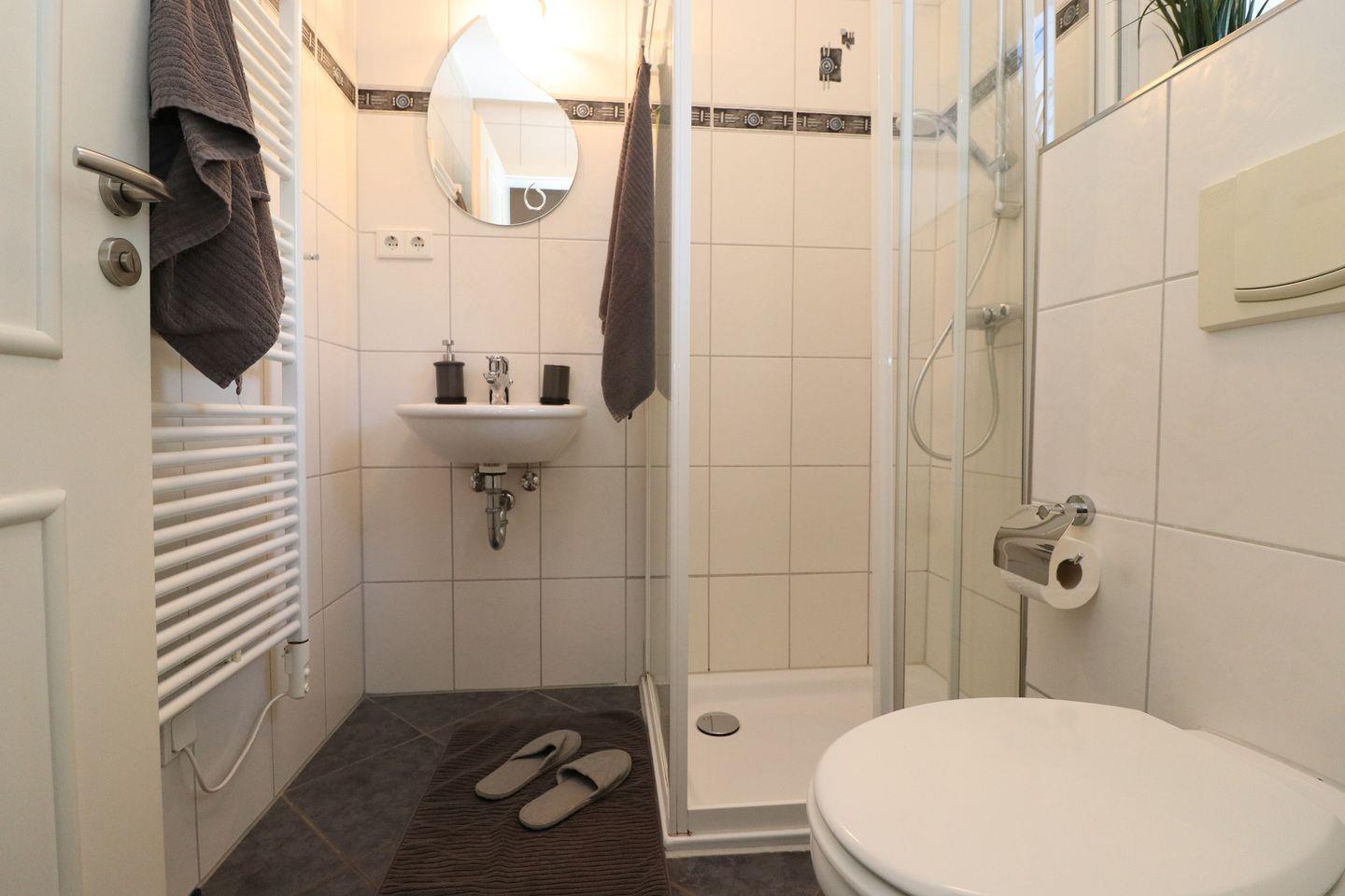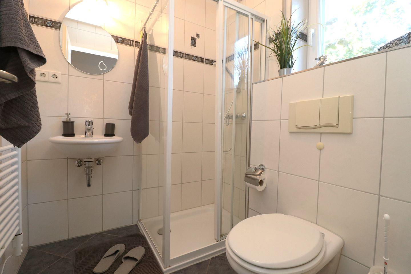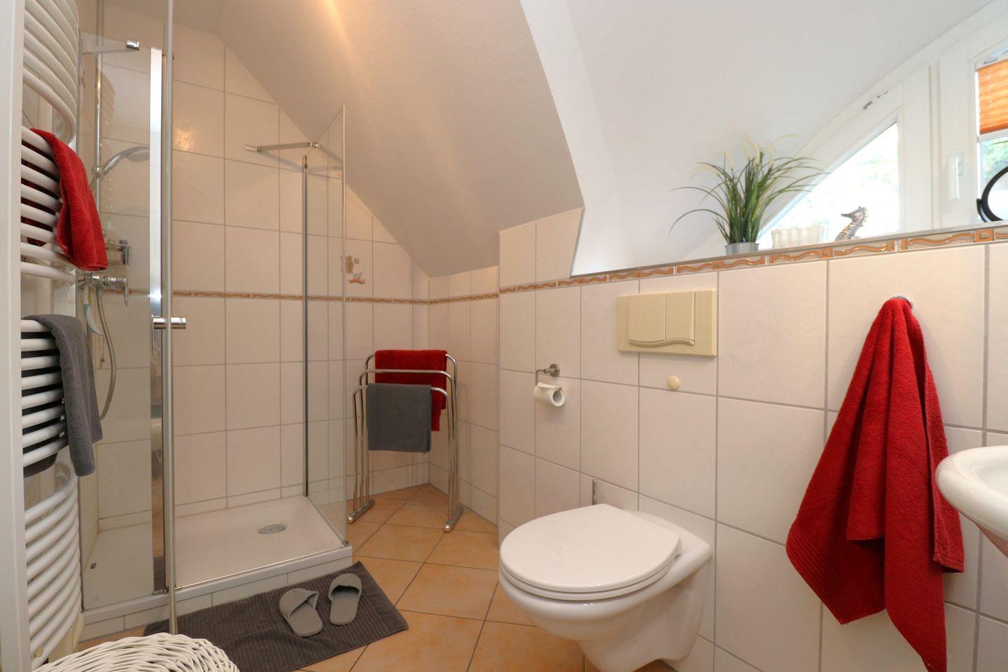 Im Obergeschoss befinden sich drei Schlafzimmer, die ausreichend Platz für erholsame Nächte bieten: ein Schlafzimmer mit Doppelbett, eines mit zwei Einzelbetten sowie ein weiteres mit Tandembett – ideal für Familien oder gemeinsam reisende Freunde. Ein weiteres Badezimmer mit Dusche und WC ergänzt die Ausstattung.
