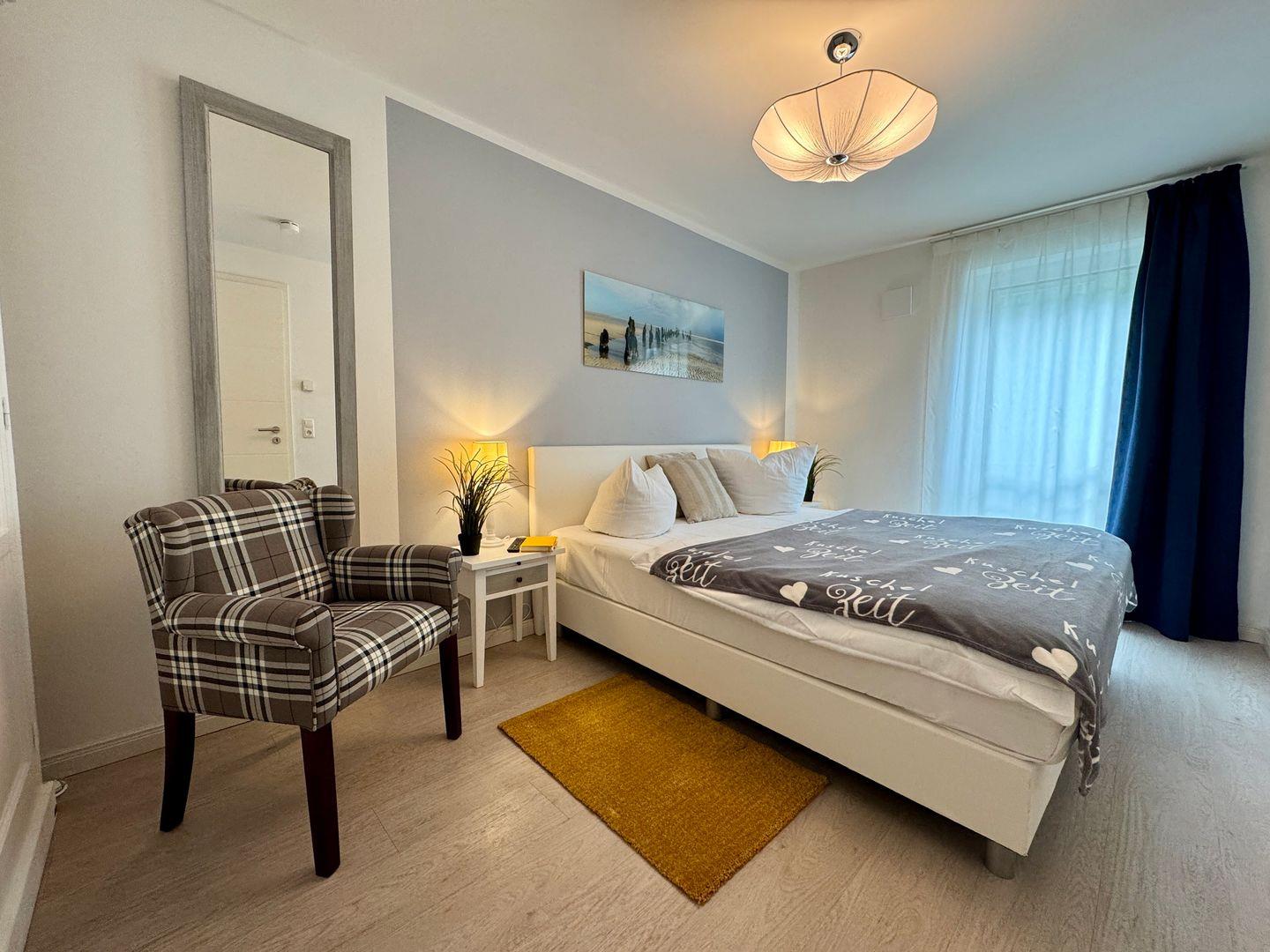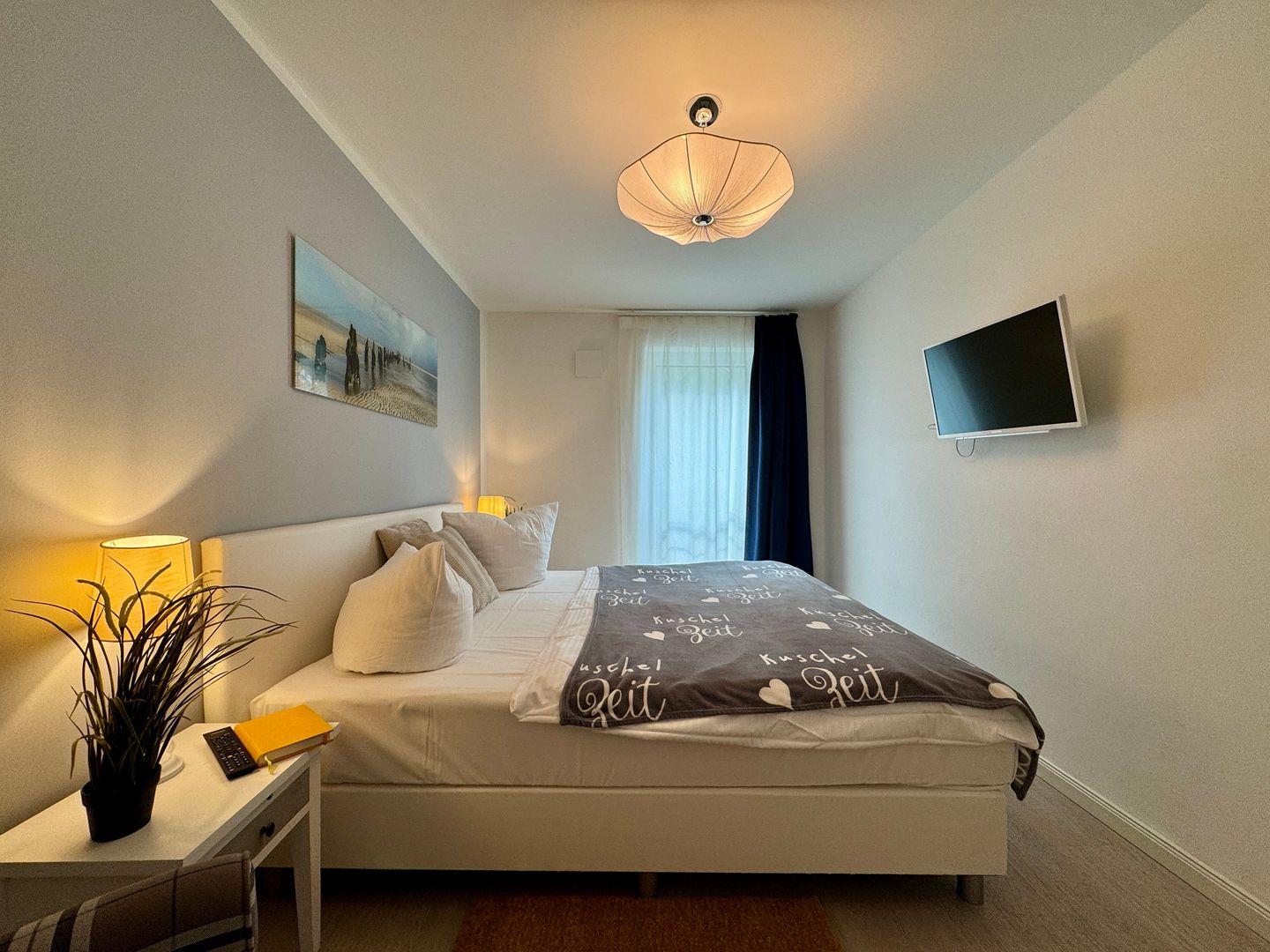 Das separate Schlafzimmer mit komfortablem Doppelbett sorgt für erholsame Nächte und bietet einen ruhigen Rückzugsort nach einem Tag am Strand oder einem Ausflug entlang der Ostseeküste.