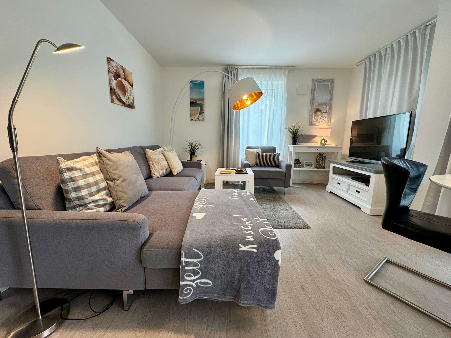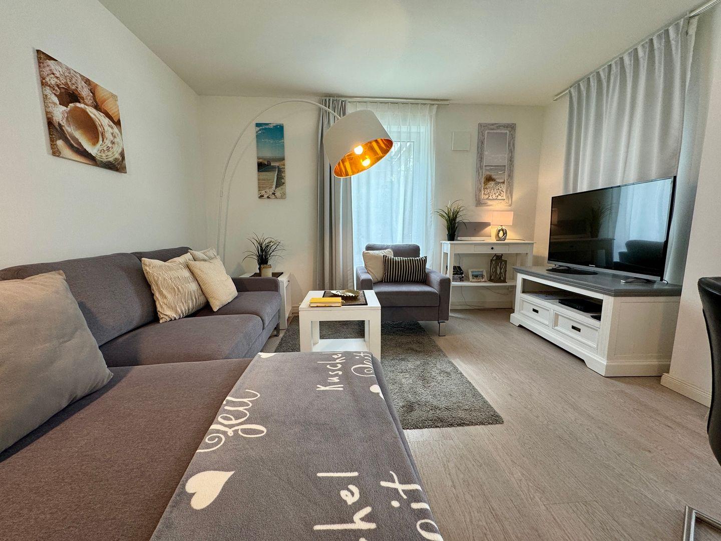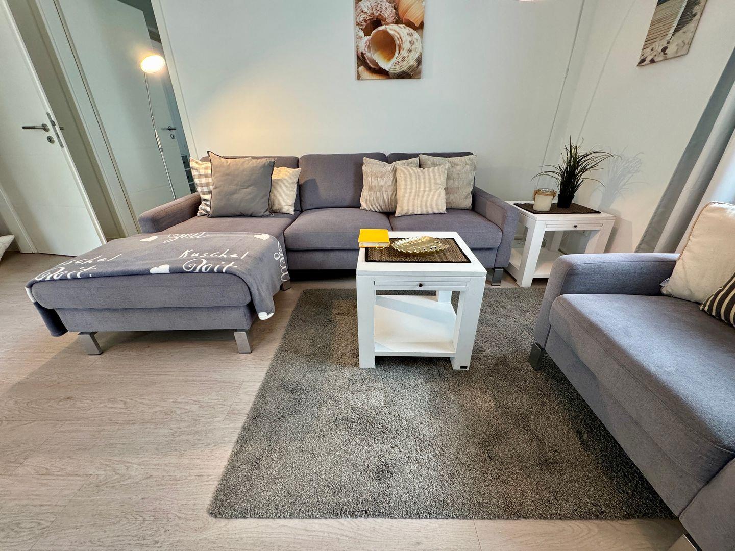 Der Wohnbereich ist hell und einladend gestaltet. Eine gemütliche Schlafcouch bietet zusätzliche Schlafmöglichkeiten für eine dritte Person, während die offene Küche alles bereithält, was Sie für die Zubereitung Ihrer Mahlzeiten benötigen.