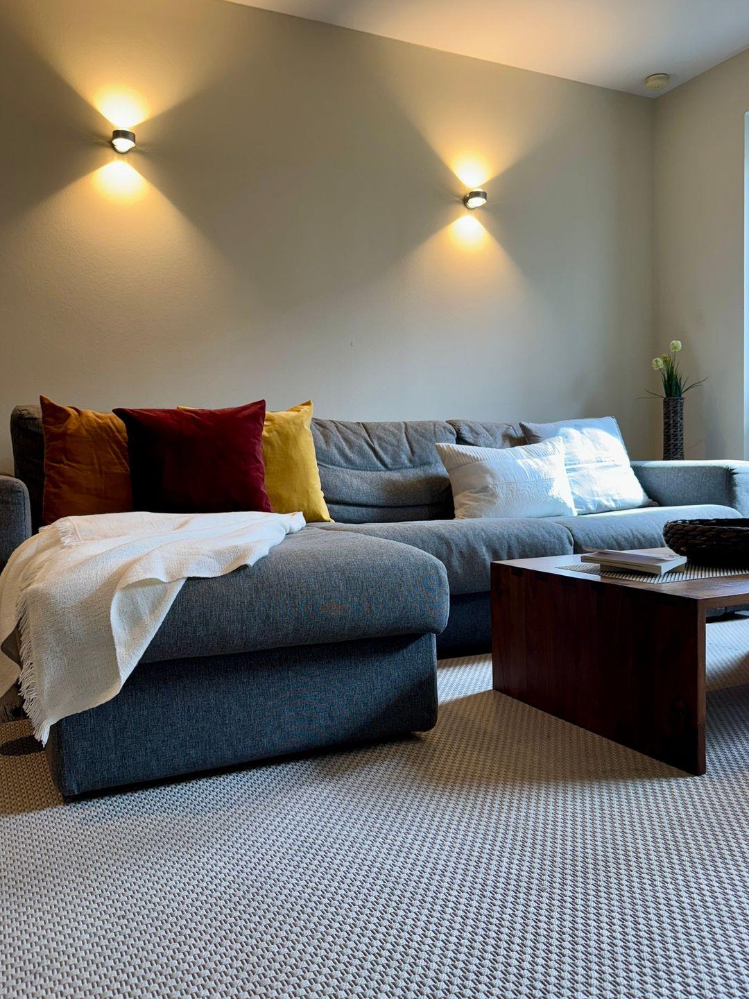 Der helle Wohnbereich lädt mit einer gemütlichen Sitzecke zum Verweilen ein. Eine Schlafcouch bietet zusätzliche Schlafmöglichkeiten für eine dritte Person. Die offene Küche ist praktisch ausgestattet und bietet alles, was Sie für die Zubereitung Ihrer Mahlzeiten benötigen – perfekt für ein entspanntes Frühstück oder ein gemeinsames Abendessen.