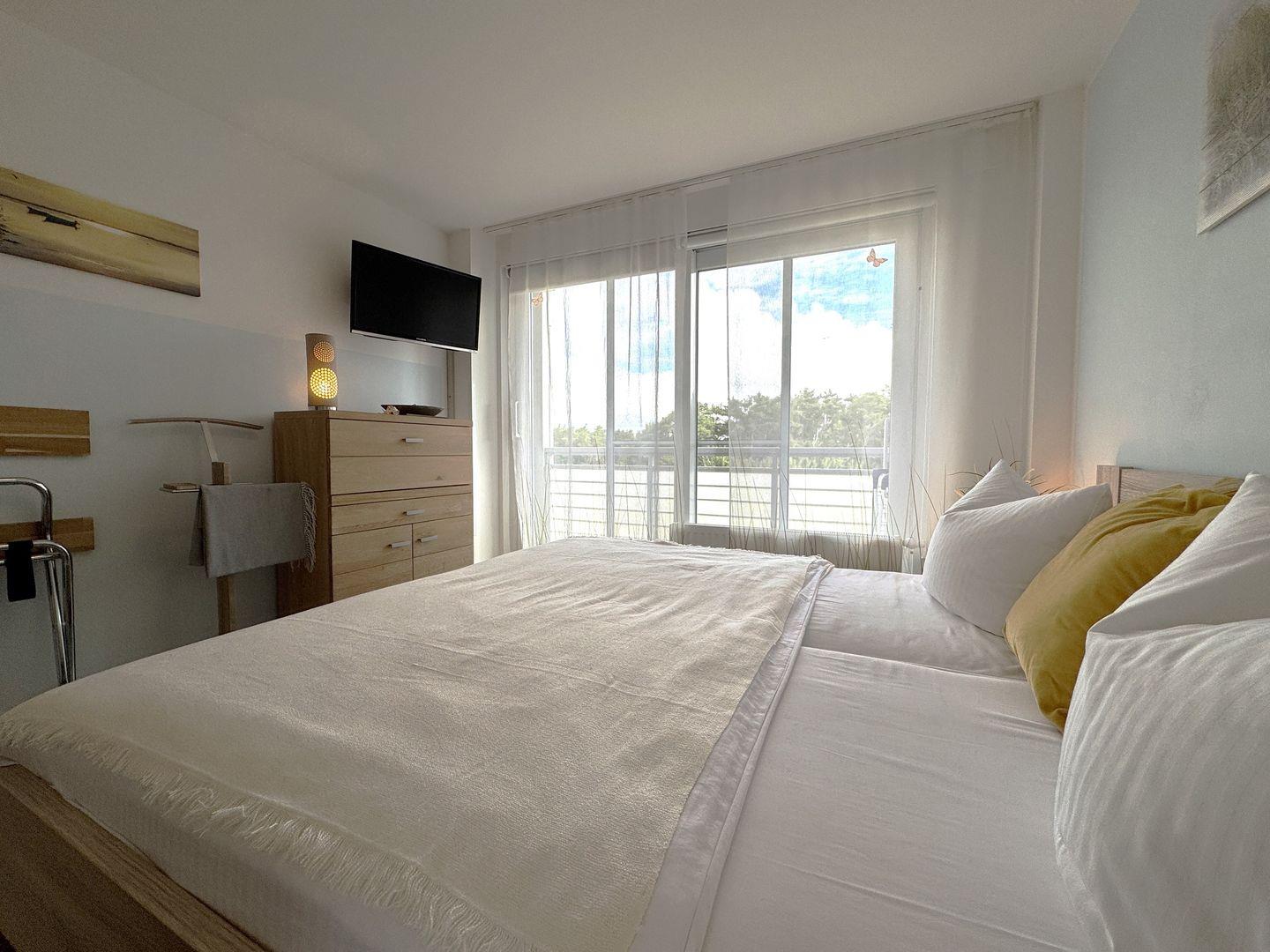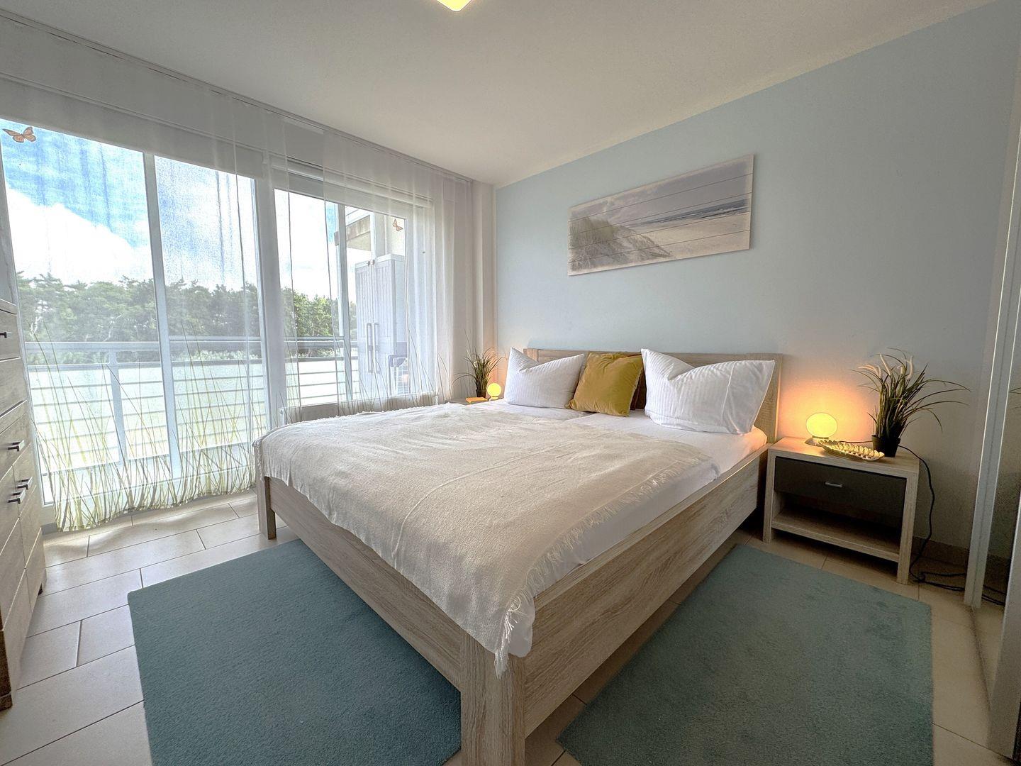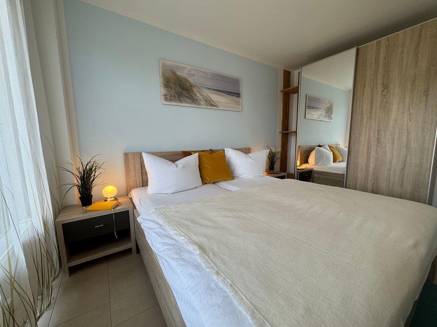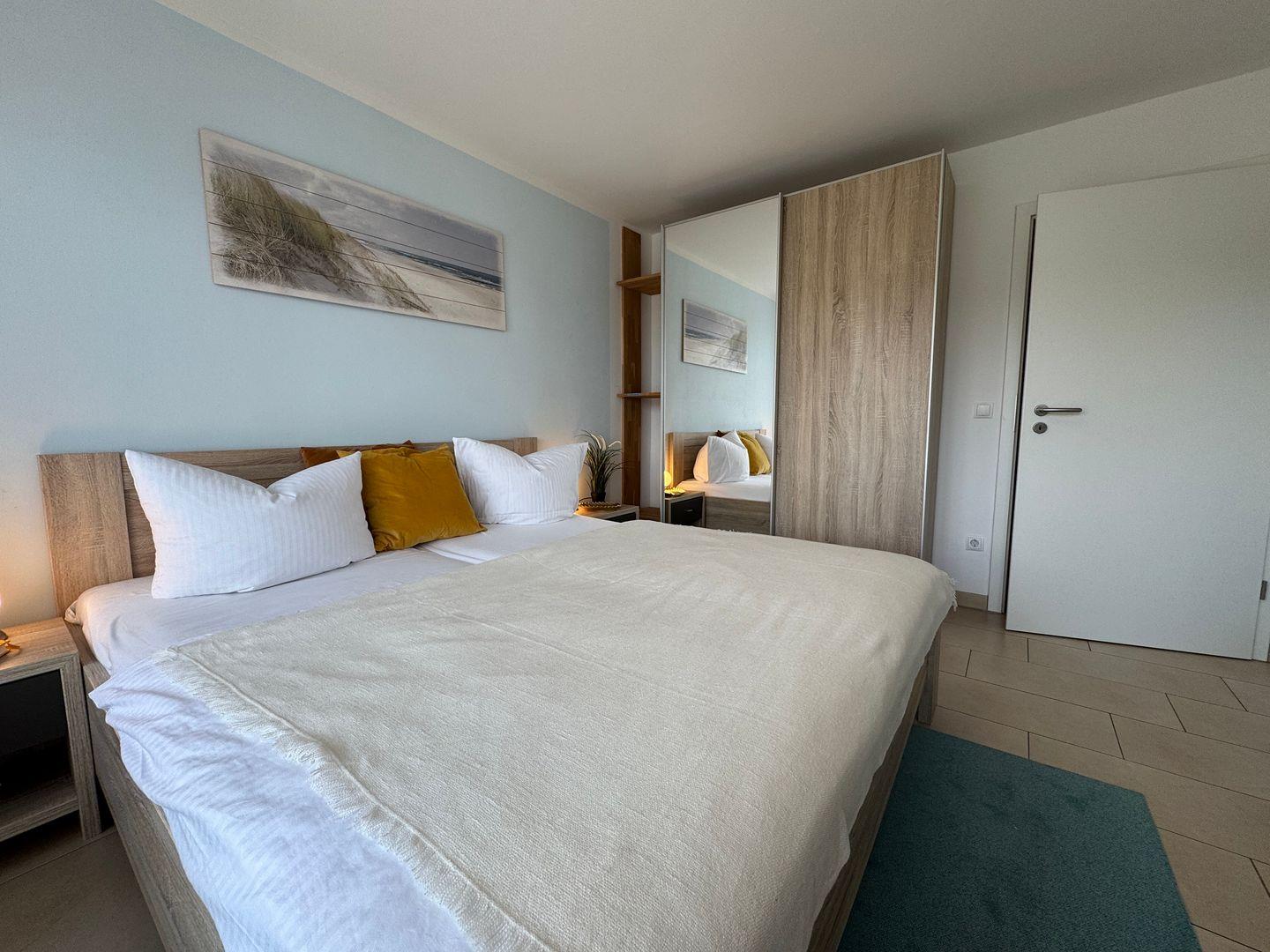 Das separate Schlafzimmer mit bequemem Doppelbett sorgt für erholsame Nächte und einen ruhigen Rückzugsort nach einem erlebnisreichen Tag am Meer.