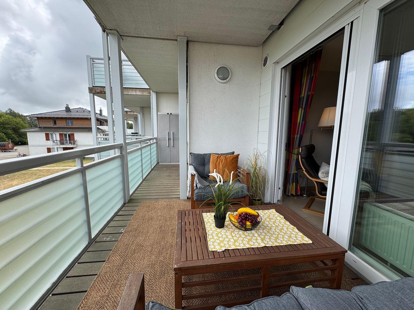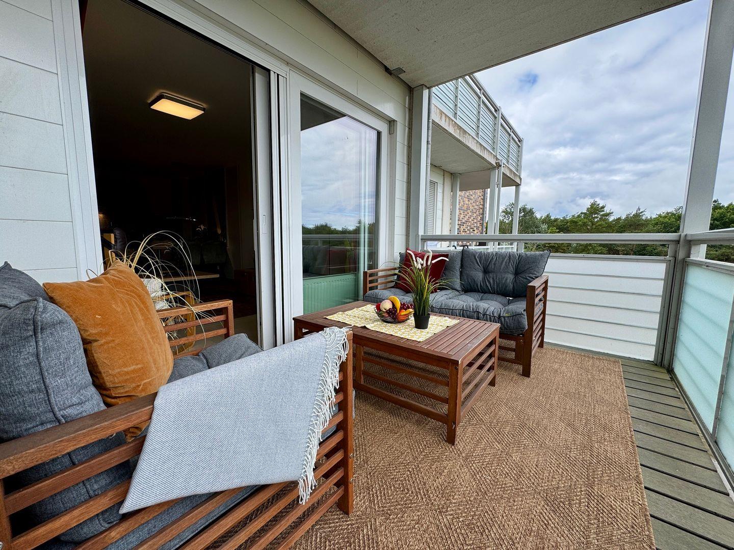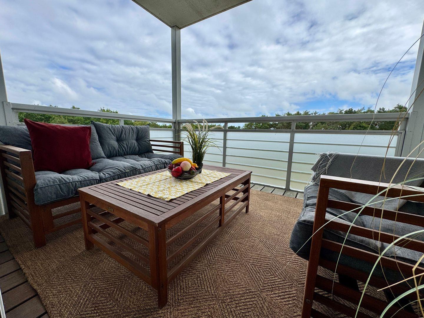 Der Nord-West-Balkon lädt dazu ein, laue Sommerabende im Freien zu genießen oder den Tag mit einem Frühstück an der frischen Ostseeluft zu beginnen. Hier können Sie nach einem Strandspaziergang zur Ruhe kommen und die entspannte Atmosphäre der Küstenregion genießen.