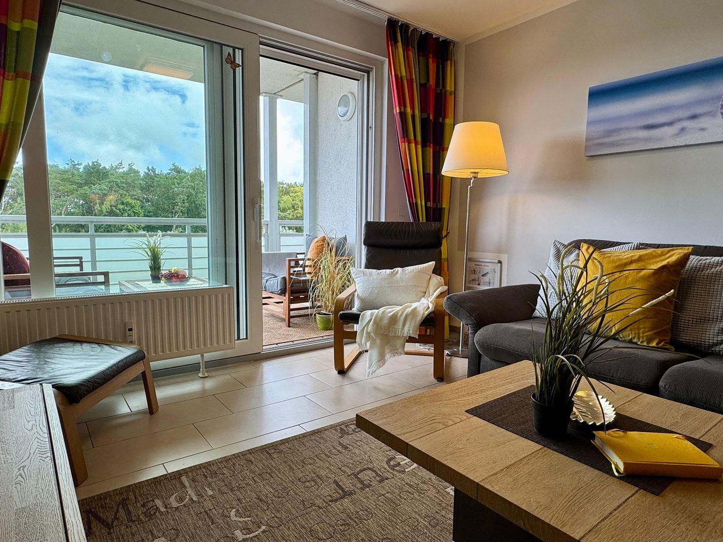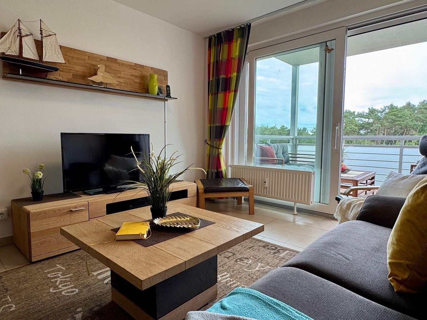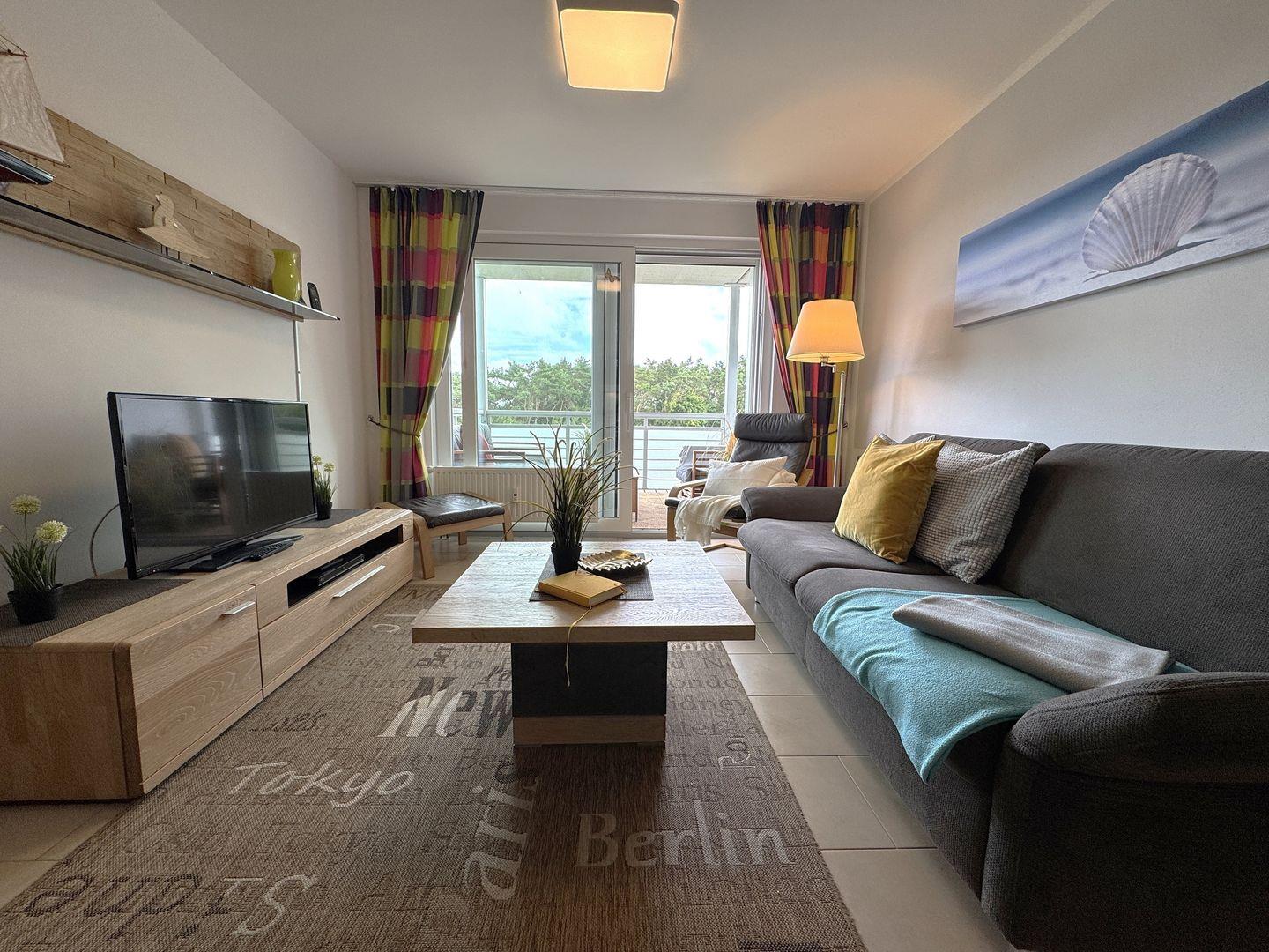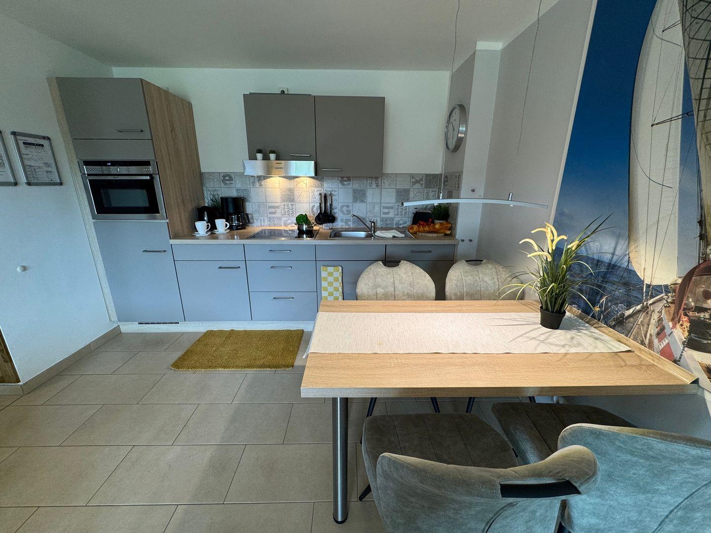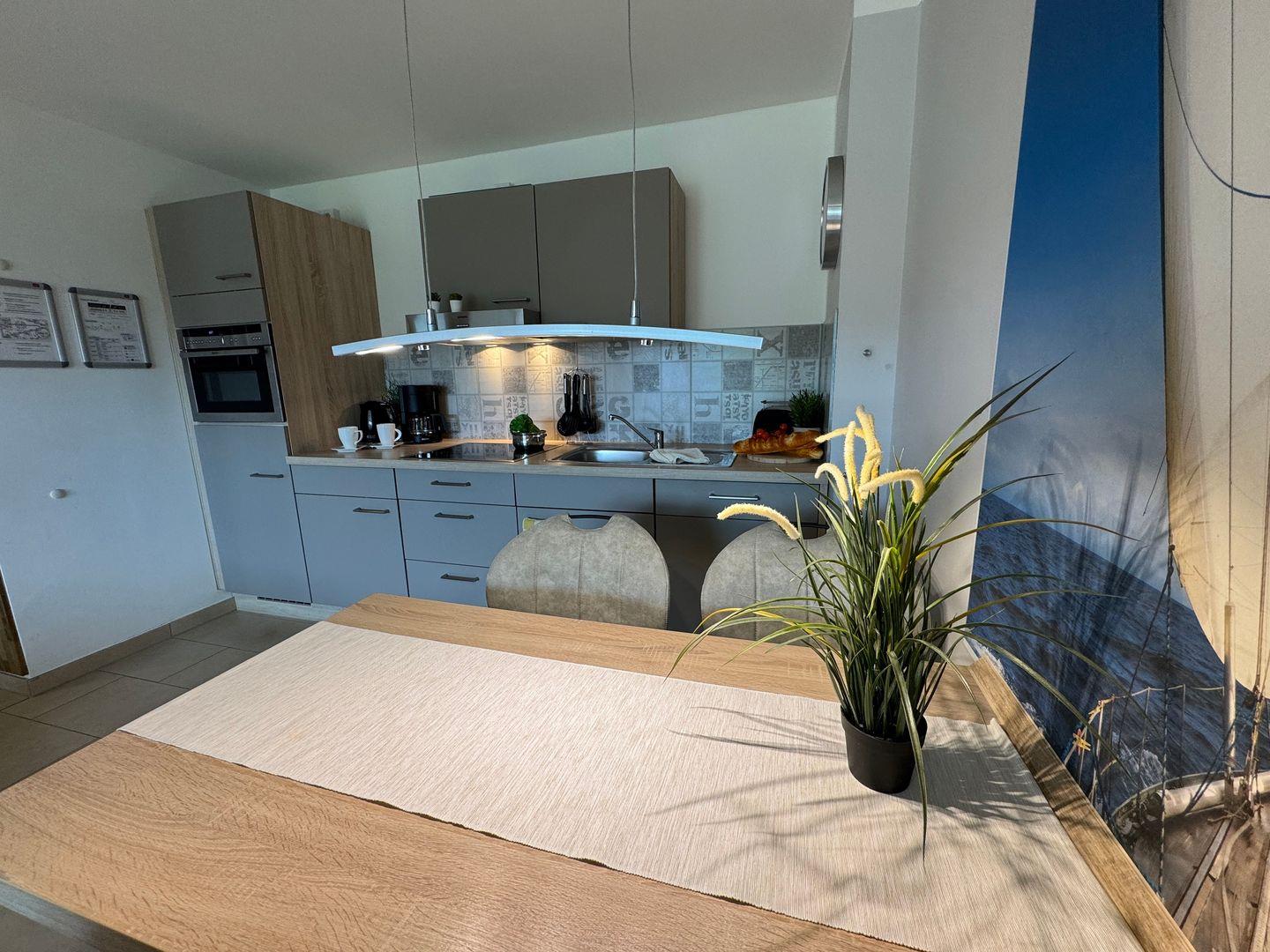 Das Wohnzimmer ist hell und gemütlich eingerichtet. Eine komfortable Schlafcouch (140 × 200 cm) bietet zusätzliche Schlafmöglichkeiten für zwei Personen. Die praktische Küchenzeile ermöglicht es Ihnen, Ihre Mahlzeiten ganz unkompliziert selbst zuzubereiten.