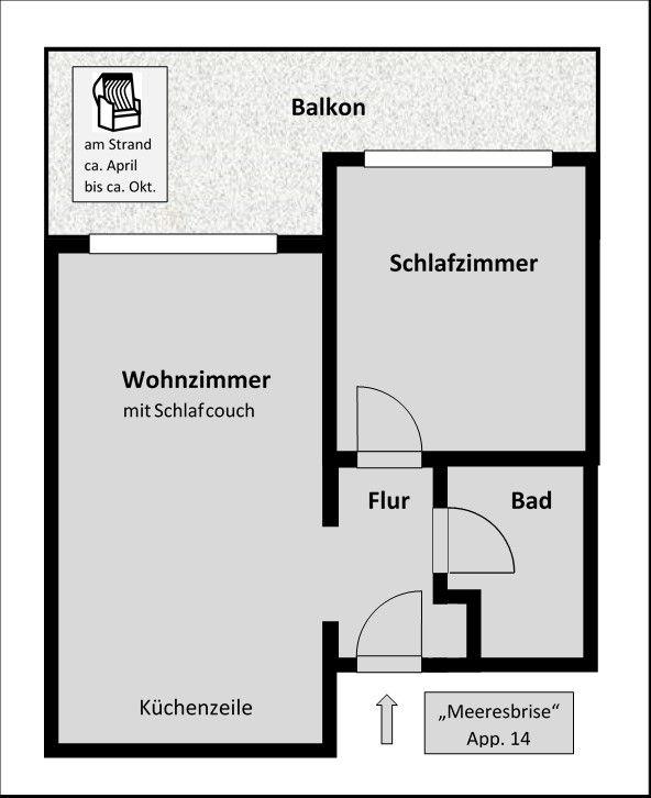 Das Appartement 14 in der Ferienanlage „Käpt’n Brass“ in Dierhagen liegt direkt hinter dem Deich und bietet auf 48 m² Platz für bis zu 4 Personen. Ein Nord-West-Balkon lädt zu entspannten Stunden im Freien ein. Wohnzimmer mit Schlafcouch, Küchenzeile und ein Schlafzimmer mit Doppelbett sorgen für komfortable Urlaubstage. WLAN ist inklusive, Haustiere sind willkommen. Ein Strandkorb am Strand steht saisonal zur Verfügung.