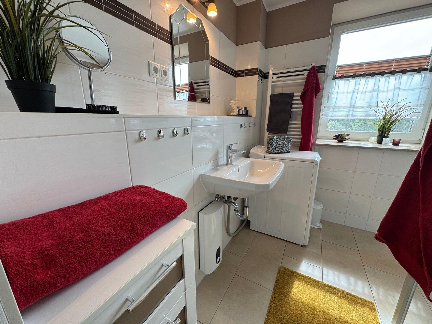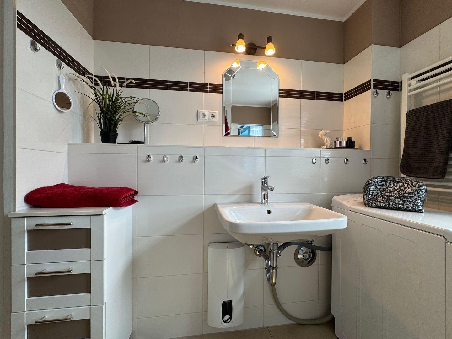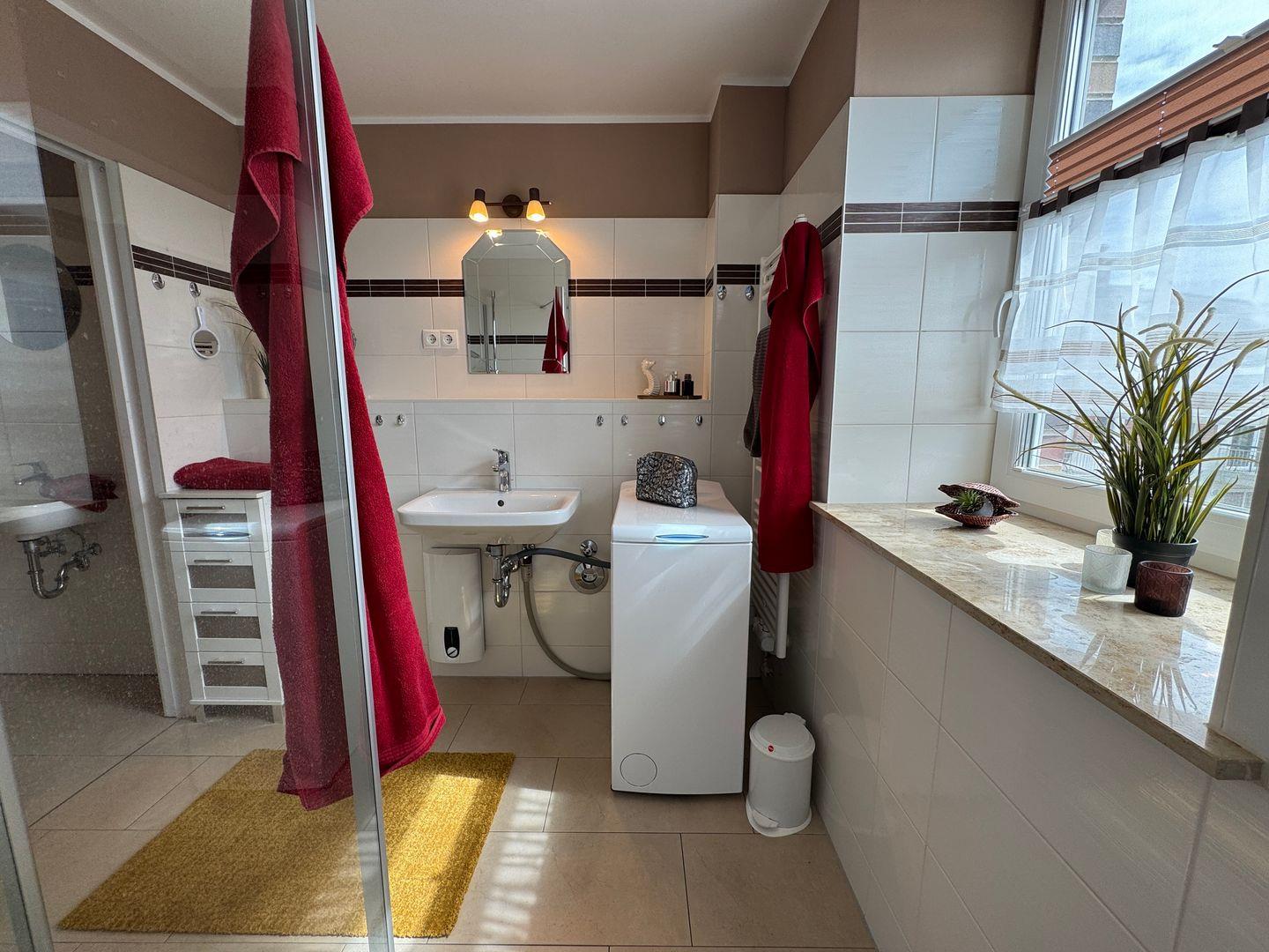 Das moderne Badezimmer ist mit Dusche, WC und einer Waschmaschine ausgestattet und bietet damit zusätzlichen Komfort während Ihres Aufenthalts.