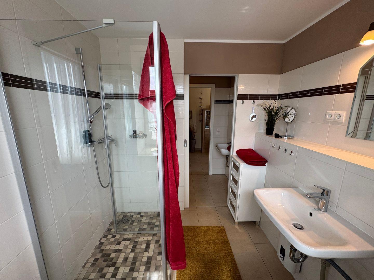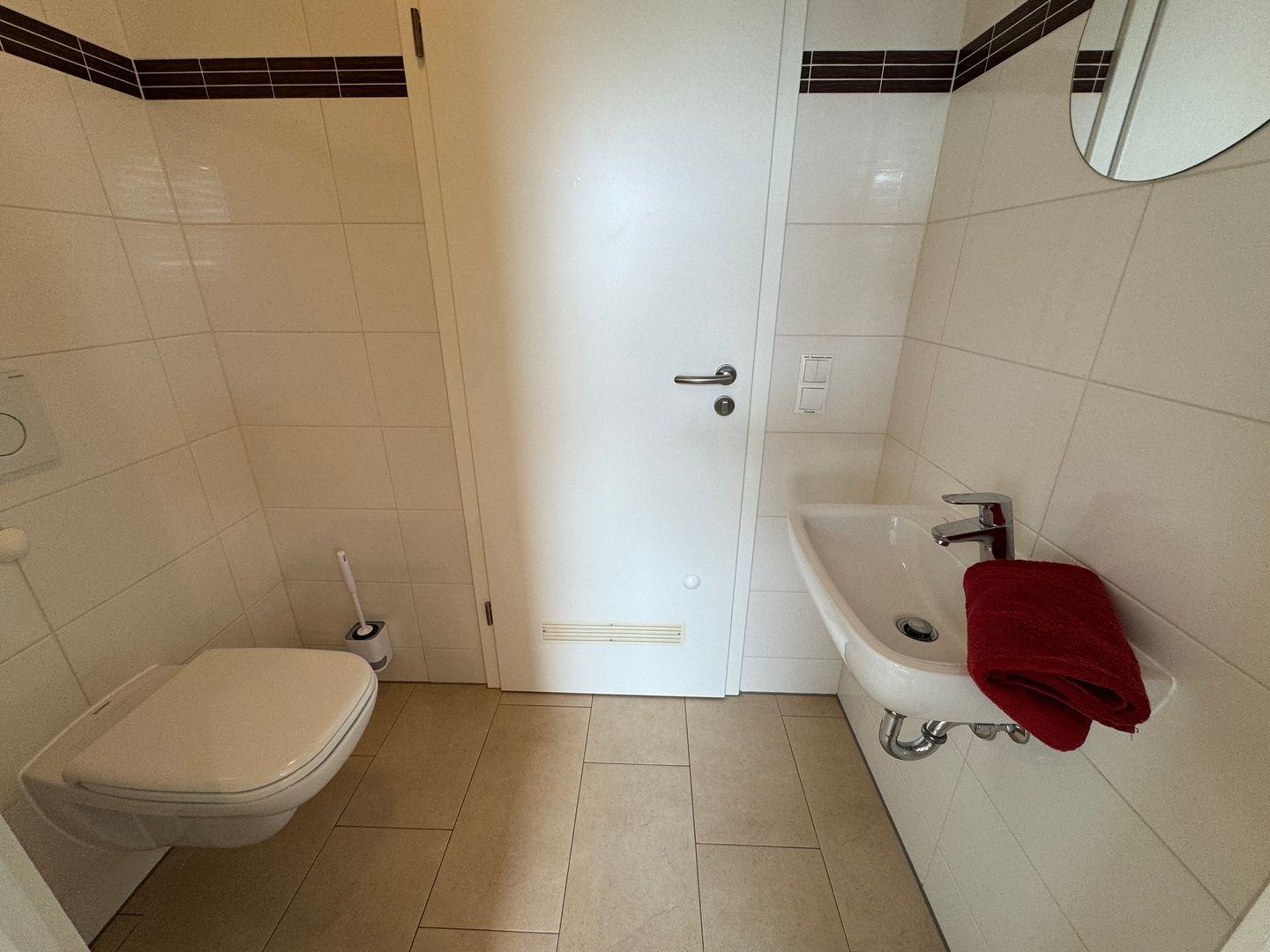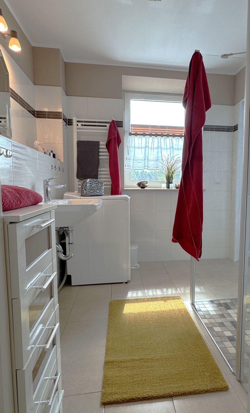 Das moderne Badezimmer ist mit Dusche, WC und einer Waschmaschine ausgestattet und bietet damit zusätzlichen Komfort während Ihres Aufenthalts.