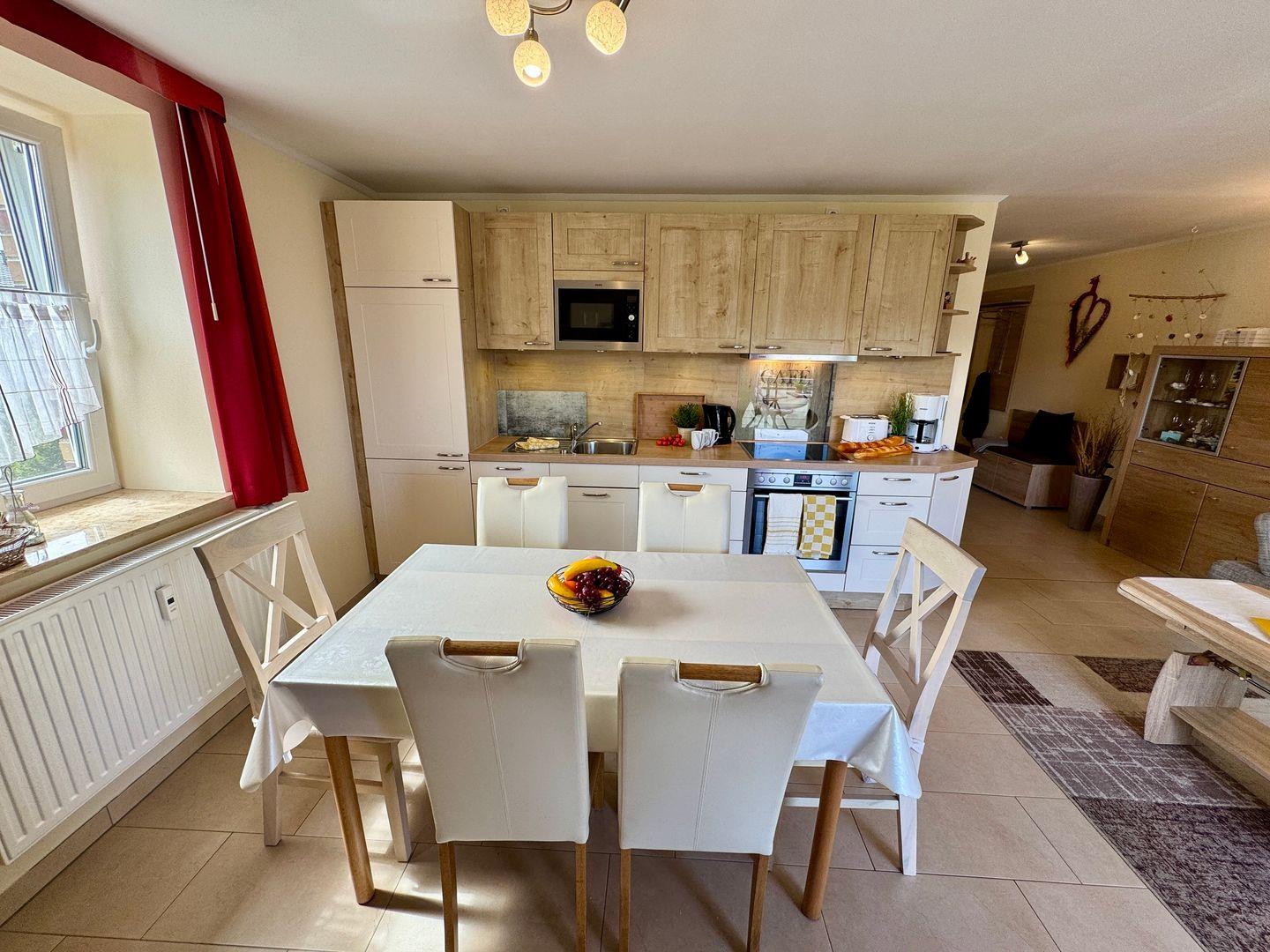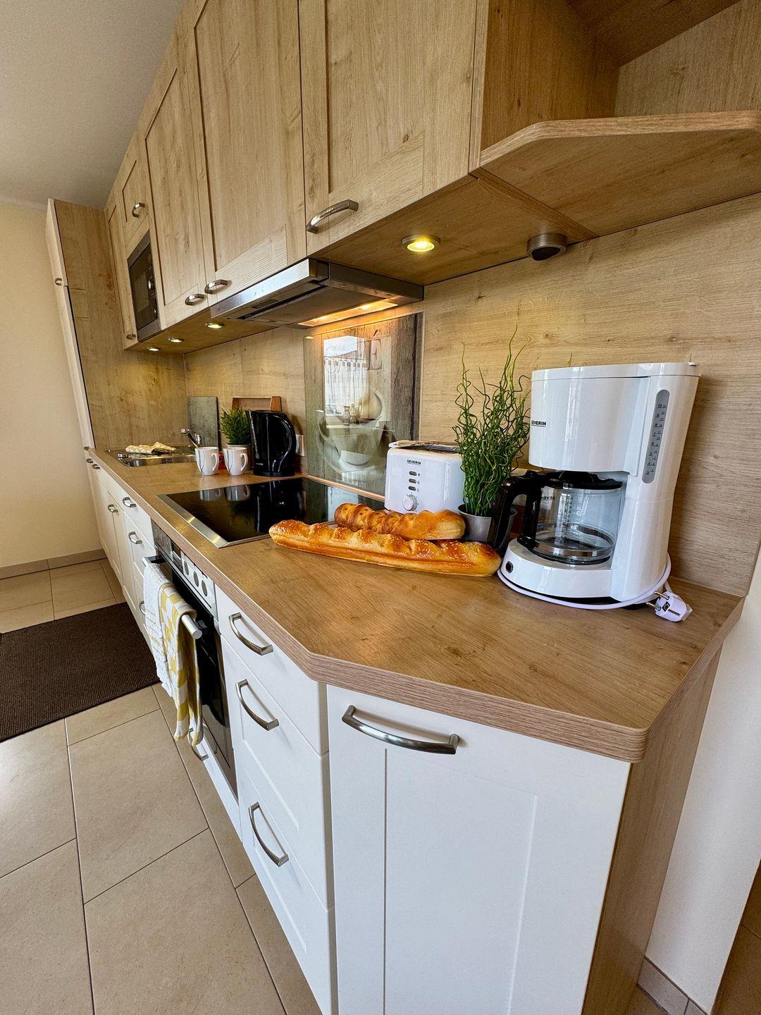Der Wohnbereich ist großzügig gestaltet und bietet mit einer Schlafcouch für zwei Personen sowie einem zusätzlichen Schlafsessel flexible Schlafmöglichkeiten. Die integrierte Küchenzeile ermöglicht eine unkomplizierte Selbstversorgung und bietet alles, was Sie für die Zubereitung Ihrer Mahlzeiten benötigen.