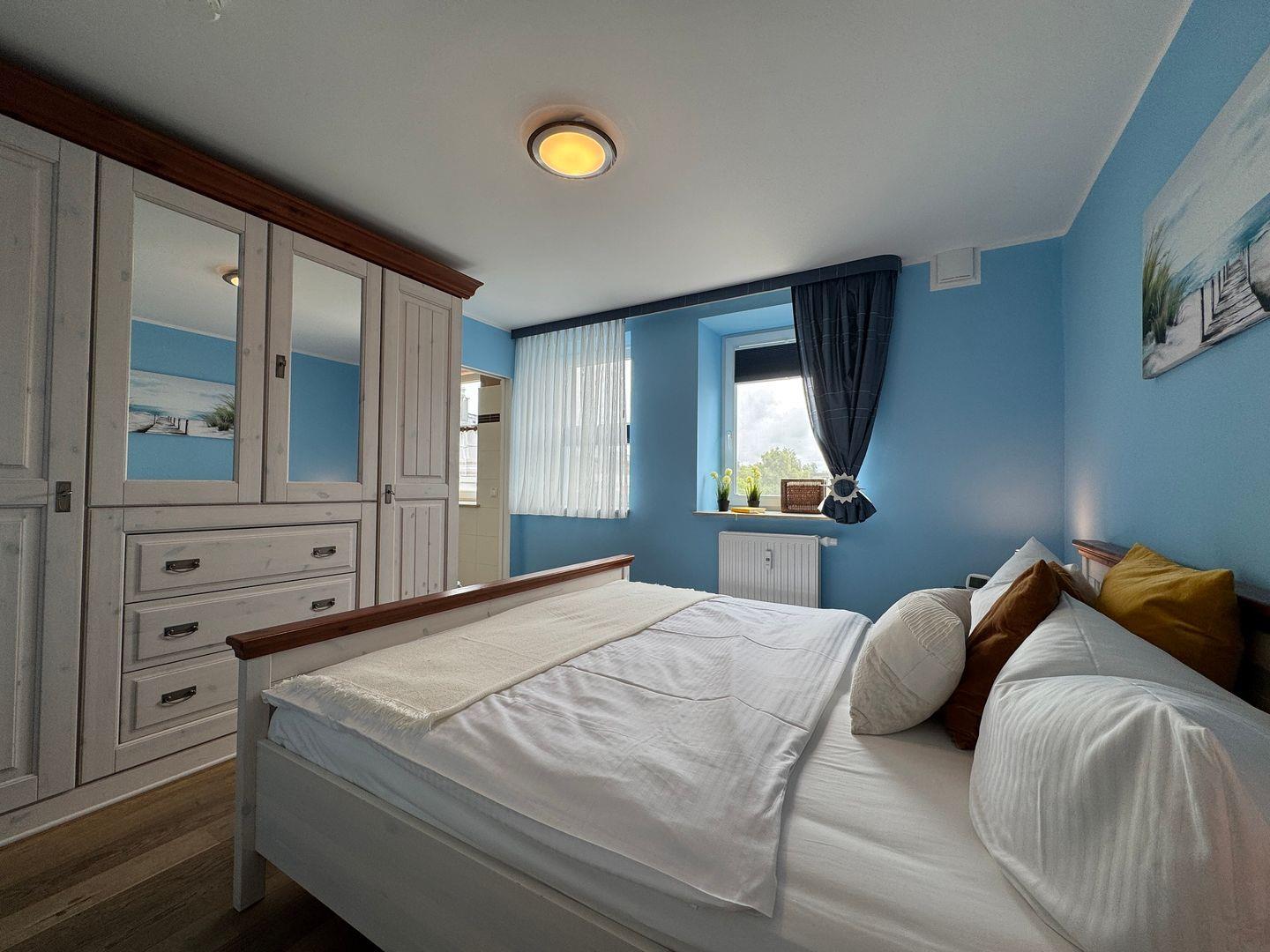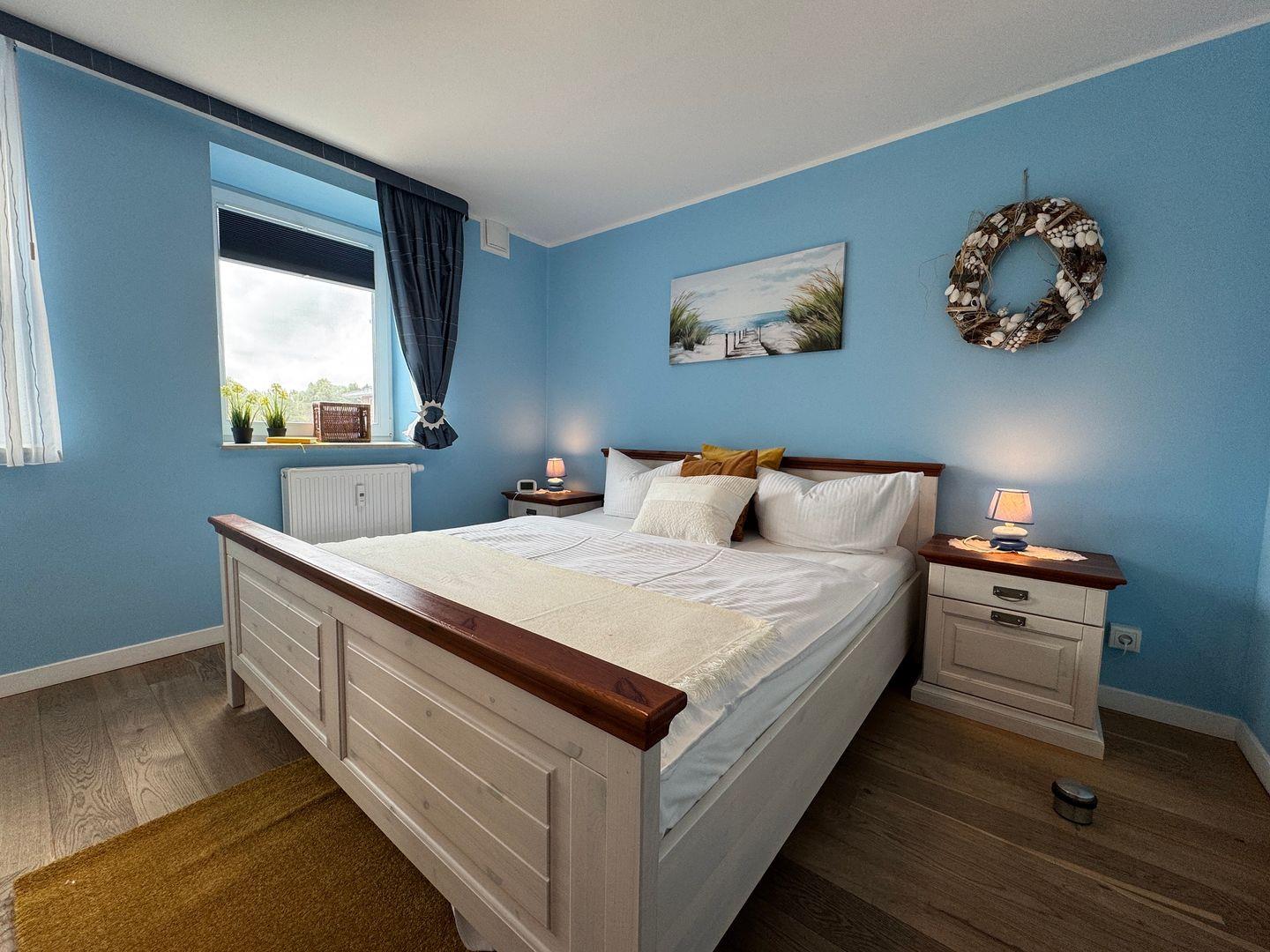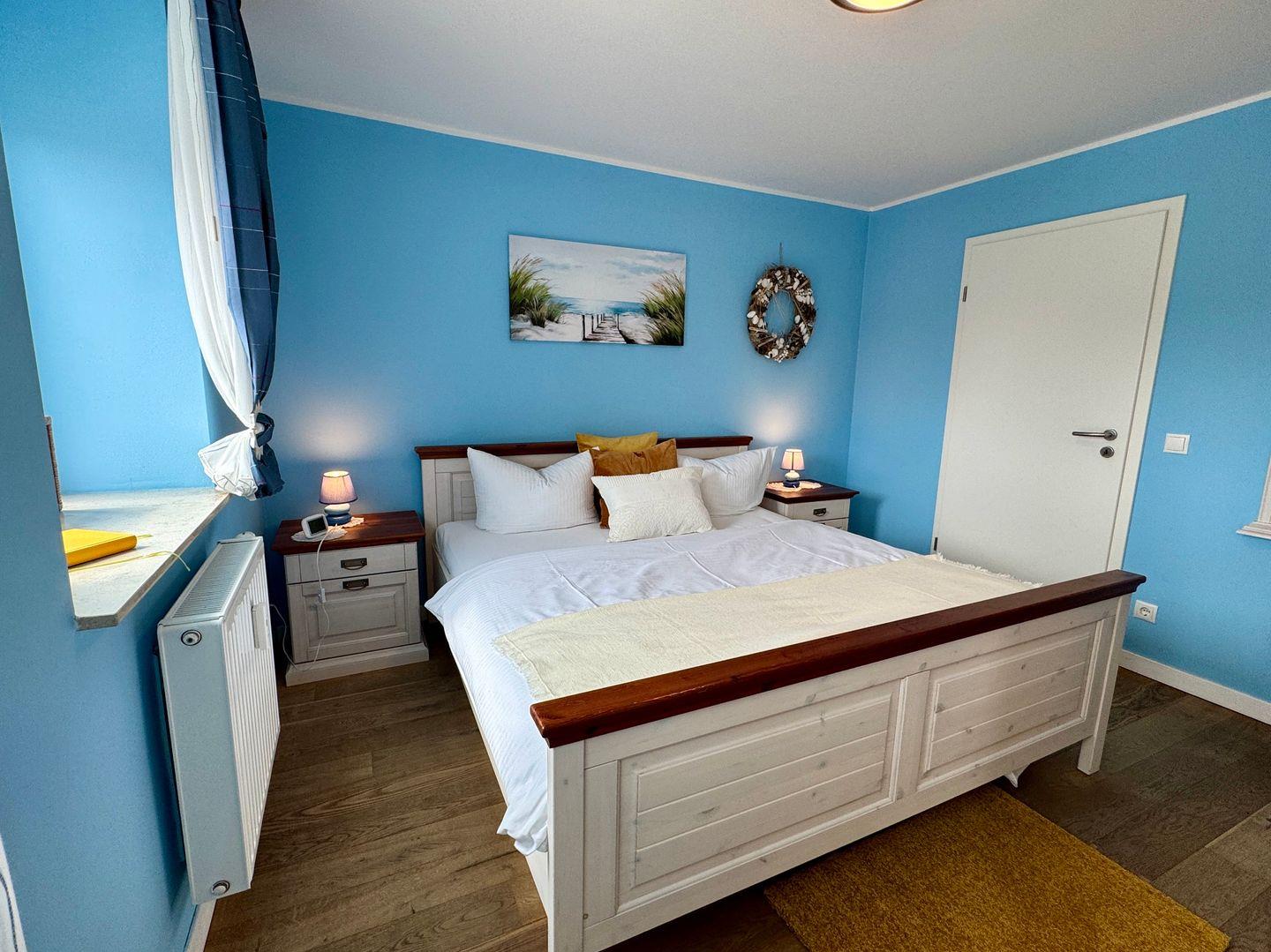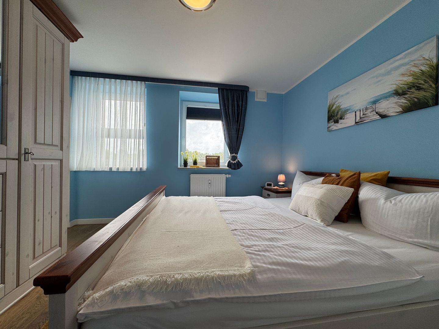 Das separate Schlafzimmer mit komfortablem Doppelbett sorgt für erholsame Nächte und einen ruhigen Rückzugsort nach einem erlebnisreichen Tag an der Ostsee.