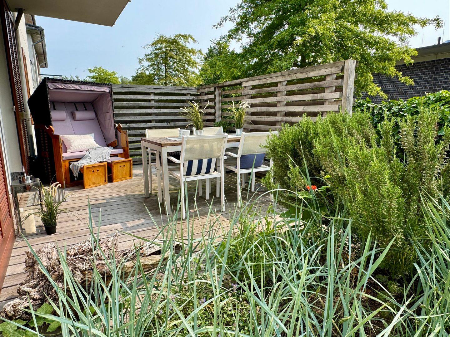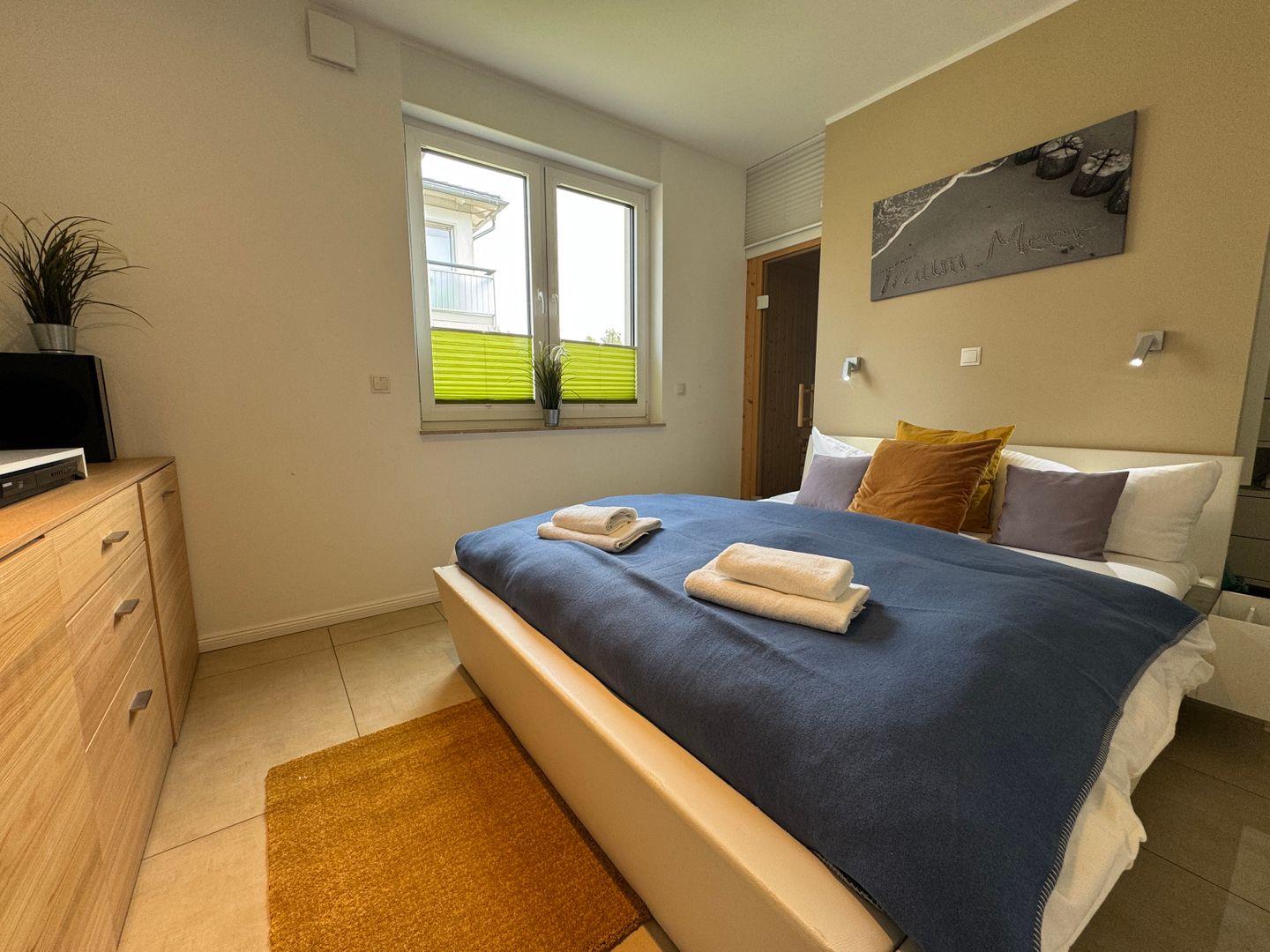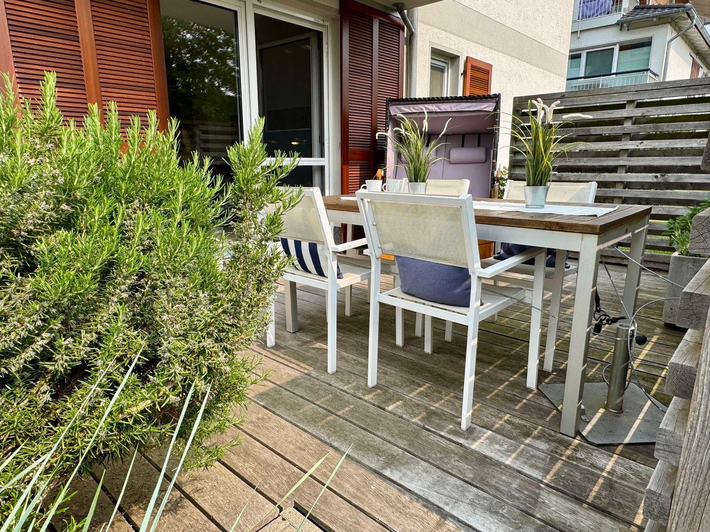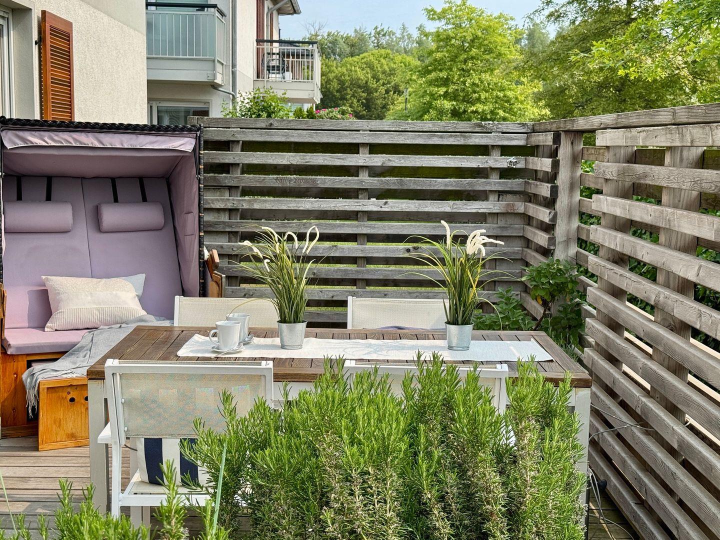 Willkommen in Ihrem gemütlichen Appartement mit einer großzügigen Fläche von 54 qm, ideal für bis zu 4 Personen. Das Appartement befindet sich im Erdgeschoss der Anlage und bietet Ihnen eine einladende Süd-Ost-Terrasse, perfekt für entspannte Stunden im Freien. Im Inneren erwartet Sie ein helles Wohnzimmer, das mit einer komfortablen Schlafcouch ausgestattet ist und nahtlos in die Küchenzeile übergeht. An kühleren Tagen sorgt der Kamin für eine wohlige Wärme und eine behagliche Atmosphäre. Das Schlafzimmer ist mit einem bequemen Doppelbett ausgestattet und bietet Ihnen einen Rückzugsort zum Entspannen. Ein besonderes Highlight ist die private Sauna im Schlafzimmer, die Ihnen die Möglichkeit bietet, nach einem langen Tag zu entspannen. Das Badezimmer verfügt über eine Dusche, WC und eine Waschmaschine, was Ihren Aufenthalt noch komfortabler macht. Ein Pkw-Stellplatz ist direkt auf dem Grundstück vorhanden, ebenso wie ein abschließbarer Schuppen für Ihre Fahrräder. Bitte beachten Sie, dass Haustiere und das Rauchen in diesem Appartement nicht gestattet sind. Für Ihre Unterhaltung und Verbindung zur Außenwelt steht Ihnen kostenfreies W-Lan zur Verfügung. Bettwäsche und ein Handtuchset pro Person sind im Mietpreis enthalten.