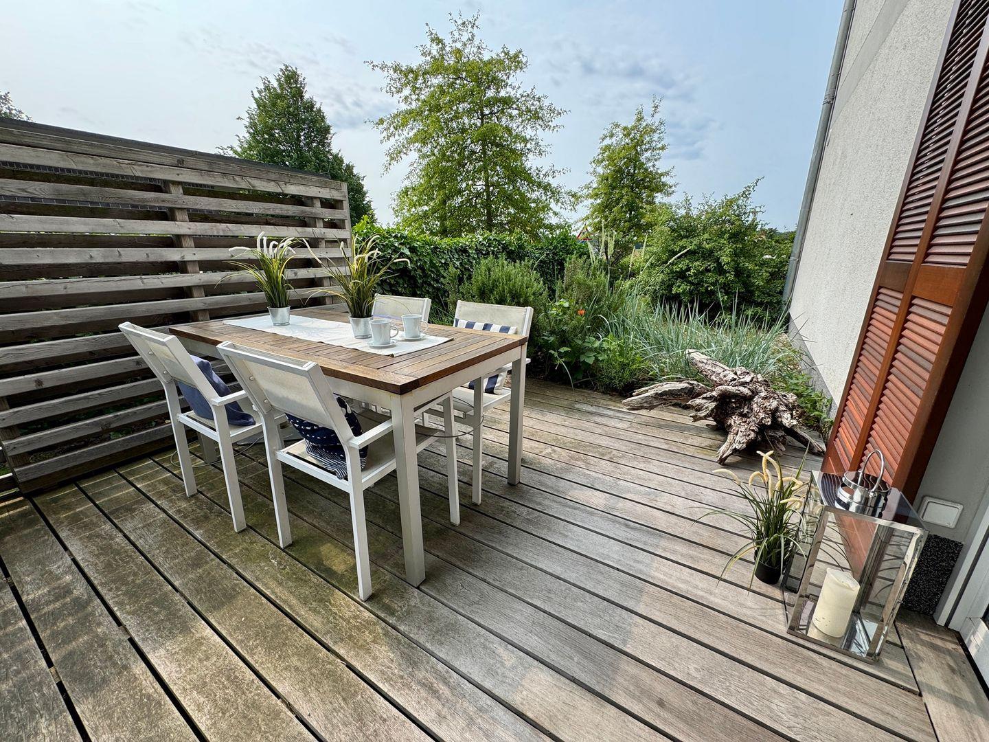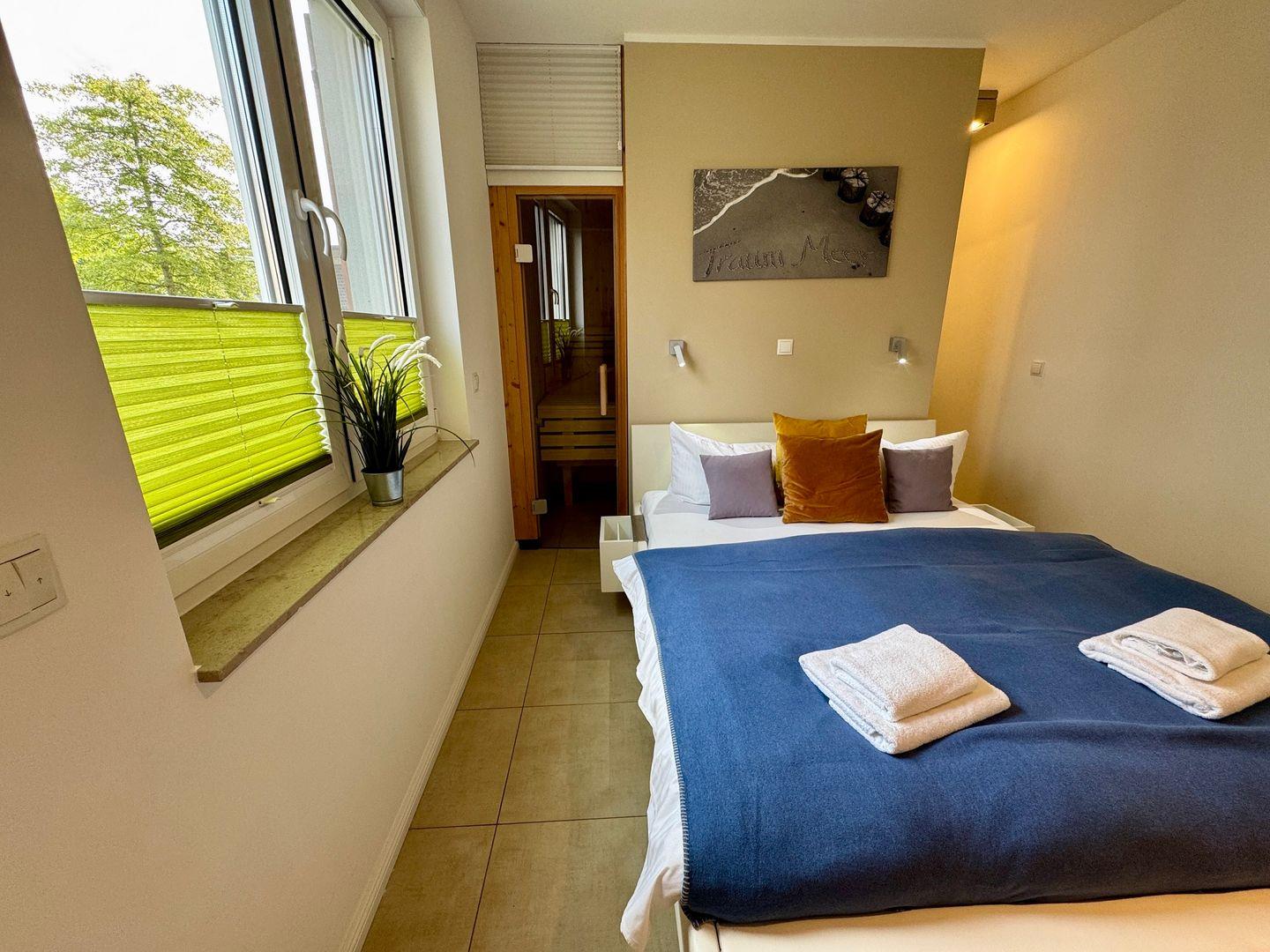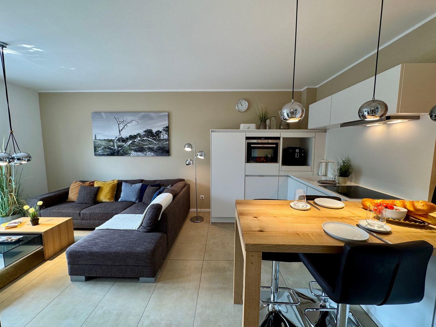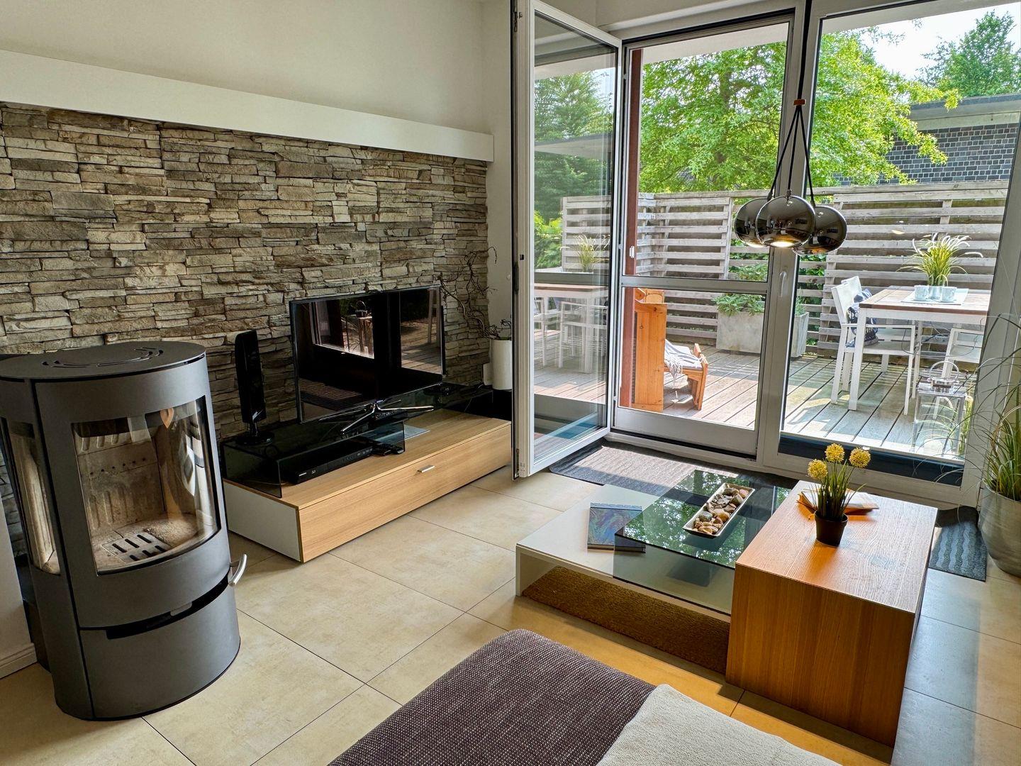 Willkommen in Ihrem gemütlichen Appartement mit einer großzügigen Fläche von 54 qm, ideal für bis zu 4 Personen. Das Appartement befindet sich im Erdgeschoss der Anlage und bietet Ihnen eine einladende Süd-Ost-Terrasse, perfekt für entspannte Stunden im Freien. Im Inneren erwartet Sie ein helles Wohnzimmer, das mit einer komfortablen Schlafcouch ausgestattet ist und nahtlos in die Küchenzeile übergeht. An kühleren Tagen sorgt der Kamin für eine wohlige Wärme und eine behagliche Atmosphäre. Das Schlafzimmer ist mit einem bequemen Doppelbett ausgestattet und bietet Ihnen einen Rückzugsort zum Entspannen. Ein besonderes Highlight ist die private Sauna im Schlafzimmer, die Ihnen die Möglichkeit bietet, nach einem langen Tag zu entspannen. Das Badezimmer verfügt über eine Dusche, WC und eine Waschmaschine, was Ihren Aufenthalt noch komfortabler macht. Ein Pkw-Stellplatz ist direkt auf dem Grundstück vorhanden, ebenso wie ein abschließbarer Schuppen für Ihre Fahrräder. Bitte beachten Sie, dass Haustiere und das Rauchen in diesem Appartement nicht gestattet sind. Für Ihre Unterhaltung und Verbindung zur Außenwelt steht Ihnen kostenfreies W-Lan zur Verfügung. Bettwäsche und ein Handtuchset pro Person sind im Mietpreis enthalten.
