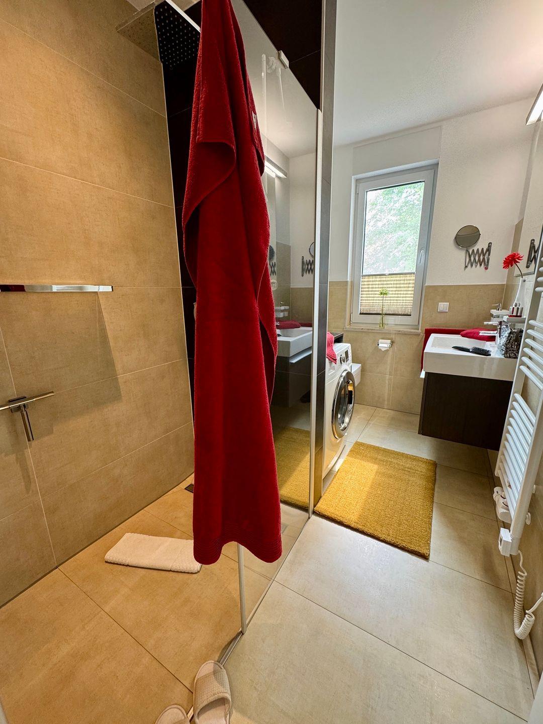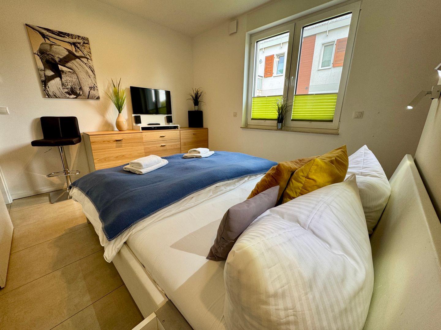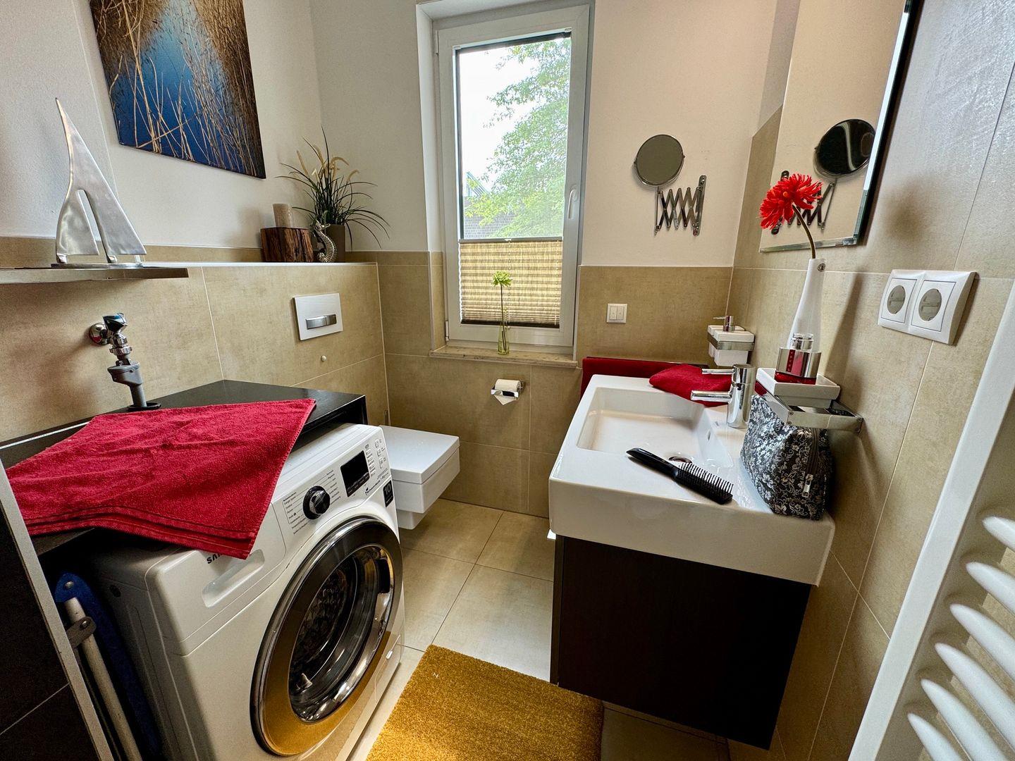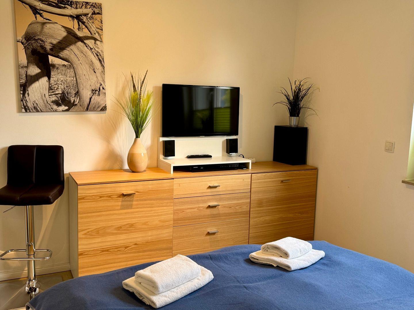 Willkommen in Ihrem gemütlichen Appartement mit einer großzügigen Fläche von 54 qm, ideal für bis zu 4 Personen. Das Appartement befindet sich im Erdgeschoss der Anlage und bietet Ihnen eine einladende Süd-Ost-Terrasse, perfekt für entspannte Stunden im Freien. Im Inneren erwartet Sie ein helles Wohnzimmer, das mit einer komfortablen Schlafcouch ausgestattet ist und nahtlos in die Küchenzeile übergeht. An kühleren Tagen sorgt der Kamin für eine wohlige Wärme und eine behagliche Atmosphäre. Das Schlafzimmer ist mit einem bequemen Doppelbett ausgestattet und bietet Ihnen einen Rückzugsort zum Entspannen. Ein besonderes Highlight ist die private Sauna im Schlafzimmer, die Ihnen die Möglichkeit bietet, nach einem langen Tag zu entspannen. Das Badezimmer verfügt über eine Dusche, WC und eine Waschmaschine, was Ihren Aufenthalt noch komfortabler macht. Ein Pkw-Stellplatz ist direkt auf dem Grundstück vorhanden, ebenso wie ein abschließbarer Schuppen für Ihre Fahrräder. Bitte beachten Sie, dass Haustiere und das Rauchen in diesem Appartement nicht gestattet sind. Für Ihre Unterhaltung und Verbindung zur Außenwelt steht Ihnen kostenfreies W-Lan zur Verfügung. Bettwäsche und ein Handtuchset pro Person sind im Mietpreis enthalten.