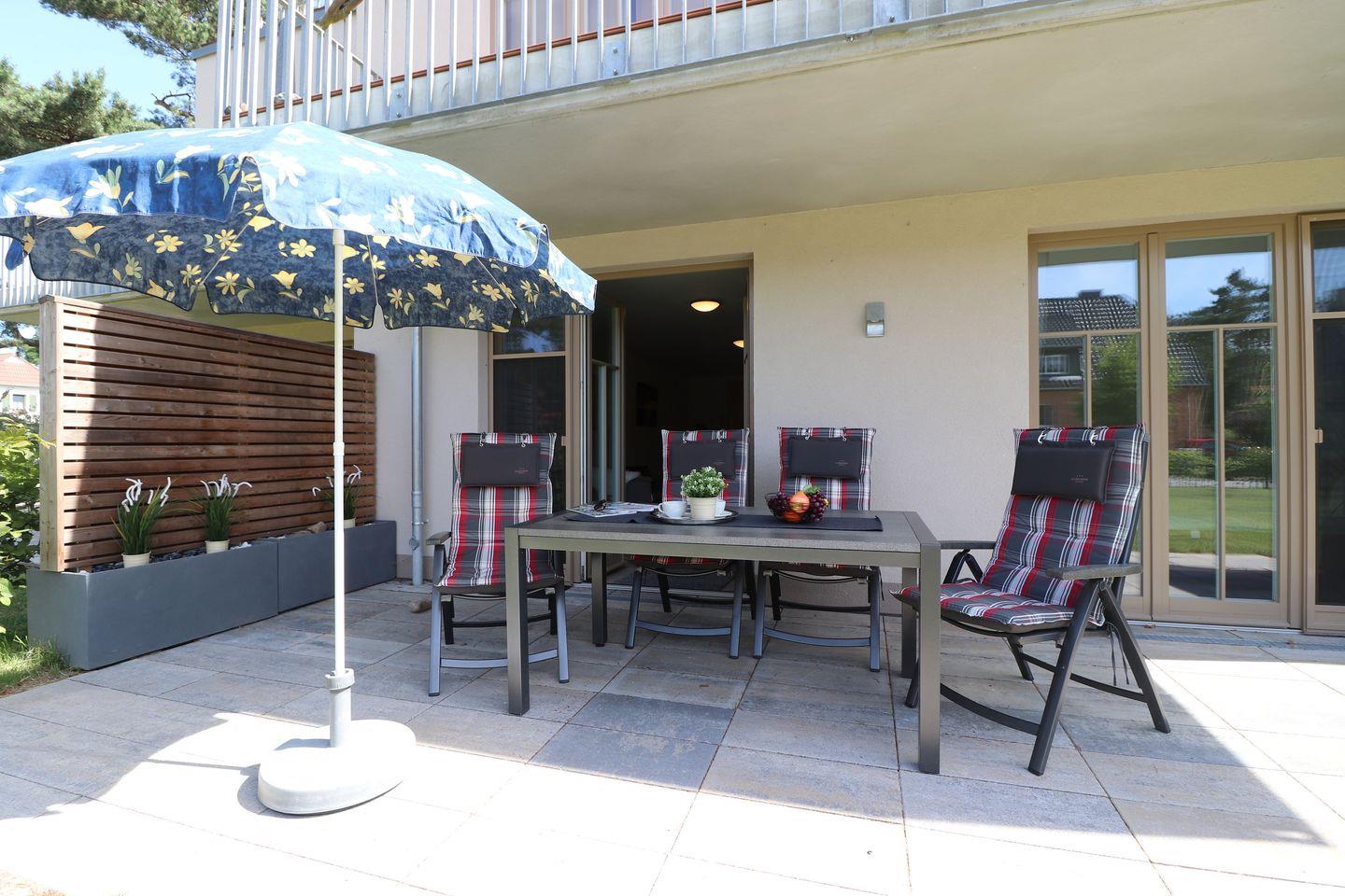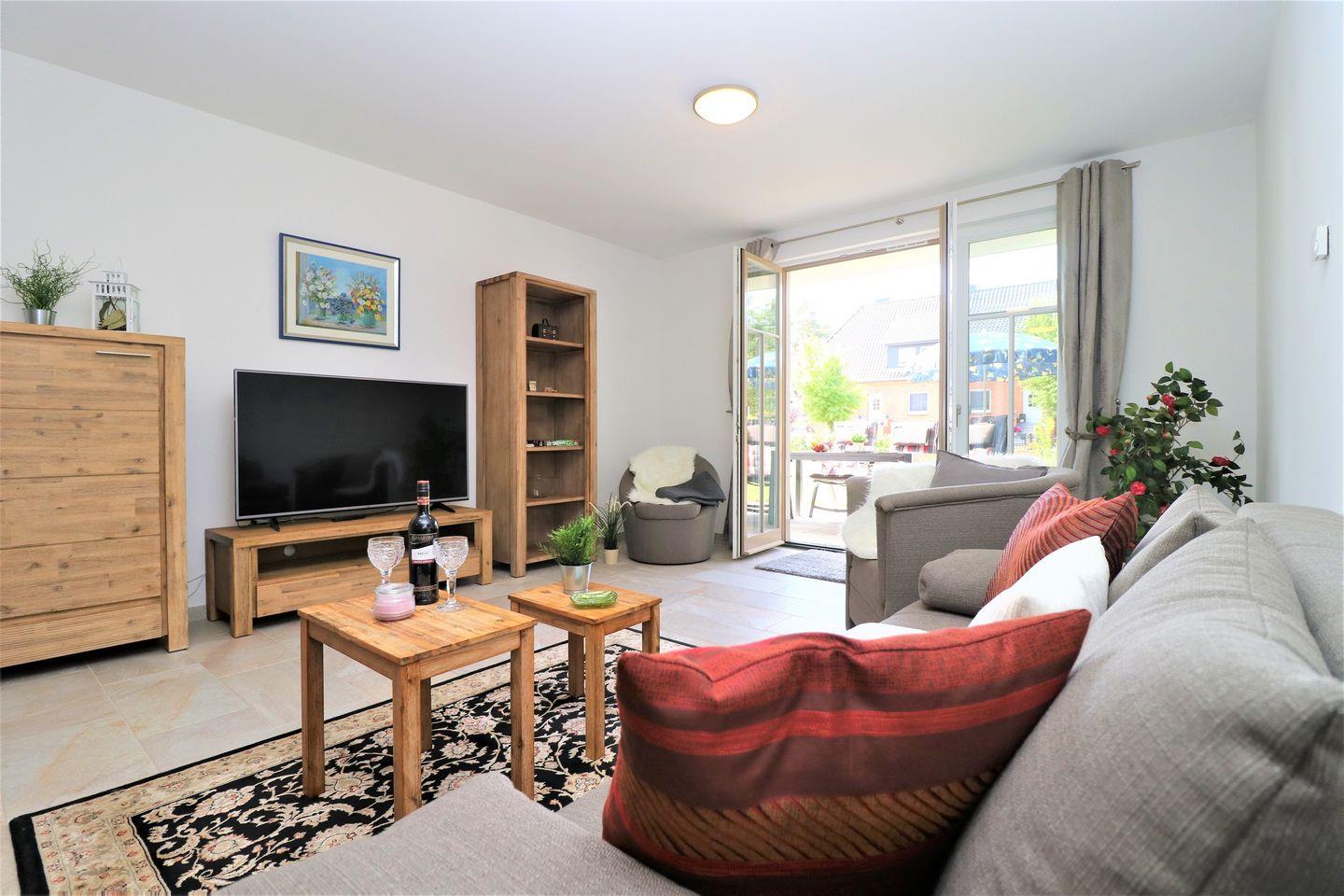Dieses 74 m² große Appartement im Erdgeschoss der Anlage bietet Platz für bis zu 2 Personen und ist der ideale Ort, um sich zu erholen und die Seele baumeln zu lassen. Die Süd-Terrasse ermöglicht es Ihnen, den ganzen Tag über die Sonne zu genießen und entspannte Stunden im Freien zu verbringen. Das helle und großzügige Wohnzimmer ist mit einer integrierten Küchenzeile ausgestattet, die es Ihnen ermöglicht, während Ihres Aufenthalts leckere Mahlzeiten zuzubereiten. Im Schlafzimmer erwartet Sie ein gemütliches Doppelbett, das für einen erholsamen Schlaf sorgt und Ihnen die nötige Ruhe bietet. Für Ihr Fahrzeug steht ein Stellplatz innerhalb der Anlage zur Verfügung, sodass Sie bequem parken können. Haustiere sind in diesem Appartement herzlich willkommen, damit auch Ihr vierbeiniger Begleiter einen angenehmen Aufenthalt genießen kann. Das Rauchen ist im Appartement jedoch nicht gestattet. Kostenfreies W-LAN ist im gesamten Appartement verfügbar, sodass Sie jederzeit in Kontakt mit Ihren Lieben bleiben können.