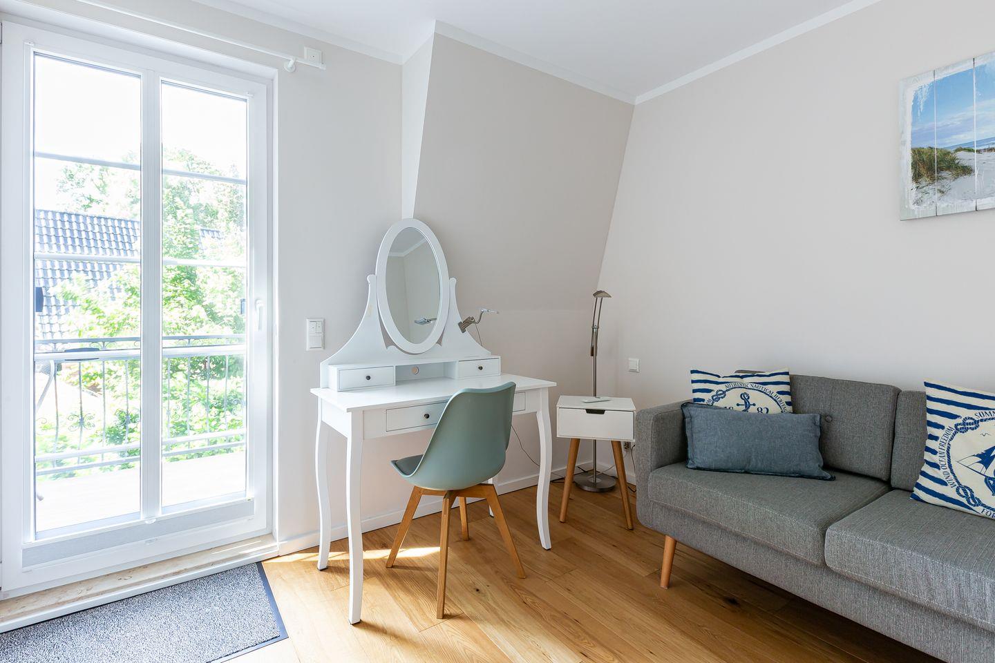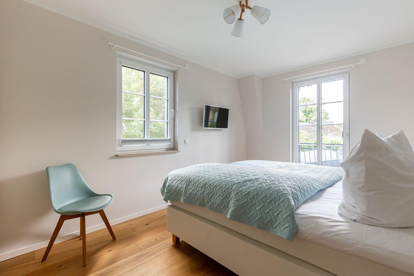 Das Obergeschoss bietet zwei liebevoll eingerichtete Schlafzimmer, die Ruhe und Erholung versprechen. Ein weiteres Highlight ist das gemütliche Lese- und Fernsehzimmer, das mit seinem Zugang zum Balkon einen idealen Rückzugsort für entspannte Stunden mit einem guten Buch oder einem Film bietet. Ein weiteres stilvolles Badezimmer mit Dusche rundet den Komfort in der oberen Etage ab.