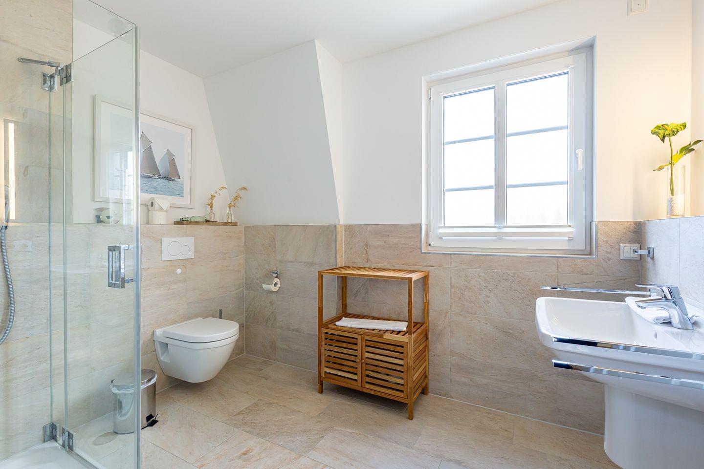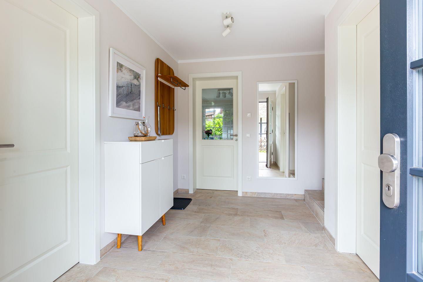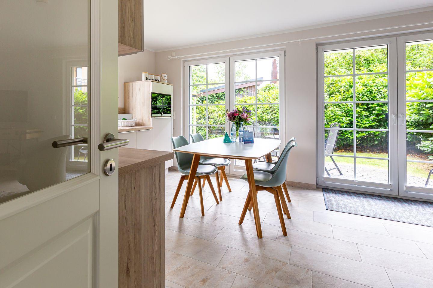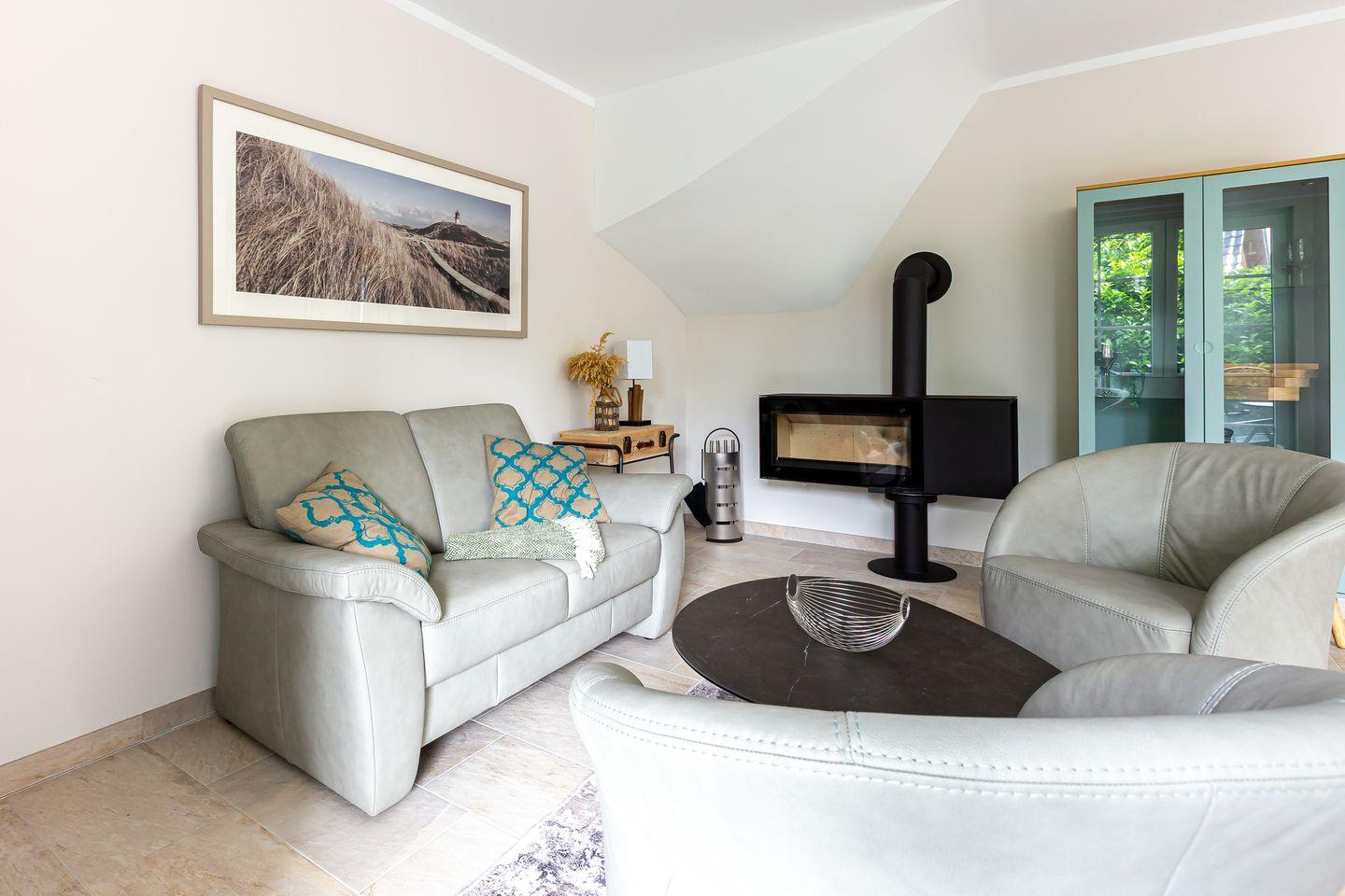 Die wunderschöne Doppelhaushälfte bietet Platz für bis zu vier Personen und besticht durch ihre großzügigen, lichtdurchfluteten Räume im Seaside-Stil. Im Erdgeschoss befindet sich der einladende Wohn- und Essbereich mit direktem Zugang zur Terrasse. Hier könnt ihr bei einer Tasse Kaffee den Tag beginnen oder nach einem langen Strandspaziergang die Abendsonne genießen. Die offene Gestaltung des Wohnraums schafft eine warme und entspannte Atmosphäre, in der ihr euch sofort wohlfühlen werdet. Zudem befindet sich im Erdgeschoss ein modernes Badezimmer mit Sauna und Dusche.