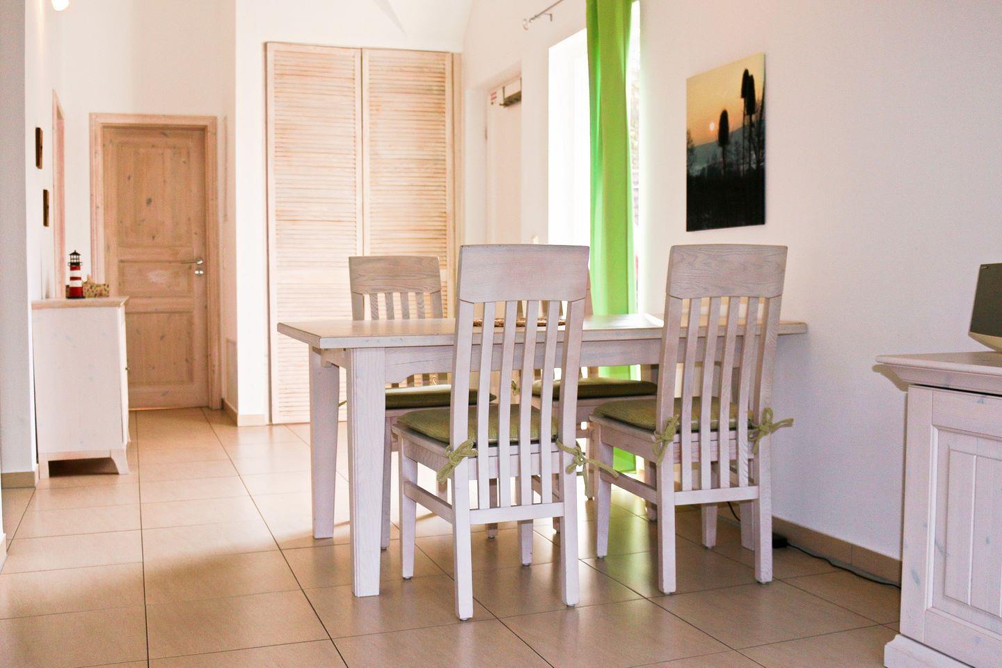Eine voll ausgestattete Küche mit Cremesso-Kaffeekapselmaschine, Toaster, Wasserkocher, Backofen, Mikrowelle, Geschirrspüler, Tiefkühlfach und Waschmaschine gehört zur weiteren Ausstattung der familienfreundlichen Ferienwohnung. Ein Kinderbett kann gegen Entgelt im Schlafzimmer aufgestellt werden. Ein Hochstuhl befindet sich im Apartment.