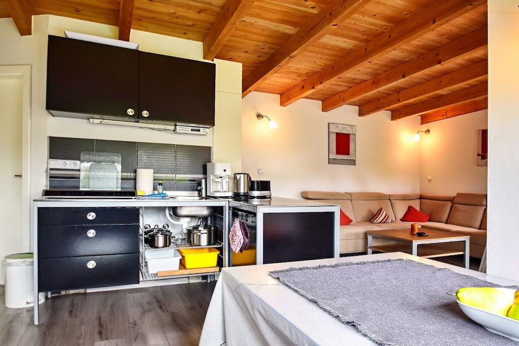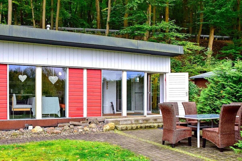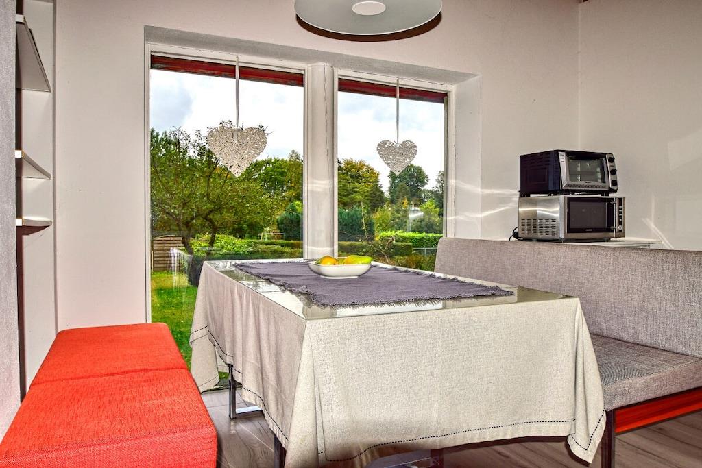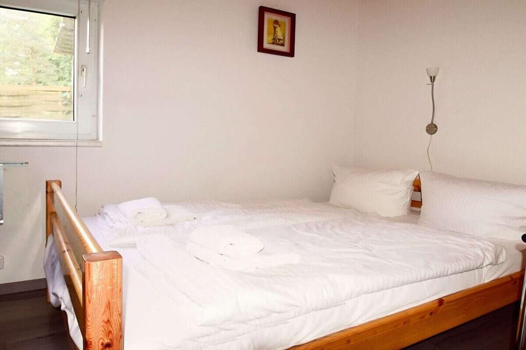 Vores idylliske strandhus er perfekt til både elskende og eventyrlystne. Dette lille paradis ligger på en stor, grøn grund i rolige, naturlige omgivelser. Slap af på den 130 cm brede sovesofa. De to separate soveværelser har hver en 140 cm bred dobbeltseng med plads til op til 6 personer. En pejs indbyder til romantiske øjeblikke eller kølige aftener. Badeværelset har toilet og bruser. Vores faciliteter inkluderer alt, hvad du behøver: LED-tv, gratis Wi-Fi, køkken med køleskab, to induktionskogeplader, mikrobølgeovn, grill, kaffemaskine, brødrister, elkedel og køkkenredskaber.
