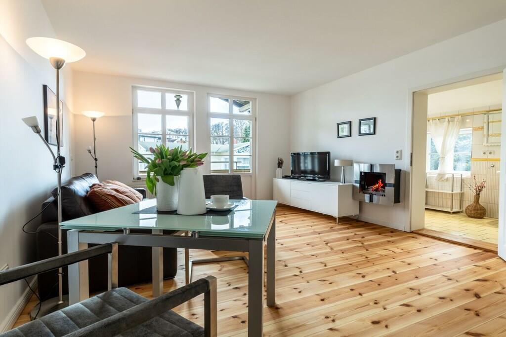 Sie wohnen in der idyllischen Wohnung Kajüte in der 1. Etage einer liebevoll sanierten Villa, in ruhiger und zentraler Lage. Zum Strand sind es nur ca. 100 Meter. Das Appartement ist 51 qm groß und mit modernen Möbeln ausgestattet. Der moderne Bio-Kamin lädt zum Ausklang eines romantischen Abends ein. Es bietet insgesamt zwei Schlafplätze (Doppelbett 140x200) im separaten Schlafzimmer. Im modernen Bad sind ein Bidet, eine Dusche und eine Badewanne vorhanden. Eine großzügige offene Balkonveranda, in Südostausrichtung, lädt zum Verweilen ein. Einen separaten Stellplatz finden Sie hinter der Villa. Fahrräder können untergestellt werden. Auf dem Grundstück der Villa gibt es vier weitere Wohneinheiten die auch zusammen gebucht werden können.
