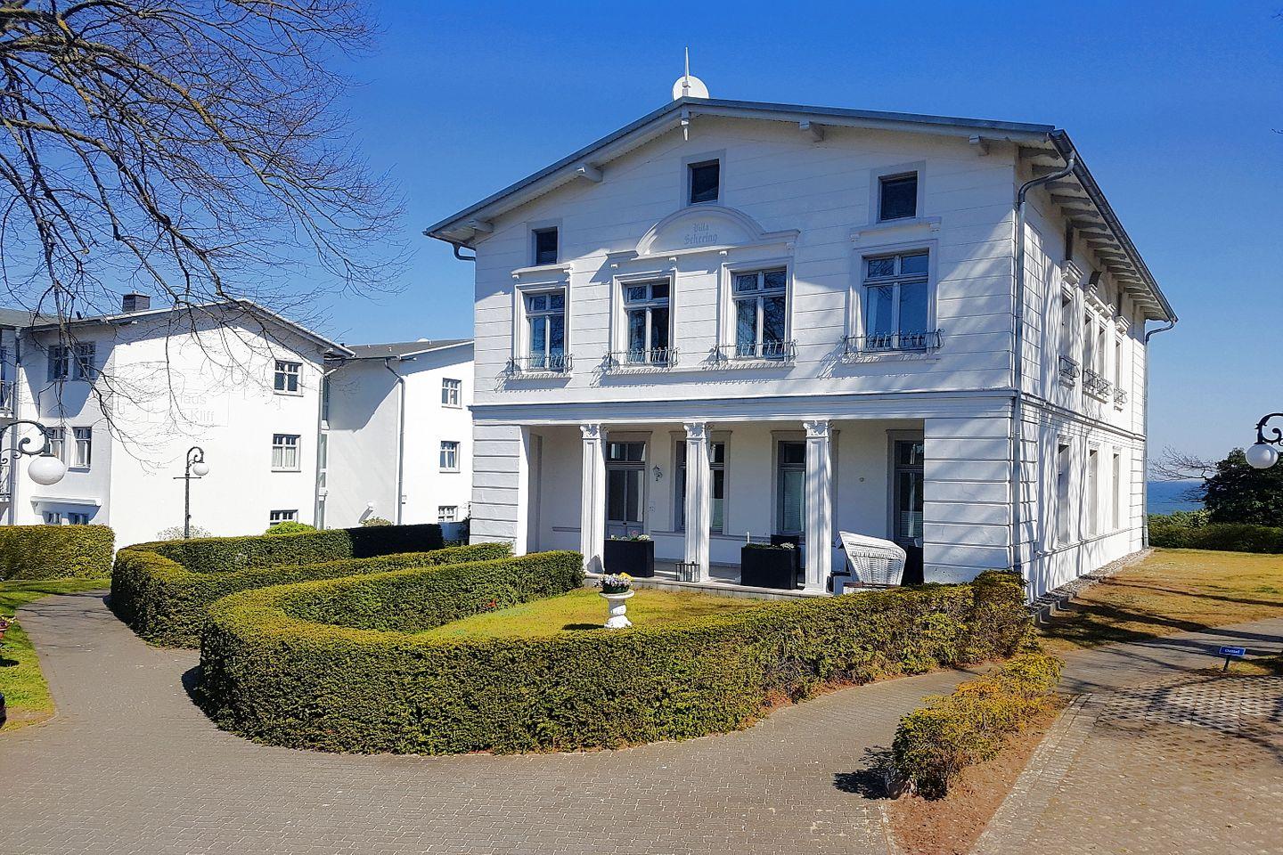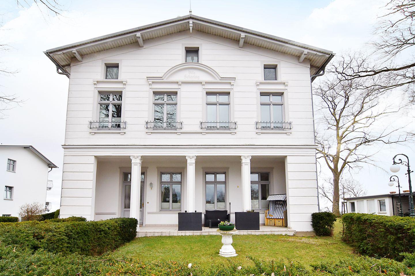 Die Villa Schering wurde nach der Wiedervereinigung im Stil der Bäderarchitektur renoviert und liegt zusammen mit dem Haus am Kliff in erster Reihe direkt an der Steilküste zur Ostsee auf der alten Düne dem "Kulm". Das 70 m² große Appartement befindet sich im Ergeschoss der Villa und verfügt neben einer sehr großen Süd-Terrasse und eigenen Gartenbereich mit Strandkorb über ein großzügiges Wohnzimmer mit voll ausgestatteter Küchenzeile und Essplatz, ein Duschbad und zwei Schlafzimmer (Doppelbett und zwei Einzelbetten). Es stehen ein PKW-Stellplatz und kostenfreies WLAN zur Verfügung. Haustiere sind auf Anfrage gestattet.