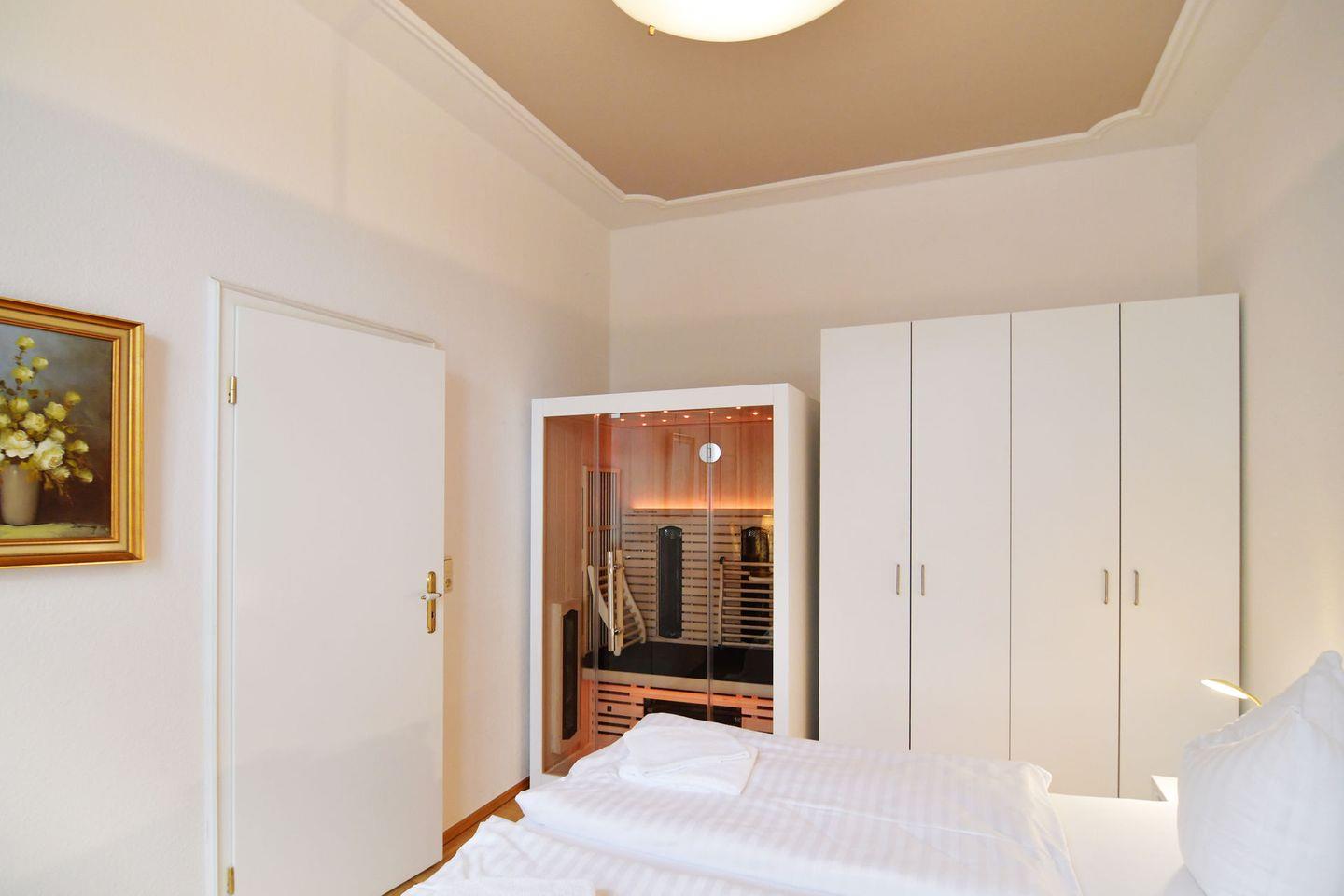 Als Besonderheit steht in dieser Wohnung eine für 2 Personen ausgelegte Infrarotsauna zur Verfügung. Für das Wohlergehen sorgen individuell einstellbare Strahler und eine professionelle LED-Farbtherapie mit Sternenhimmel.