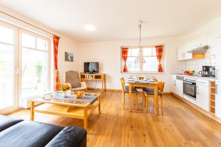Die Wohnung ist im guten Standard mit hellen Holzmöbeln eingerichtet. Im Wohnbereich gibt es neben einer Sofaecke mit Flachbild-TV eine integrierte Einbauküche mit Kühlschrank, Geschirrspüler, Backofen, Ceranfeld, Kaffeemaschine, Wasserkocher, Geschirr und Besteck einen Esstisch.