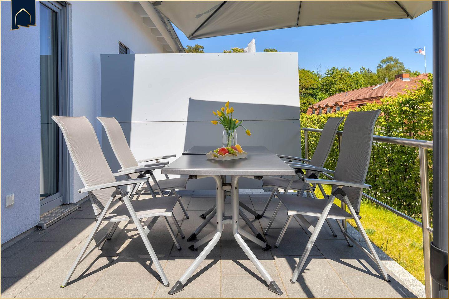 Im gepflegten Garten finden Sie eine überdachte Terrasse mit modernen Gartenmöbeln, Sonnenliegen und Sonnenschirm – perfekt für ein Frühstück an der frischen Ostseeluft oder entspannte Abende mit einem Glas Wein. Für den Strandtag steht Ihnen ein Strandkorb am nahegelegenen Sandstrand (nur 700?m entfernt!) kostenfrei zur Verfügung.