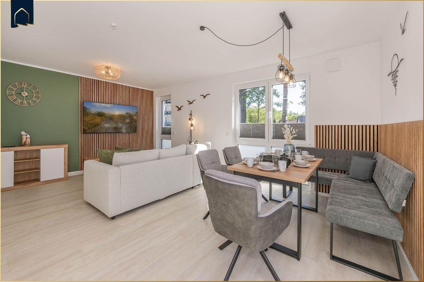 Diese frisch renovierte Ferienwohnung auf Usedom überzeugt mit stilvollem Ambiente und einer durchdachten Raumaufteilung. Auf großzügigen 93?m² bietet das Appartement Platz für bis zu vier Personen und eignet sich ideal für Familien, Paare oder Freunde. Zwei Schlafzimmer, ein modernes Duschbad sowie ein separates Gäste-WC sorgen für Komfort und Privatsphäre. Der lichtdurchflutete Wohnbereich lädt mit gemütlicher Sofaecke und TV zum Entspannen ein. Große Fenster, ein Ganzkörperspiegel und hochwertige Ausstattung schaffen eine freundliche Atmosphäre.