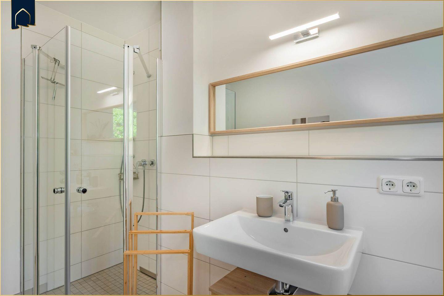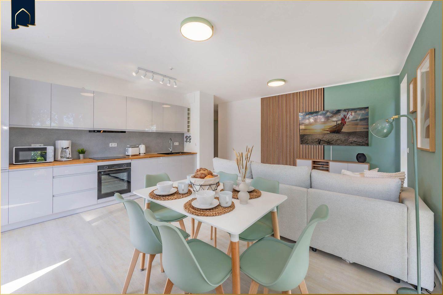 Die offene, voll ausgestattete Küche lässt keine Wünsche offen: Ein Herd mit Backofen, Mikrowelle, Kühlschrank mit Gefrierfach, Spülmaschine, Kaffeemaschine, Toaster, Wasserkocher und reichlich Küchenutensilien stehen zur Verfügung. Auch ein Gäste-WC ergänzt das moderne Badezimmer mit Dusche, Waschbecken und Haartrockner – ideal bei Belegung mit mehreren Personen. Brettspiele und Bücher sorgen für Unterhaltung an Regentagen, während drei Fernseher in der Wohnung individuelle Rückzugsmöglichkeiten bieten. Ein Ganzkörperspiegel, Kosmetikspiegel, Garderobe und weitere durchdachte Details machen den Aufenthalt besonders angenehm.