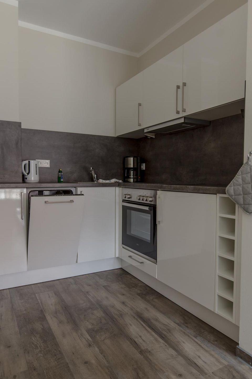 Offene Küchenzeile im Wohnraum mit Ceranfeld, Backofen, Geschirrspüler, Kühlschrank mit Gefrierfach