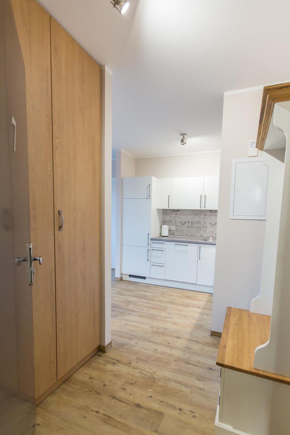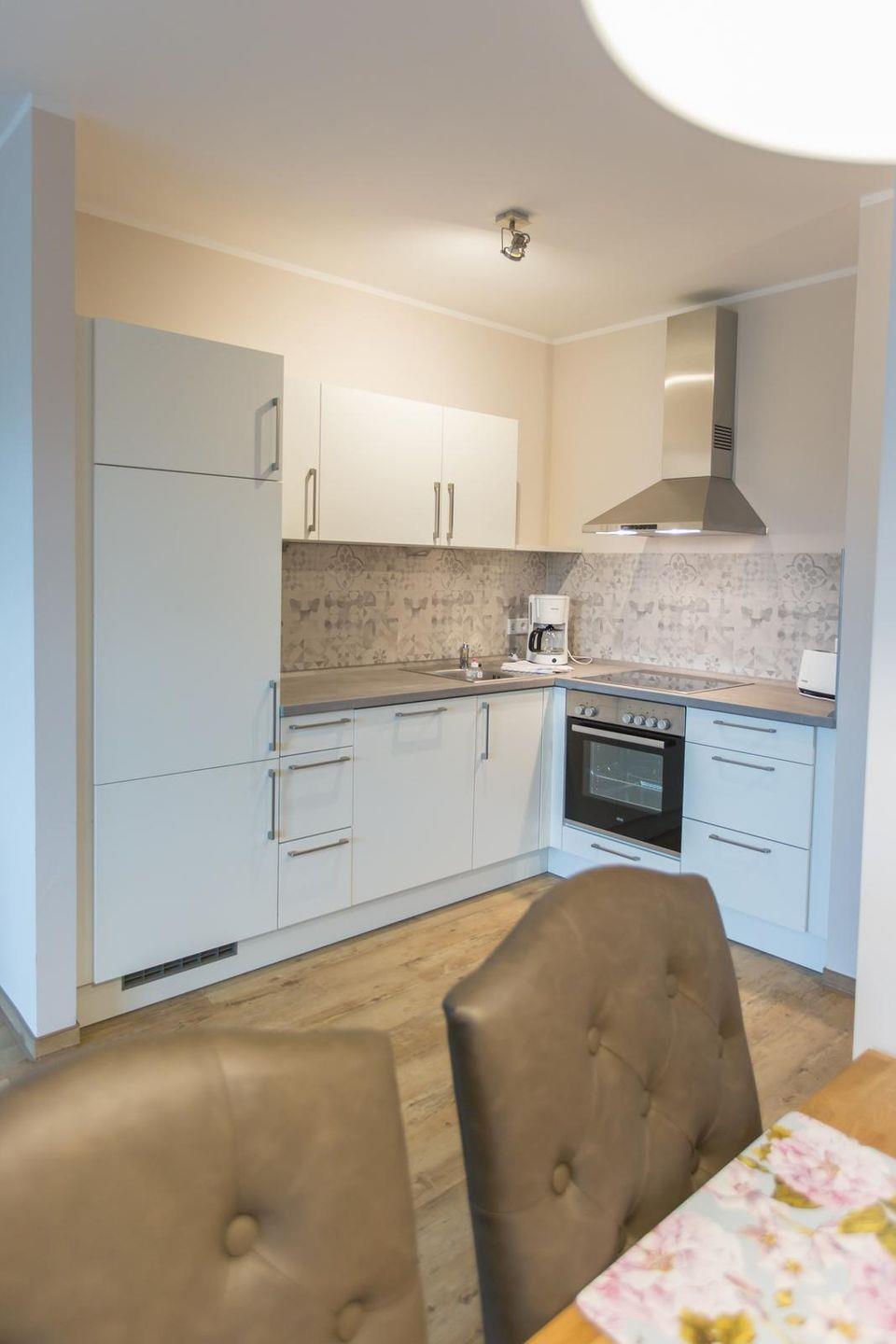 Küchenzeile im Wohnraum mit Ceranfeld, Backofen, Geschirrspüler, Kühlschrank mit Gefrierfach