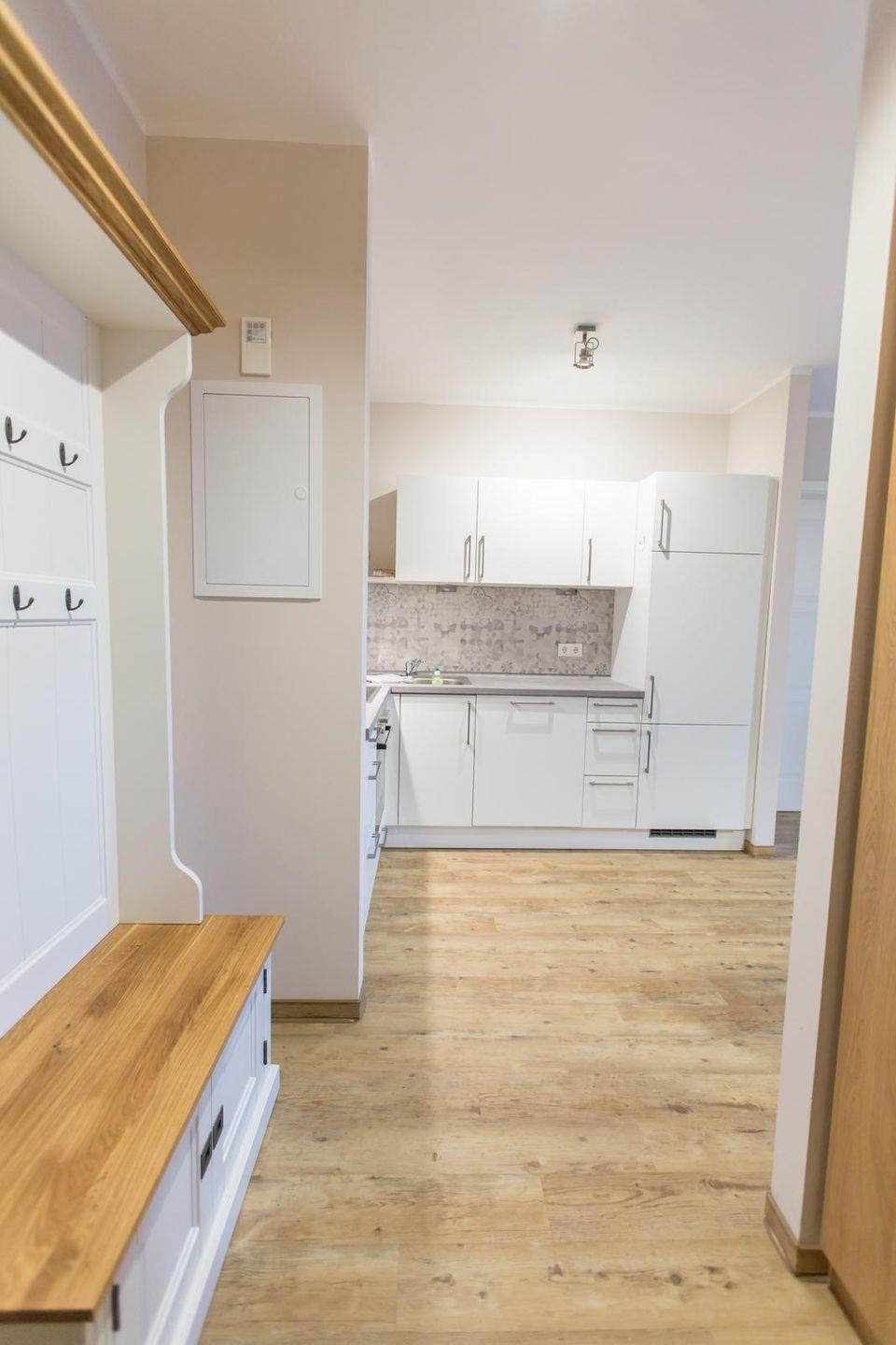Küchenzeile im Wohnraum mit Ceranfeld, Backofen, Geschirrspüler, Kühlschrank mit Gefrierfach