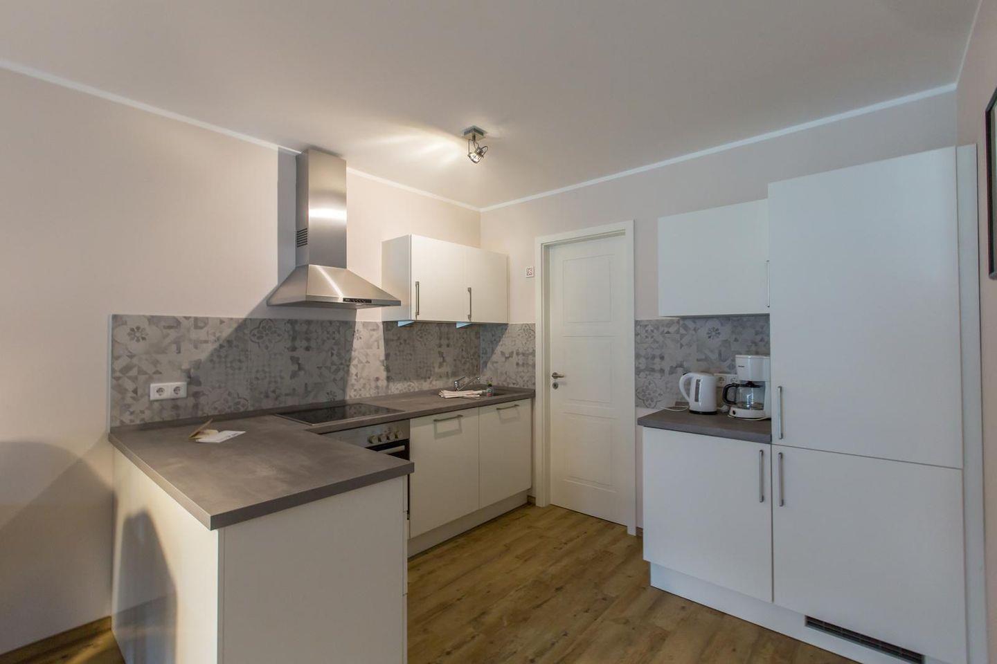 Küchenzeile im Wohnraum mit Ceranfeld, Backofen, Geschirrspüler, Kühlschrank mit Gefrierfach