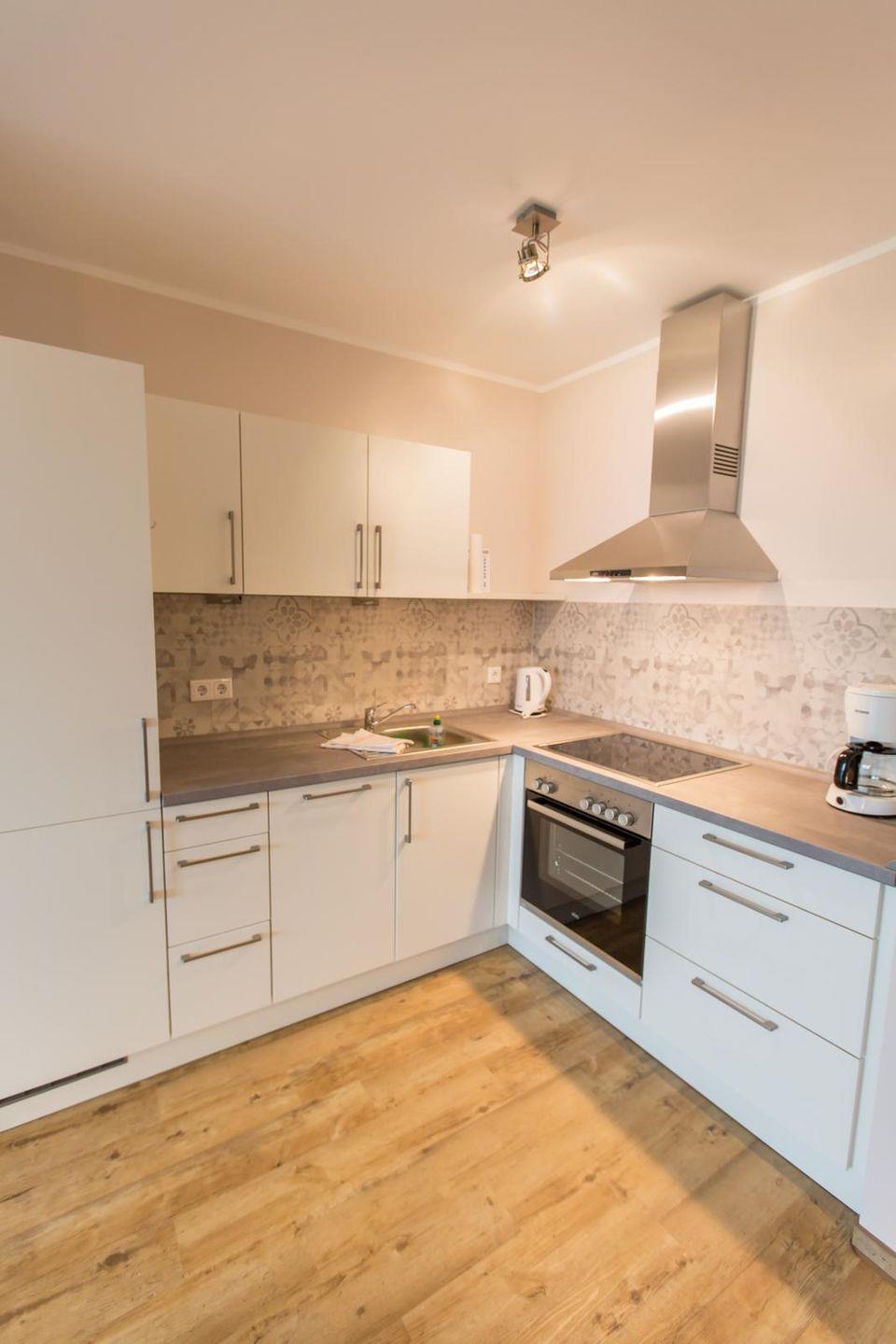 Küchenzeile im Wohnraum mit Ceranfeld, Backofen, Geschirrspüler, Kühlschrank mit Gefrierfach