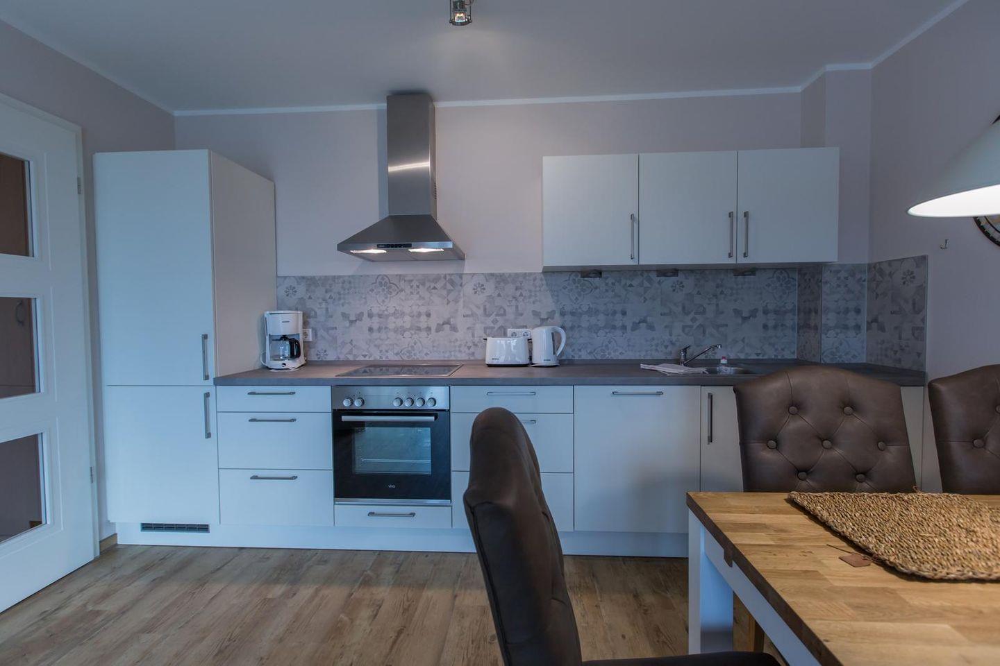 Küchenzeile im Wohnraum mit Ceranfeld, Backofen, Geschirrspüler, Kühlschrank mit Gefrierfach