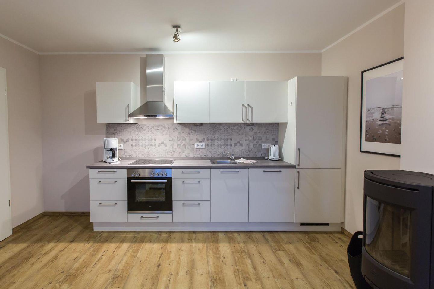 Küchenzeile im Wohnraum mit Ceranfeld, Backofen, Geschirrspüler, Kühlschrank mit Gefrierfach