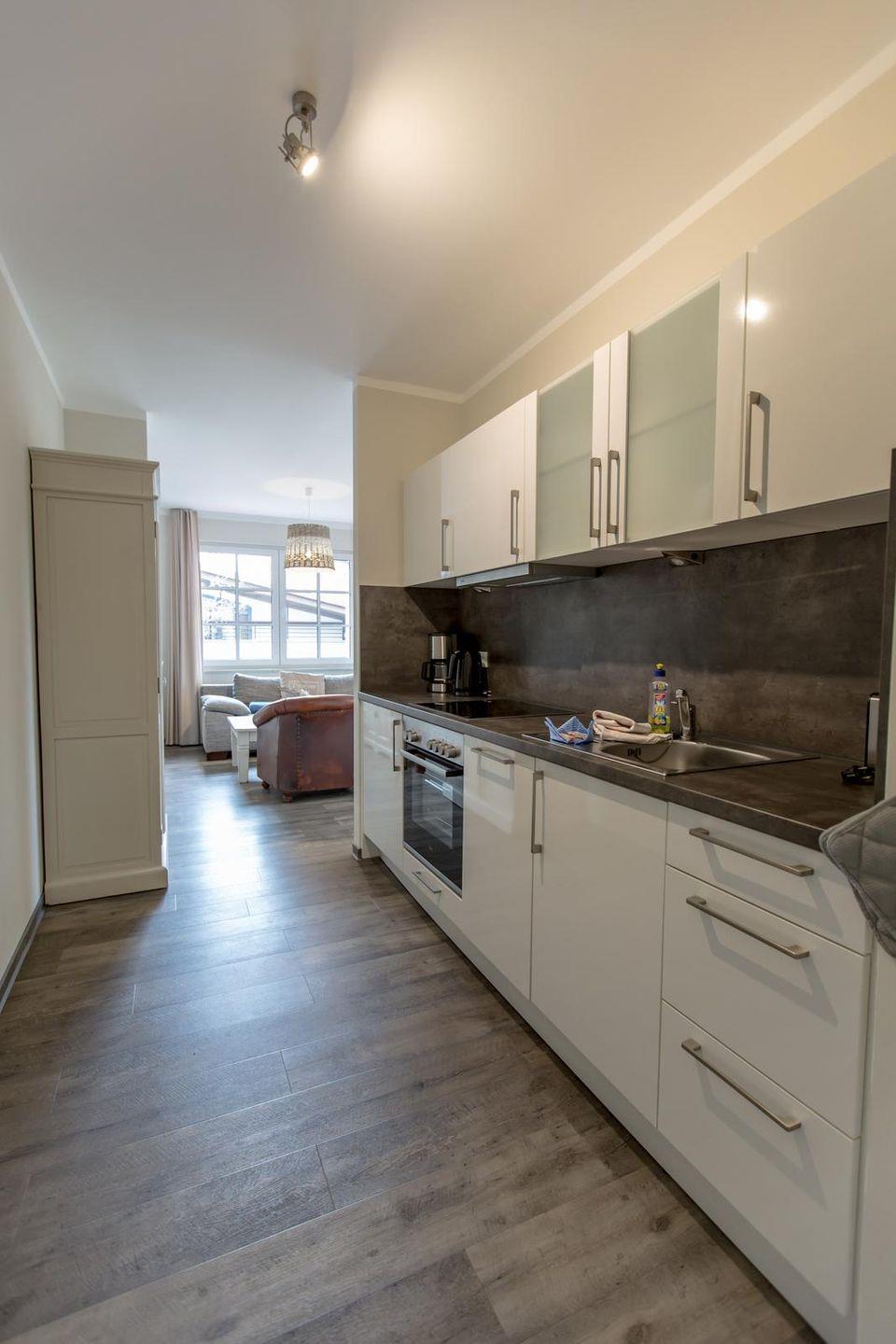 Offene Küchenzeile im Wohnraum mit Ceranfeld, Backofen, Geschirrspüler, Kühlschrank mit Gefrierfach